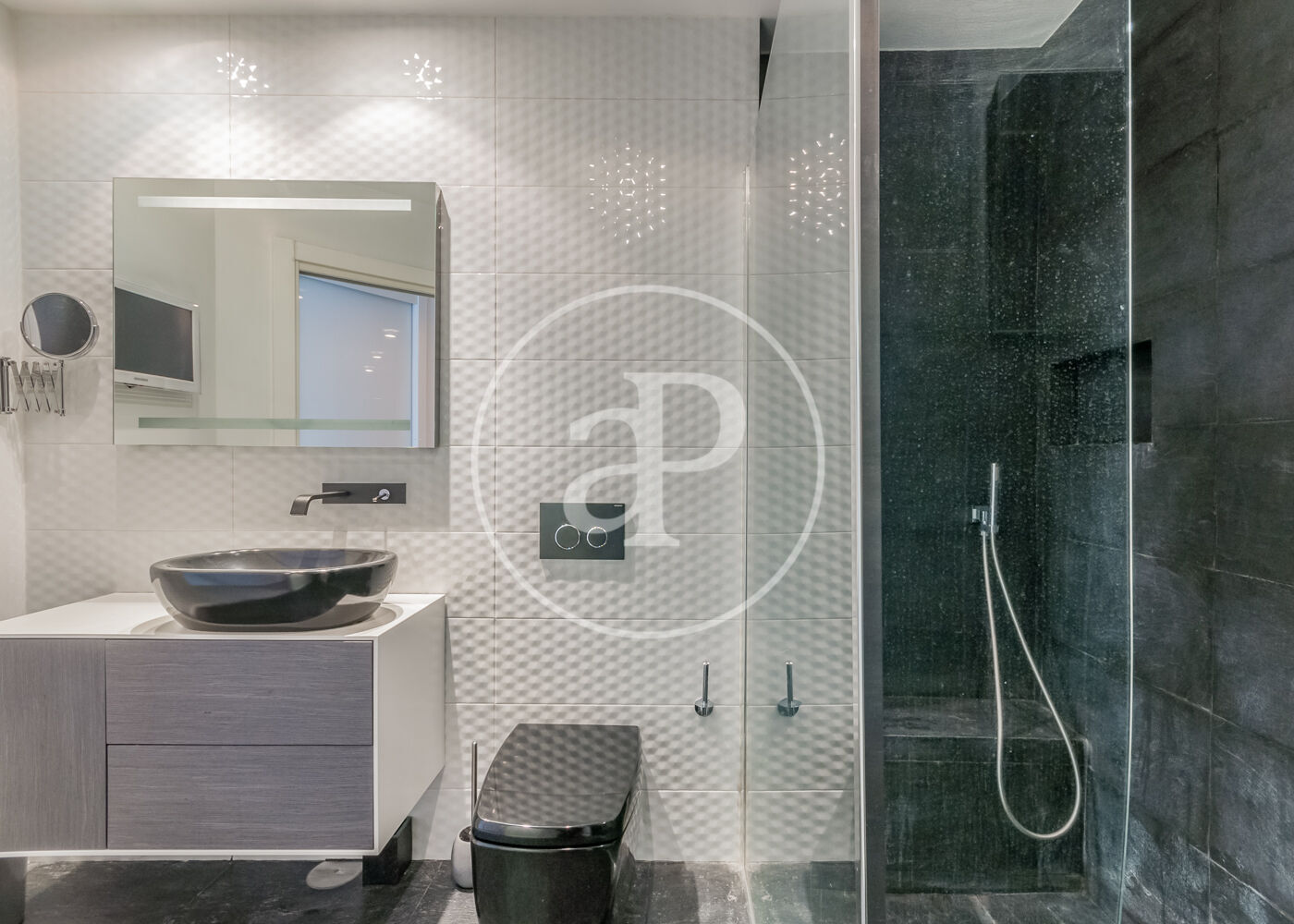 The entire apartment has underfloor heating and air conditioning, as well as a sound system in every room, including the bathroom.