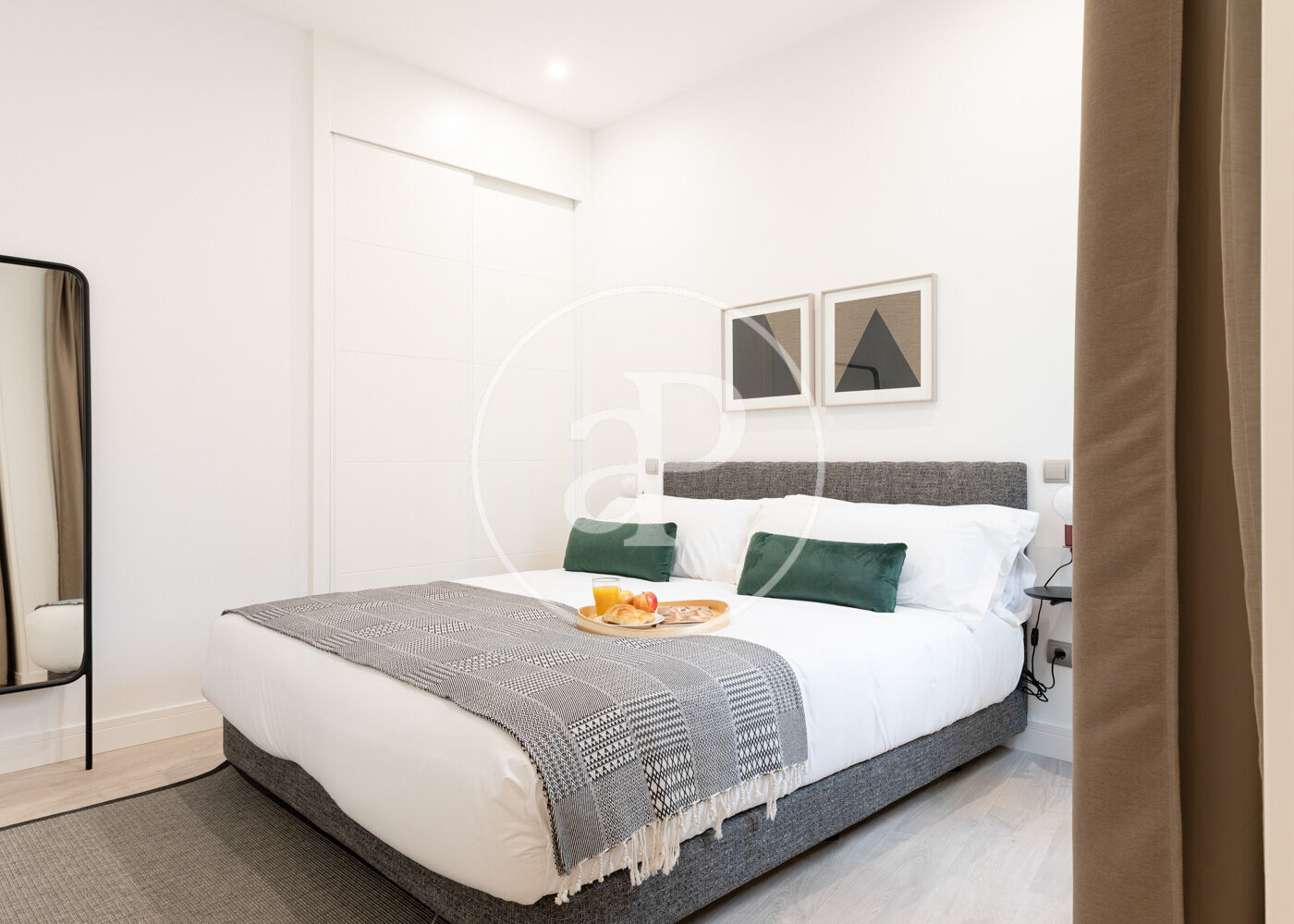 The master bedroom offers a double bed and built-in wardrobes providing ample storage, while the second bedroom has a single bed, ideal as an extra room, office, or guest room. The bathroom features a modern shower and contemporary finishes.