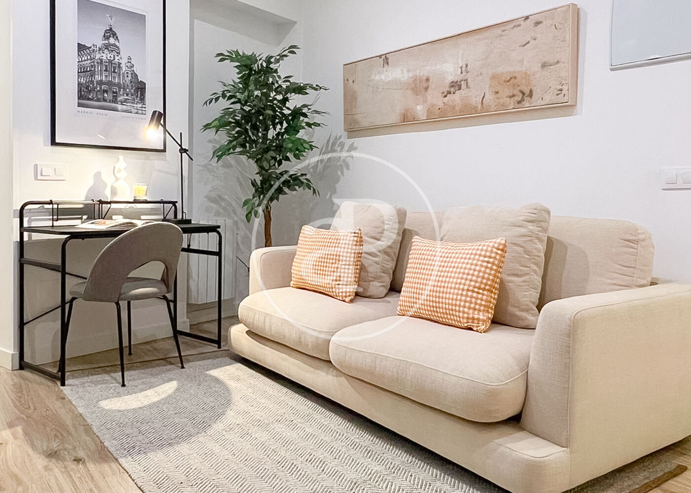 It features a comfortable living room with a designer sofa and a desk ideal for studying or working from home.