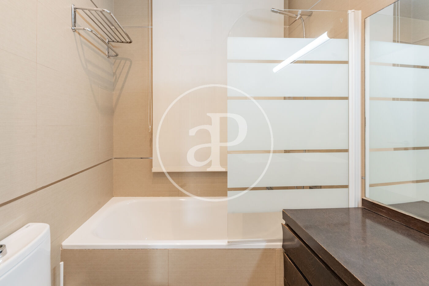 The apartment has two bedrooms (one double and one single) and two full bathrooms (one with a shower and the other with a bathtub). It comes furnished and with a fully equipped kitchen including appliances (oven, washing machine, ceramic hob, refrigerator, and dishwasher). Individual natural gas heating. Its recent renovation provides a modern and welcoming atmosphere.
