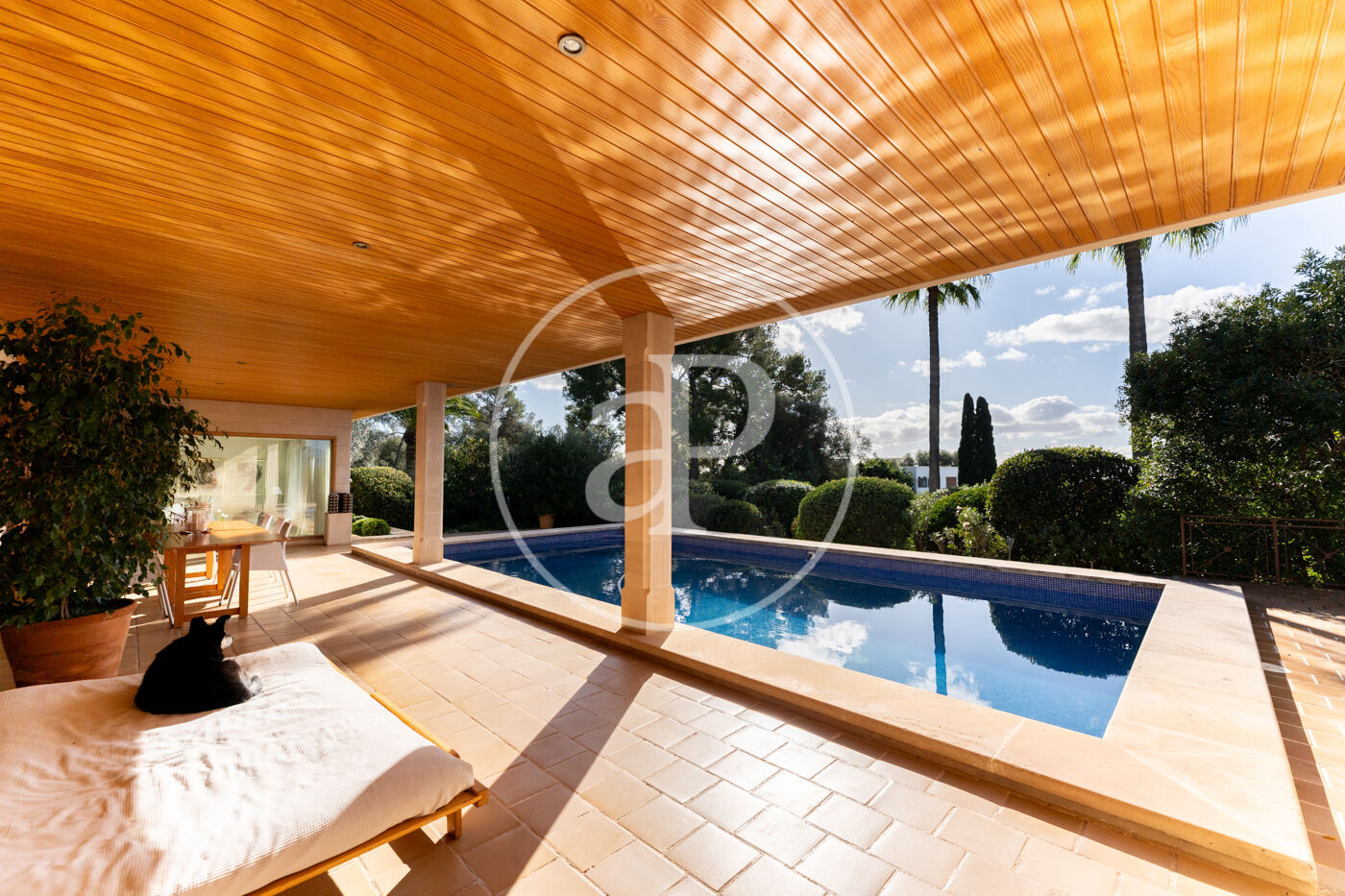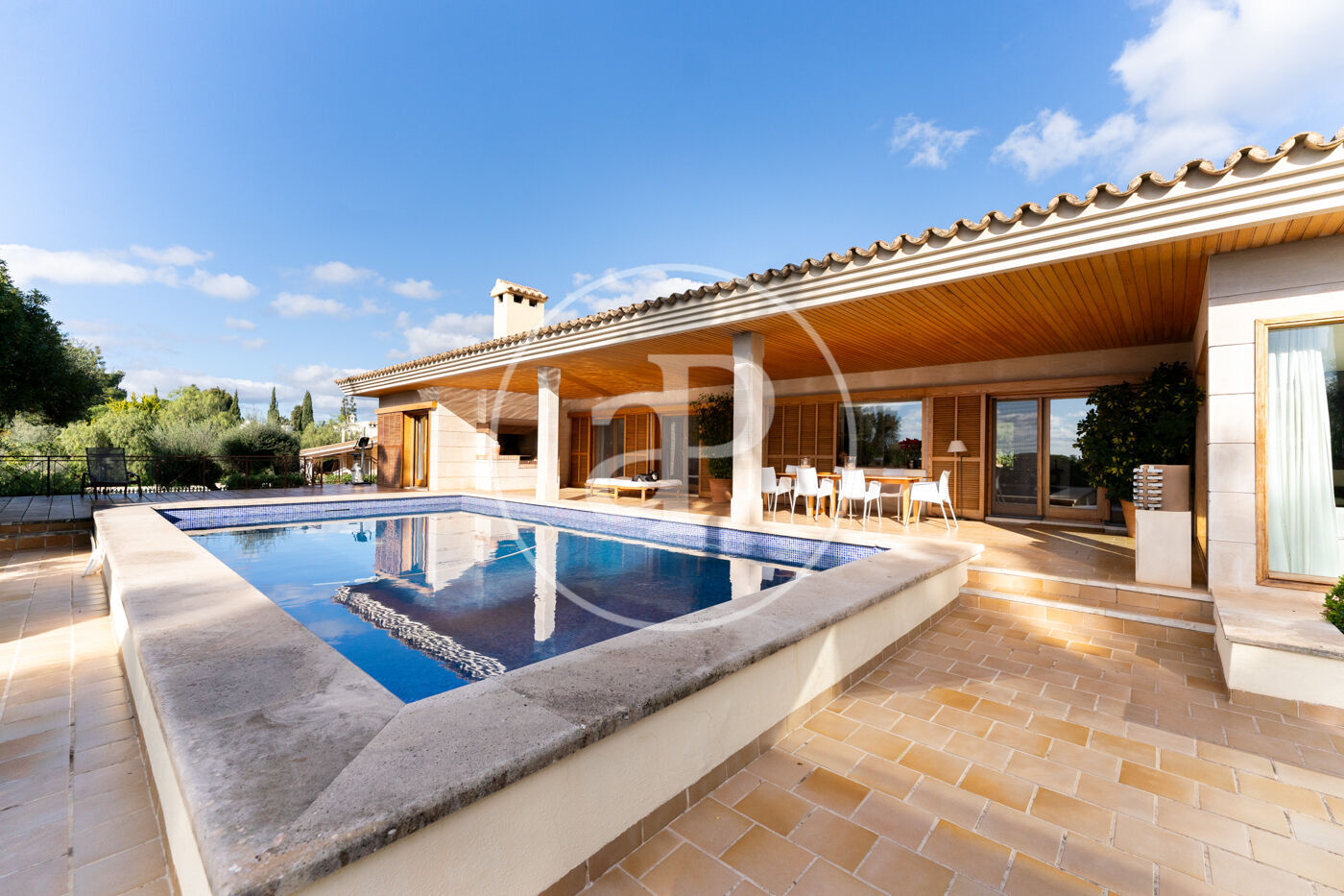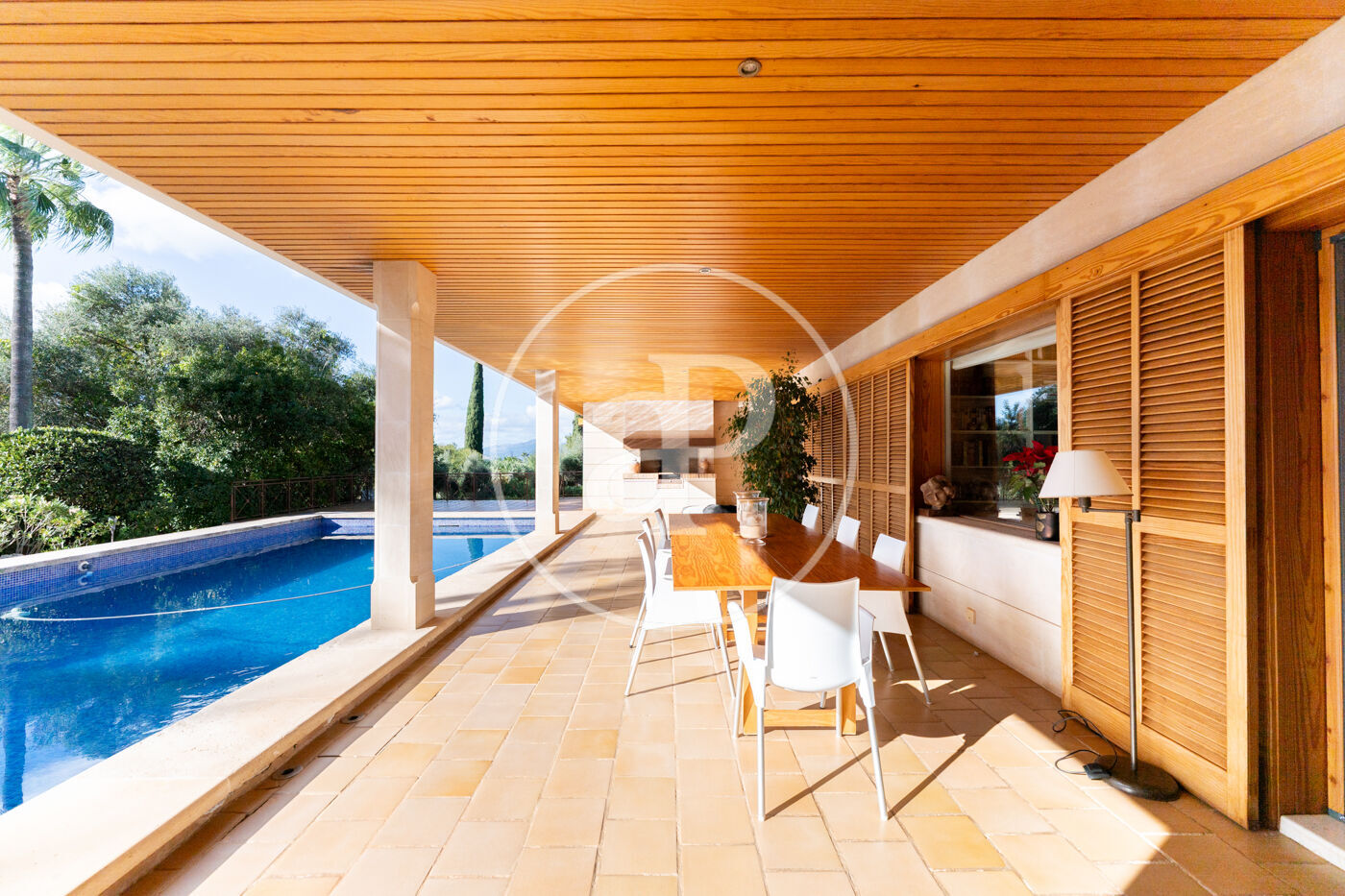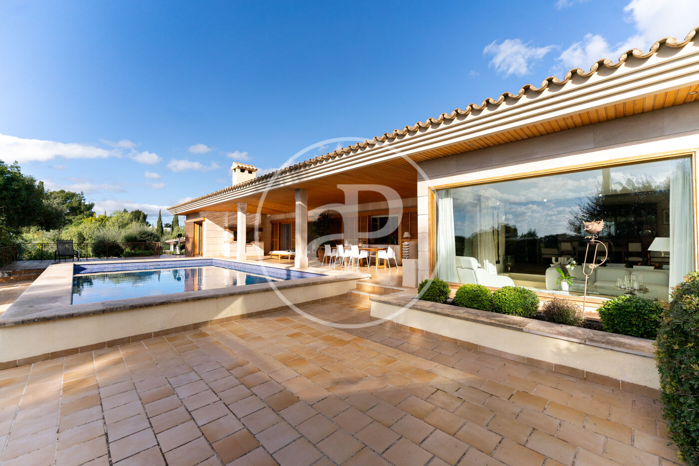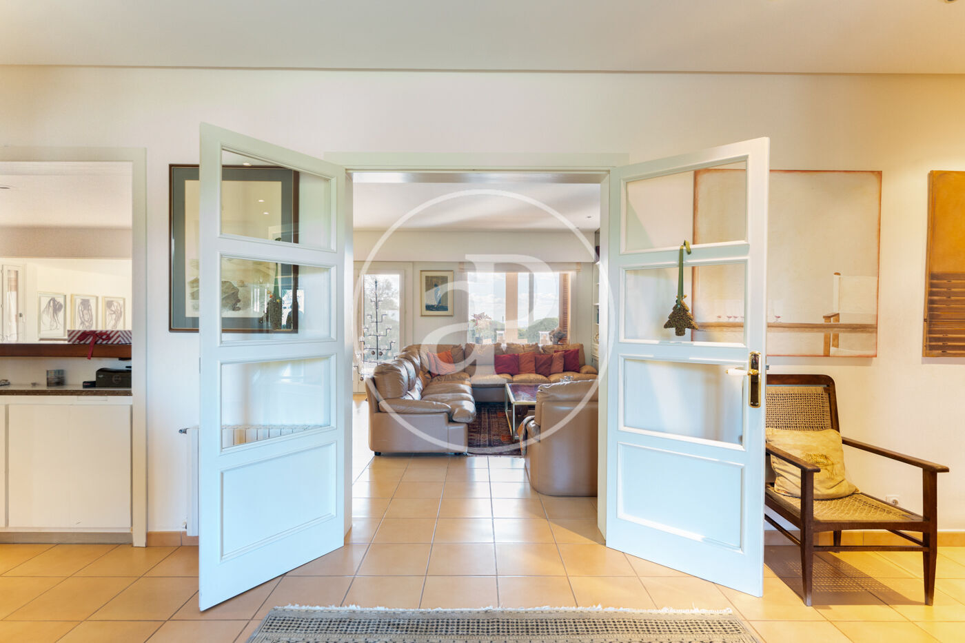 The generous living-dining room with fireplace is complemented by a second lounge for guests and offers direct access to the porch with barbecue, the swimming pool and the expansive outdoor terraces, surrounded by a beautifully maintained garden—ideal for enjoying the Mediterranean lifestyle.