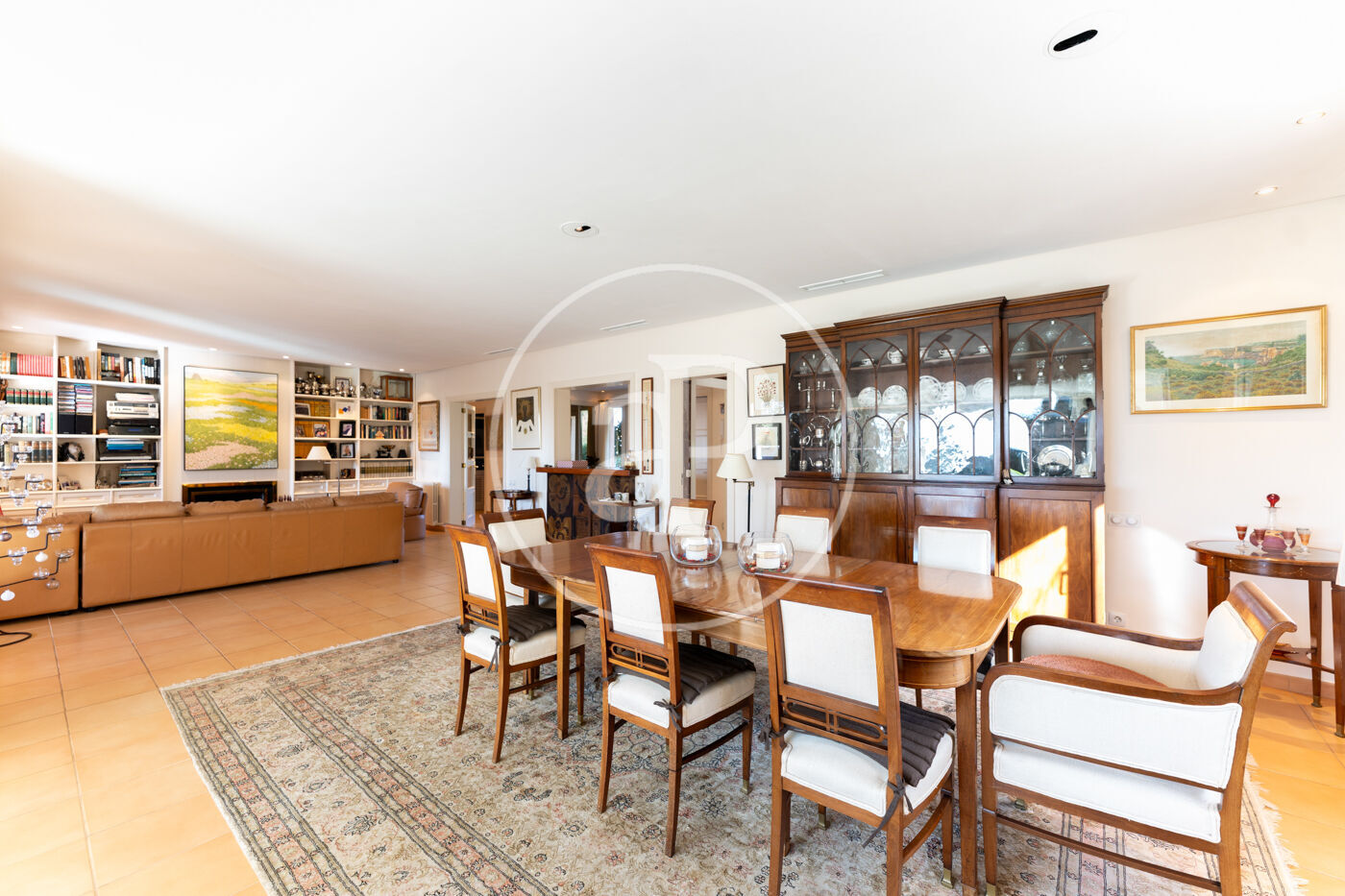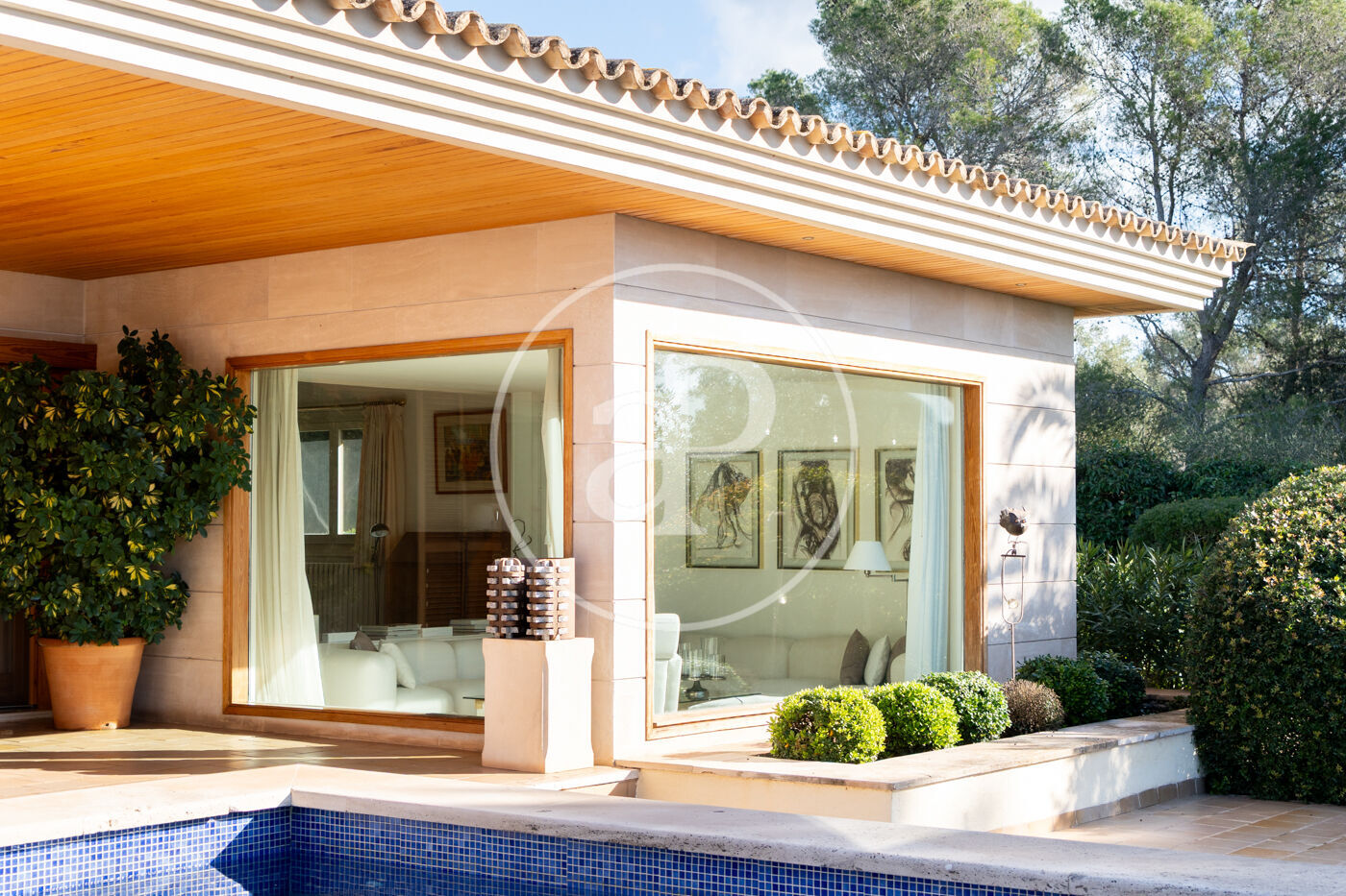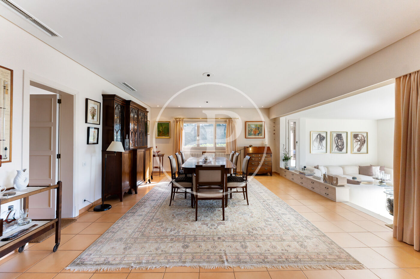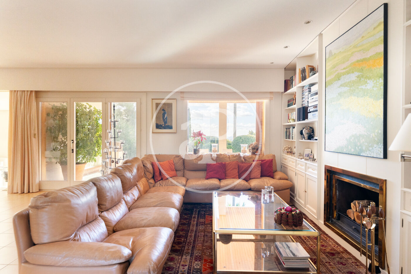 The generous living-dining room with fireplace is complemented by a second lounge for guests and offers direct access to the porch with barbecue, the swimming pool and the expansive outdoor terraces, surrounded by a beautifully maintained garden—ideal for enjoying the Mediterranean lifestyle.