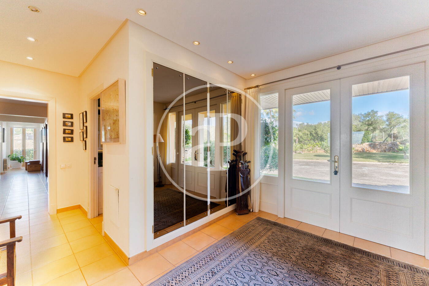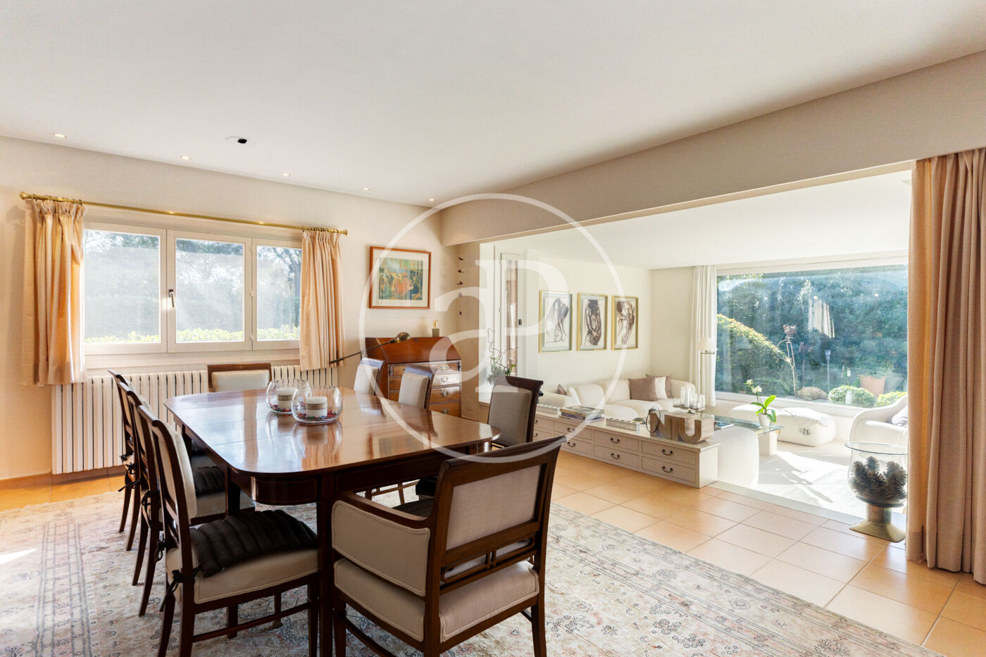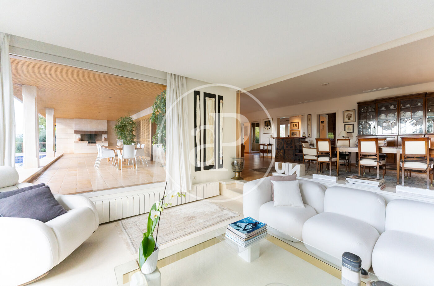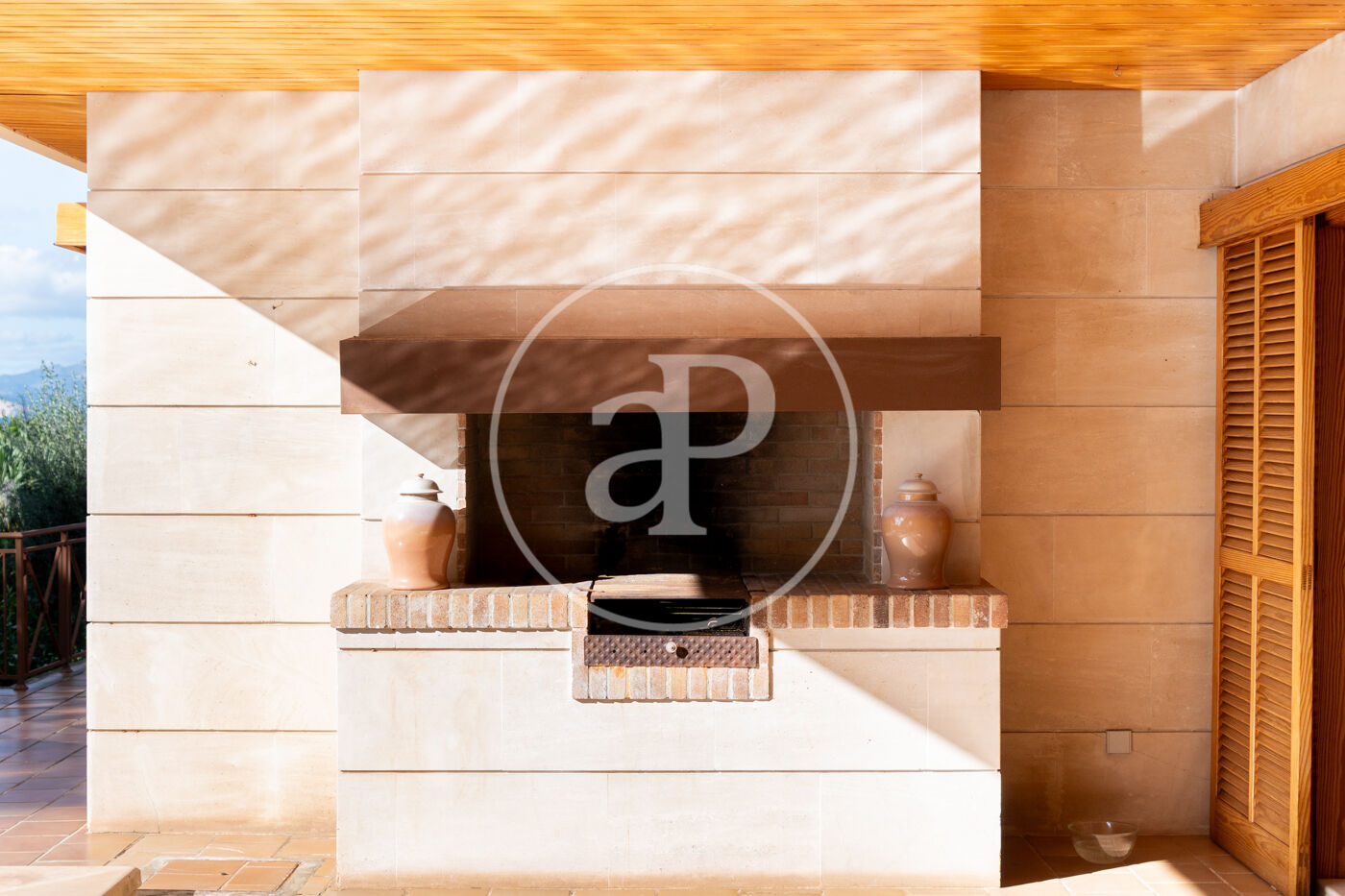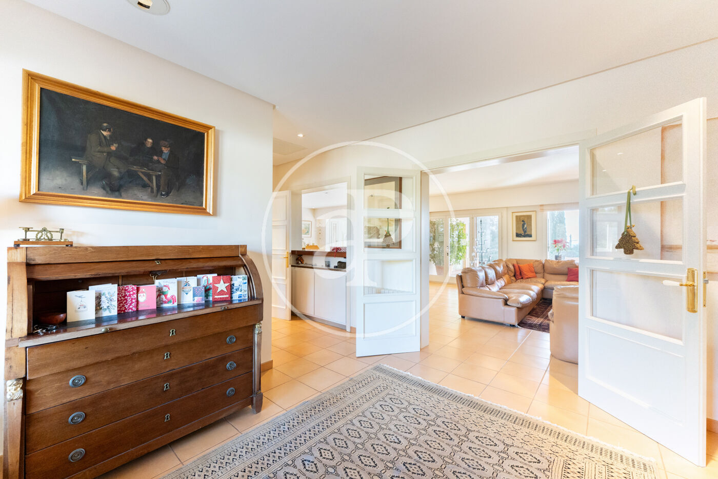 The generous living-dining room with fireplace is complemented by a second lounge for guests and offers direct access to the porch with barbecue, the swimming pool and the expansive outdoor terraces, surrounded by a beautifully maintained garden—ideal for enjoying the Mediterranean lifestyle.