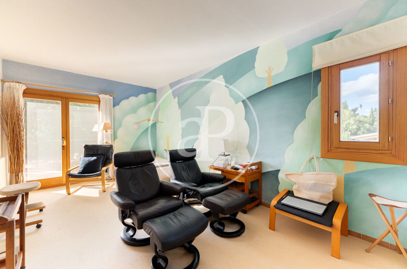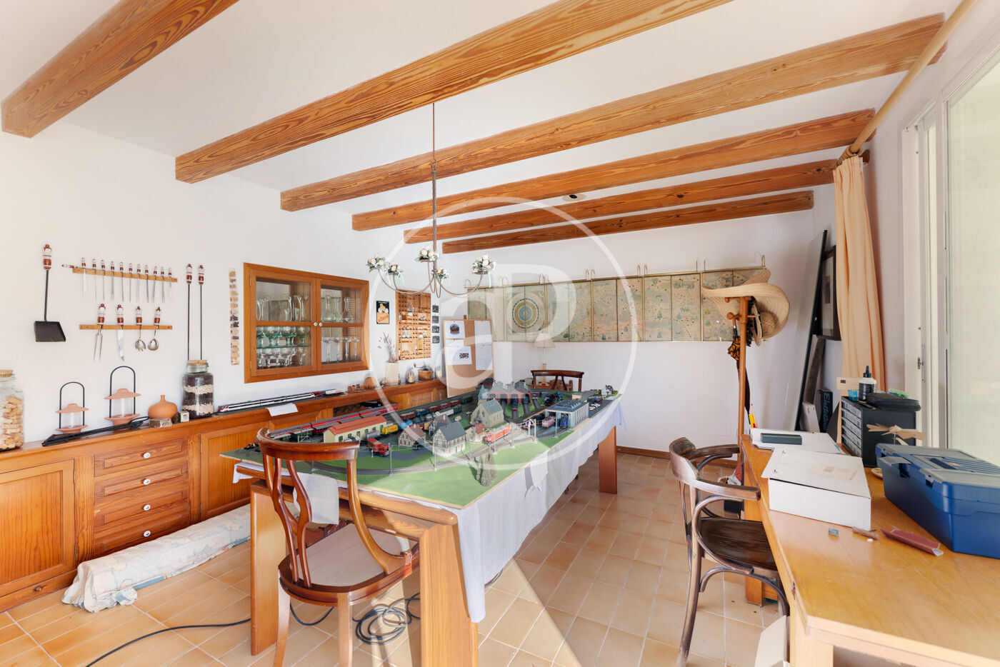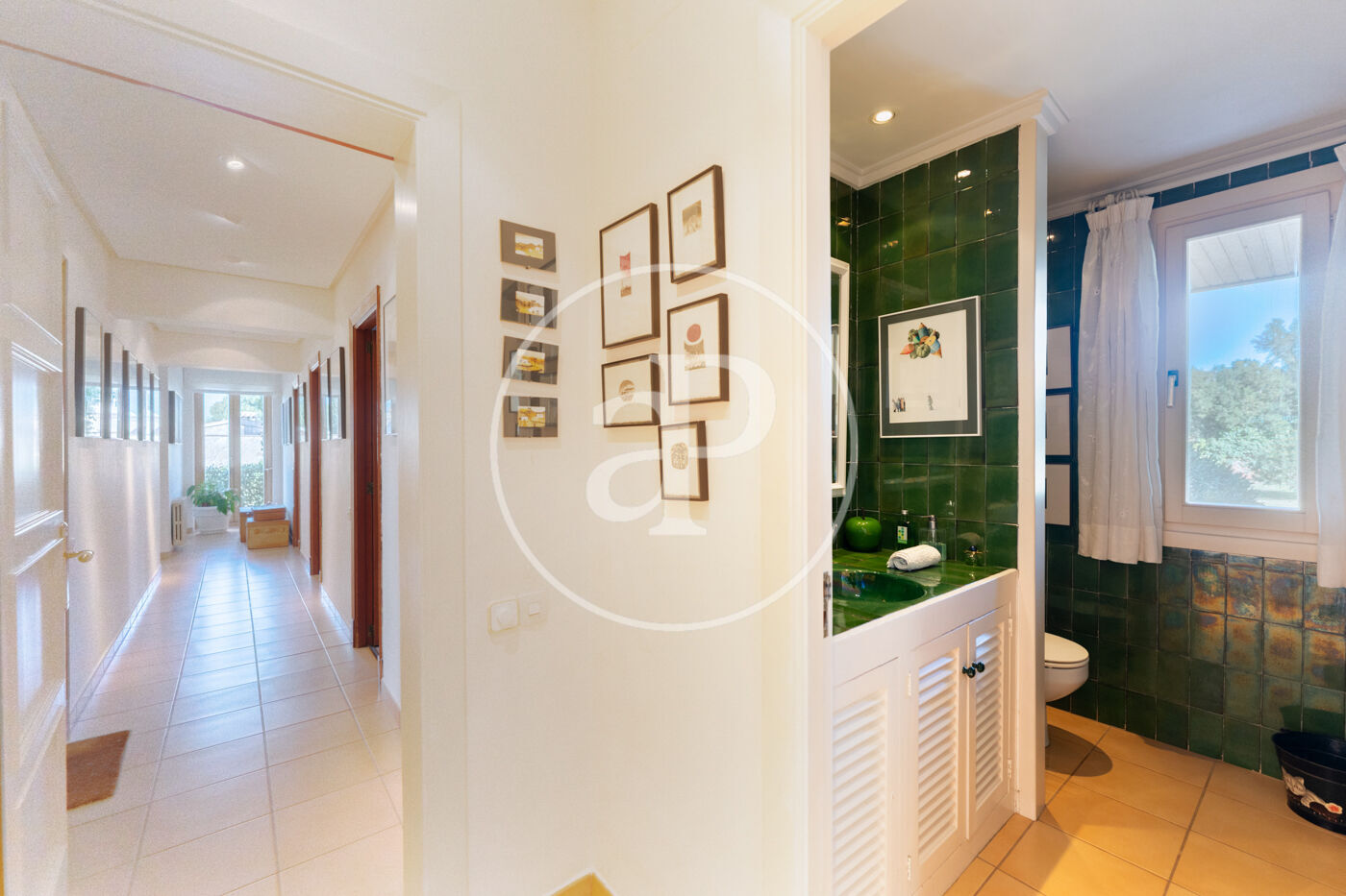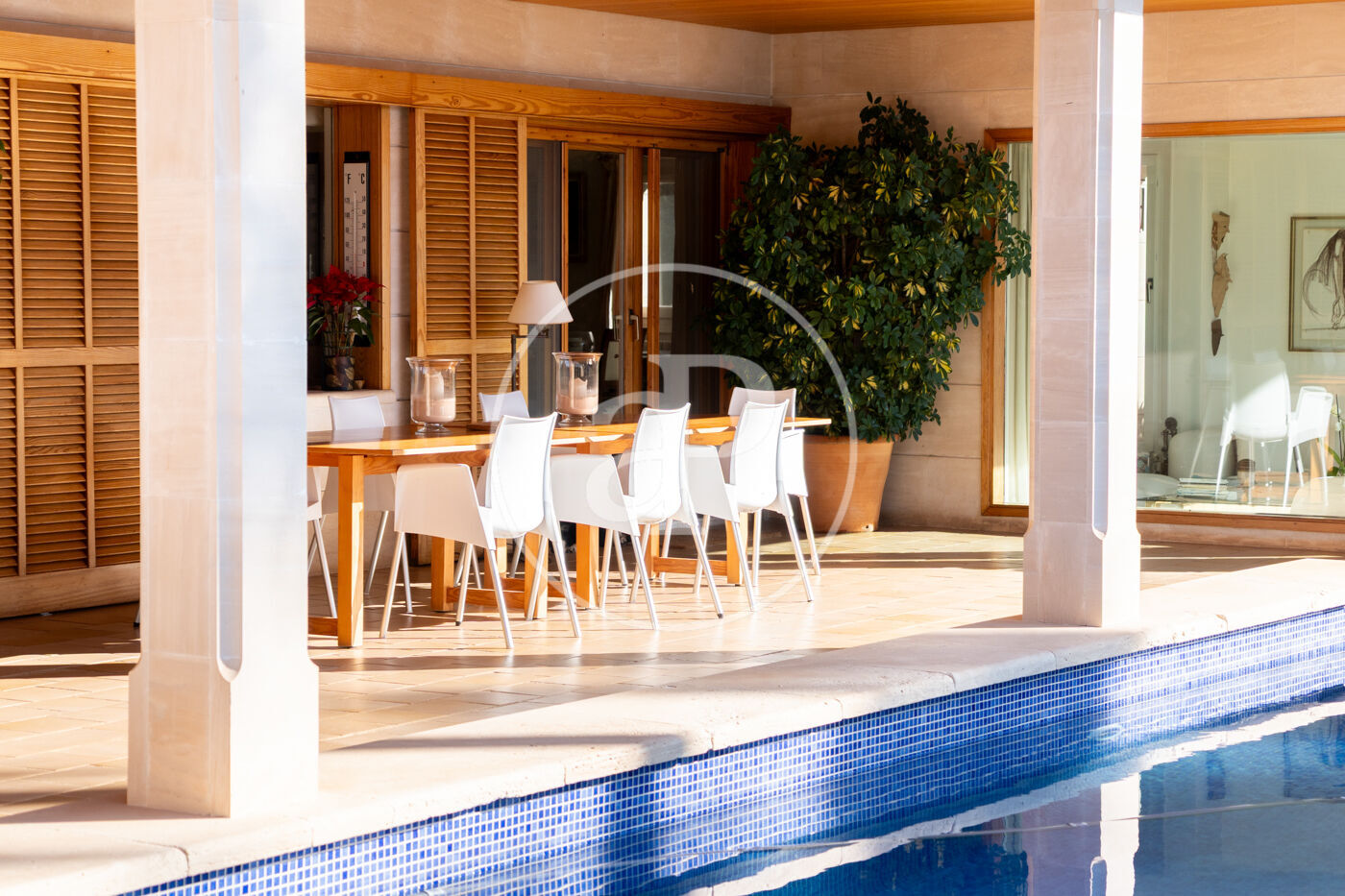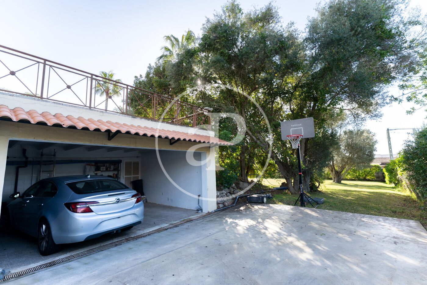 The generous living-dining room with fireplace is complemented by a second lounge for guests and offers direct access to the porch with barbecue, the swimming pool and the expansive outdoor terraces, surrounded by a beautifully maintained garden—ideal for enjoying the Mediterranean lifestyle.