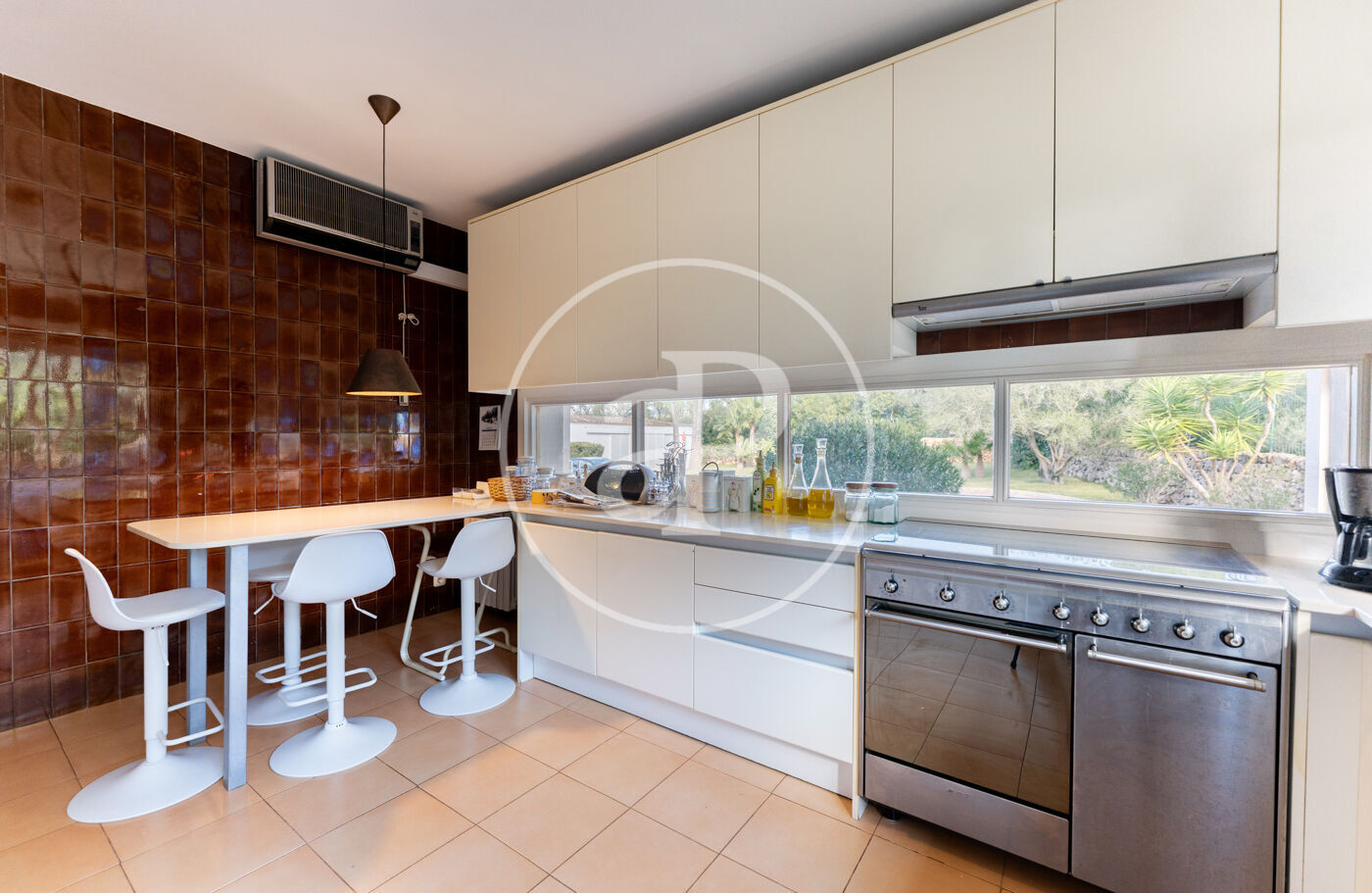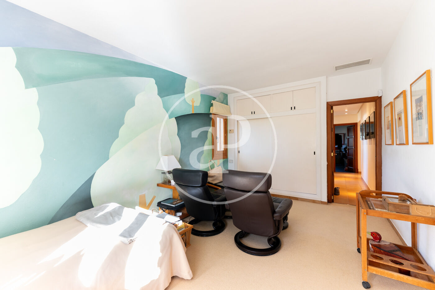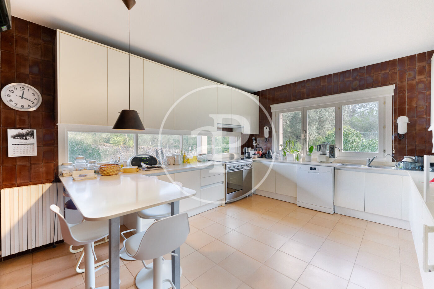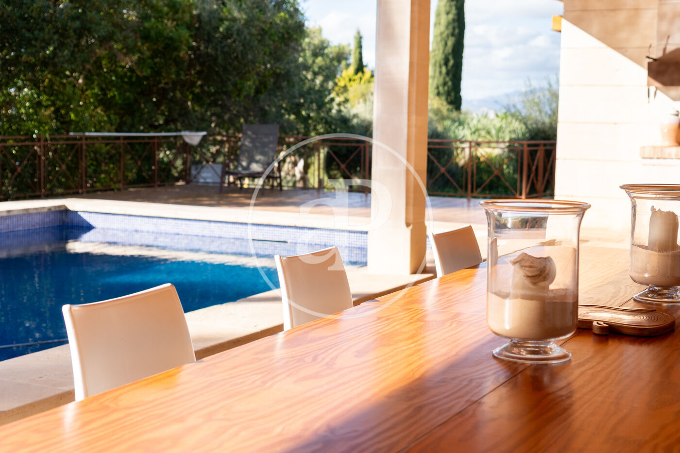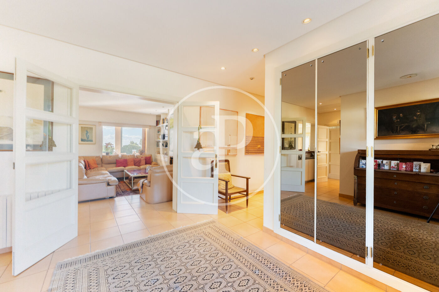 The generous living-dining room with fireplace is complemented by a second lounge for guests and offers direct access to the porch with barbecue, the swimming pool and the expansive outdoor terraces, surrounded by a beautifully maintained garden—ideal for enjoying the Mediterranean lifestyle.