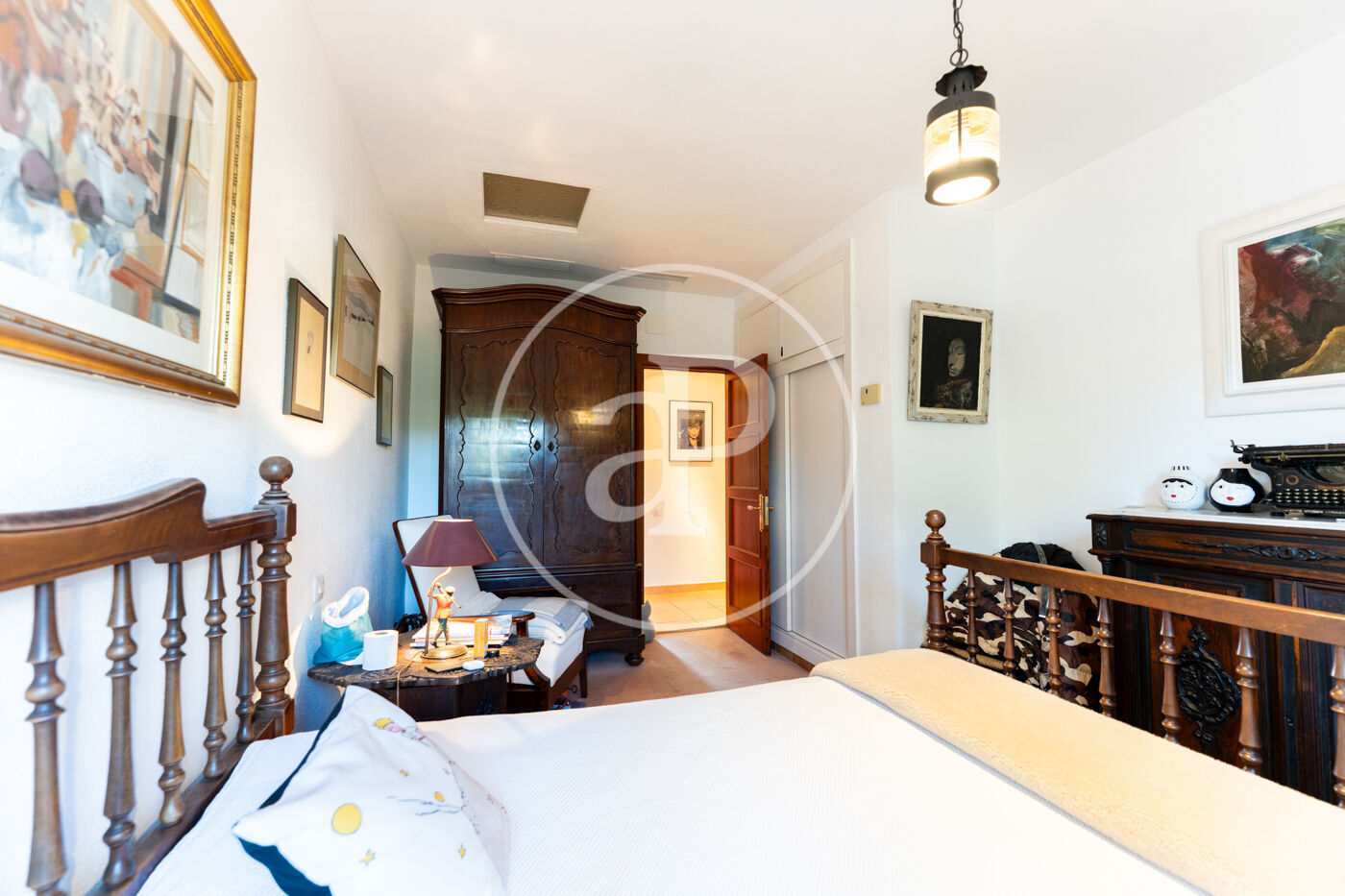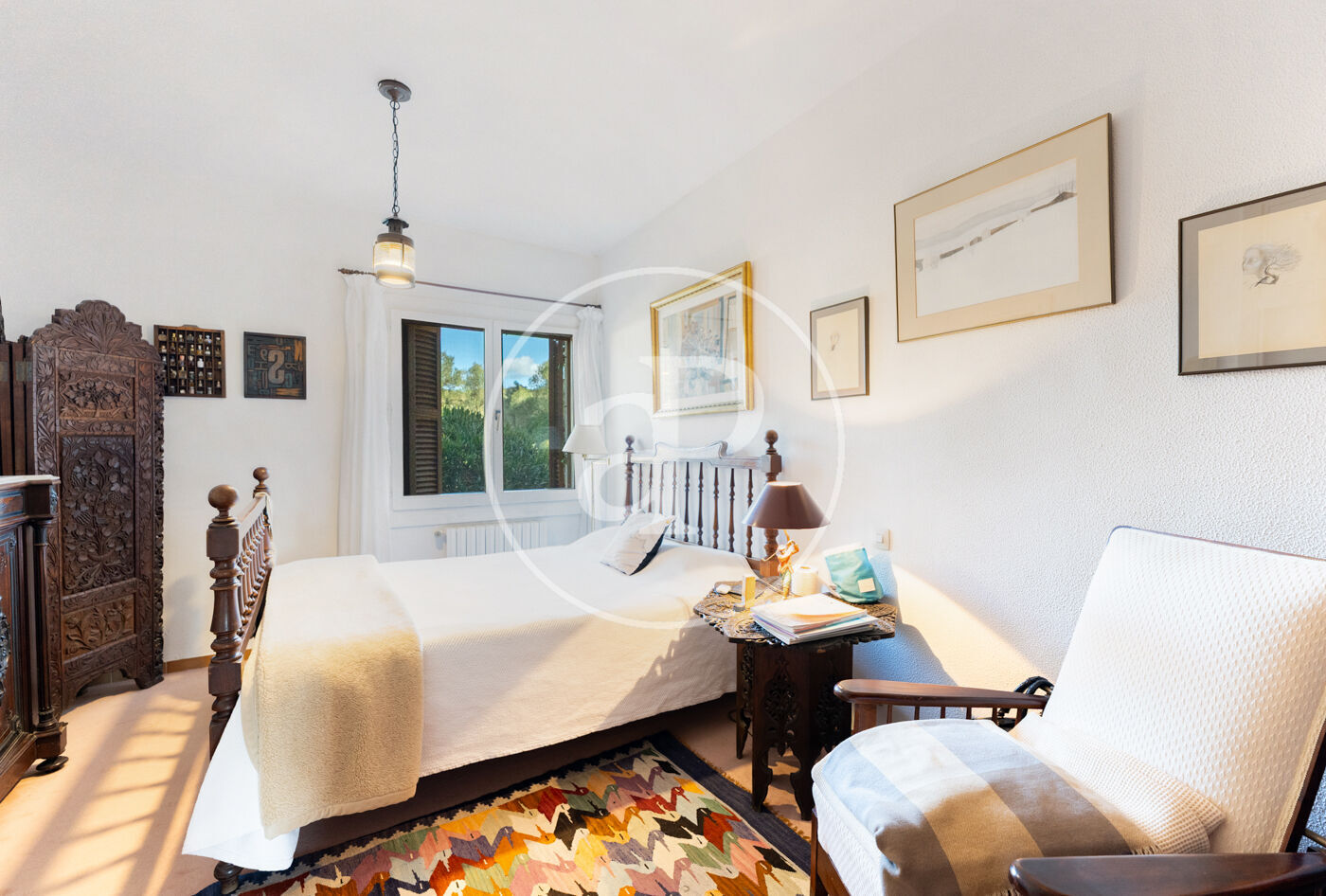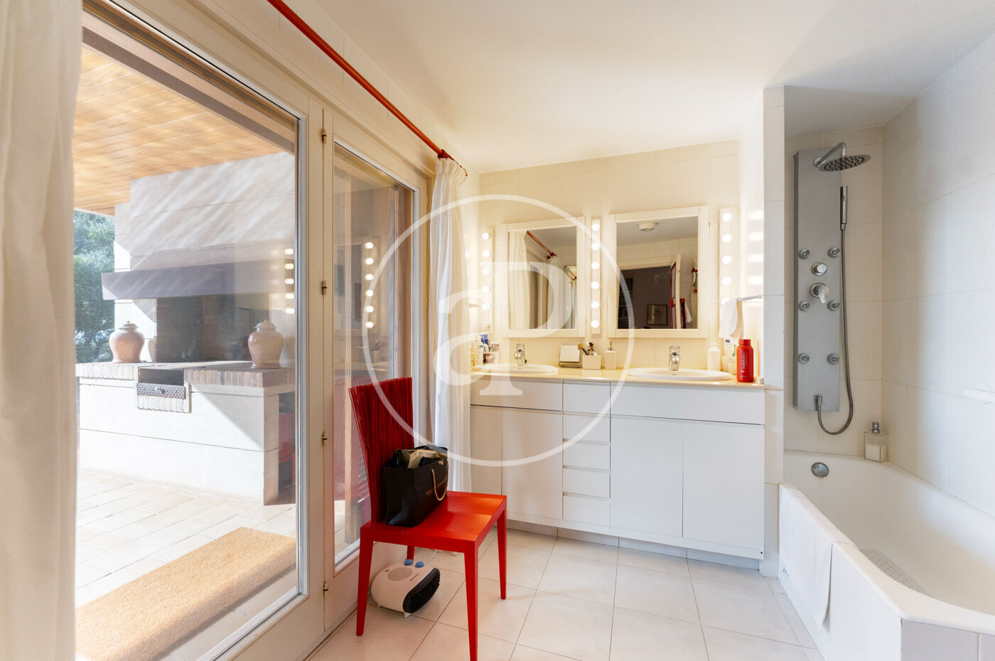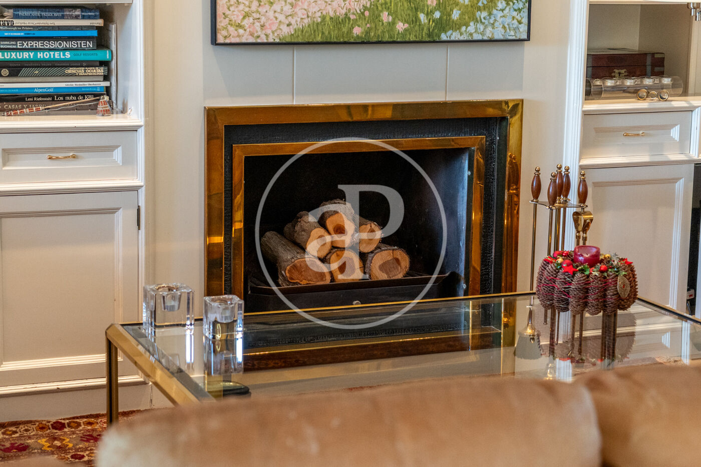 The generous living-dining room with fireplace is complemented by a second lounge for guests and offers direct access to the porch with barbecue, the swimming pool and the expansive outdoor terraces, surrounded by a beautifully maintained garden—ideal for enjoying the Mediterranean lifestyle.