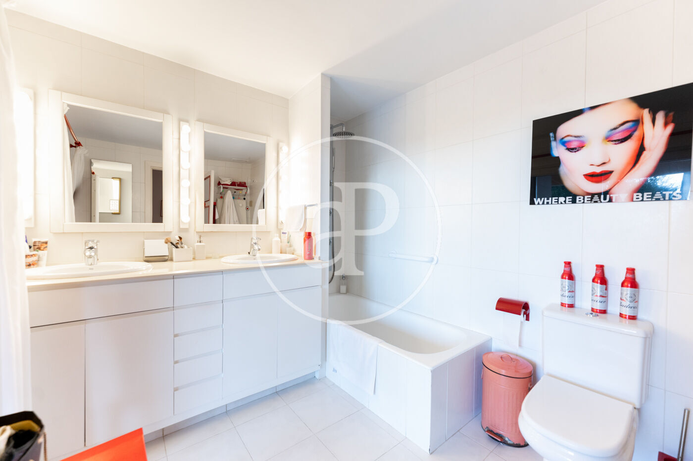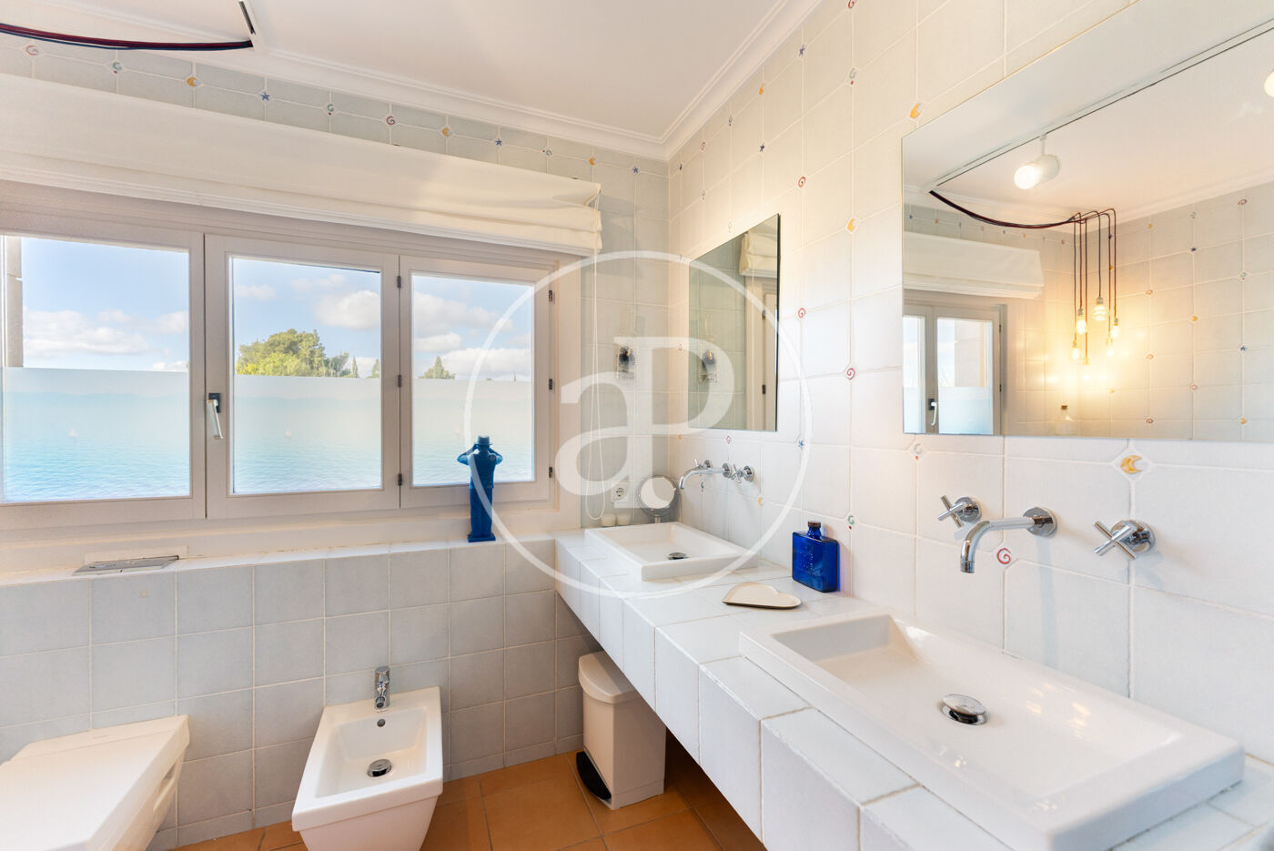The sleeping area comprises four double bedrooms, all with built-in wardrobes, and three full bathrooms. The master bedroom features an en-suite bathroom and direct access to the terraces. The property is equipped with ducted central air conditioning and radiator heating throughout, with double-glazed doors and windows ensuring year-round comfort.