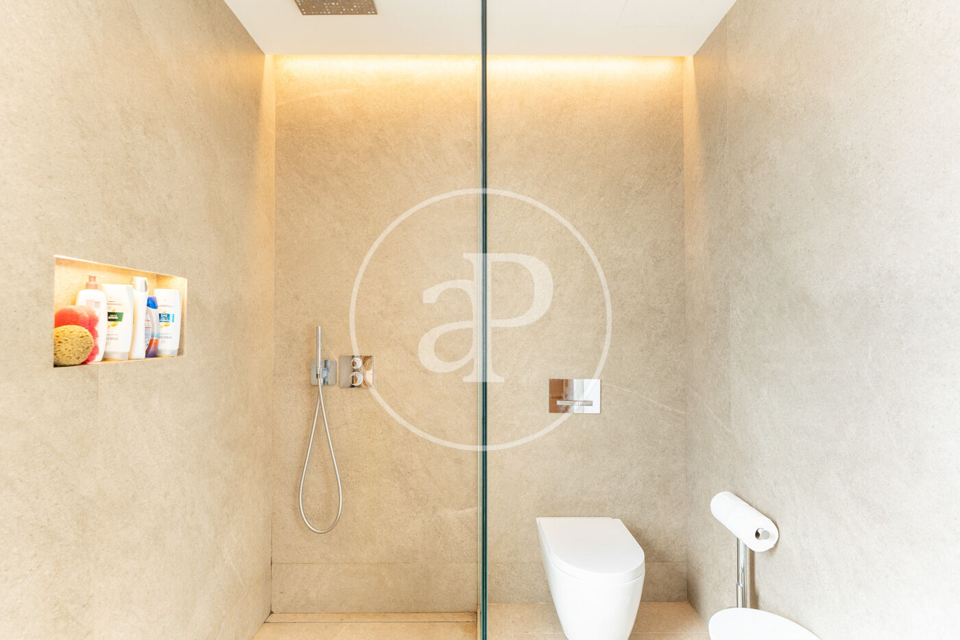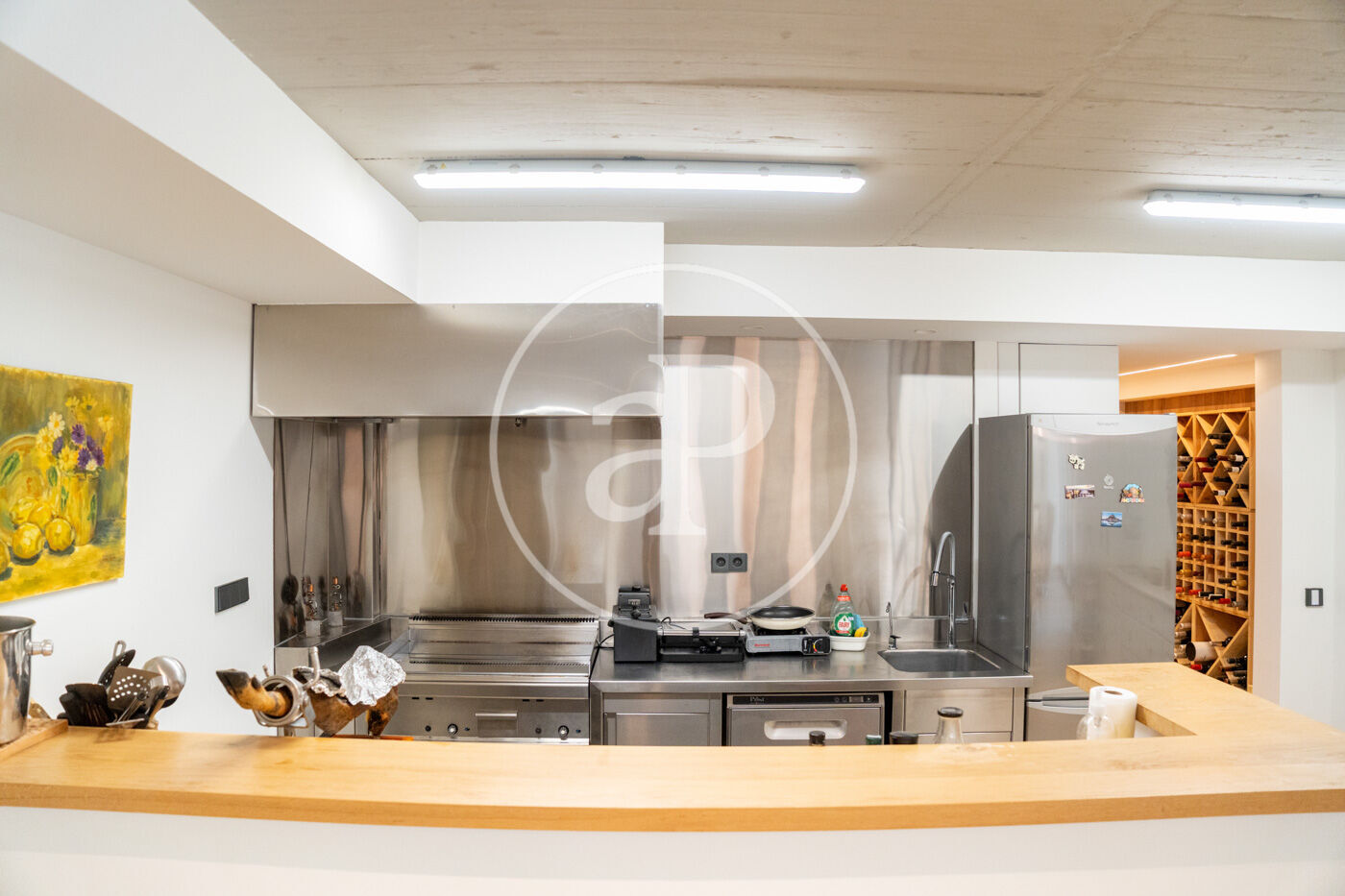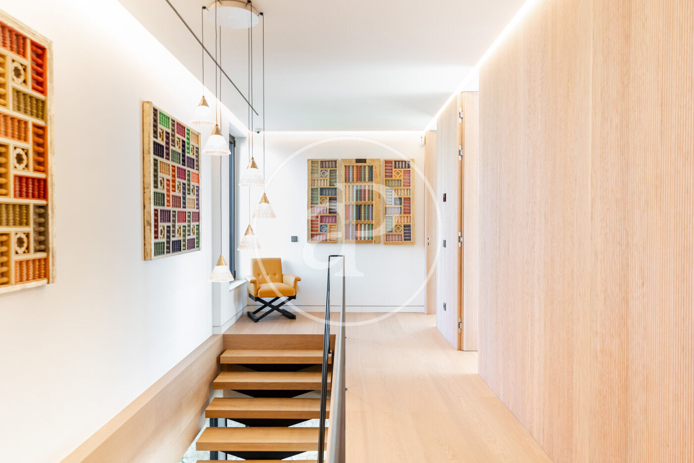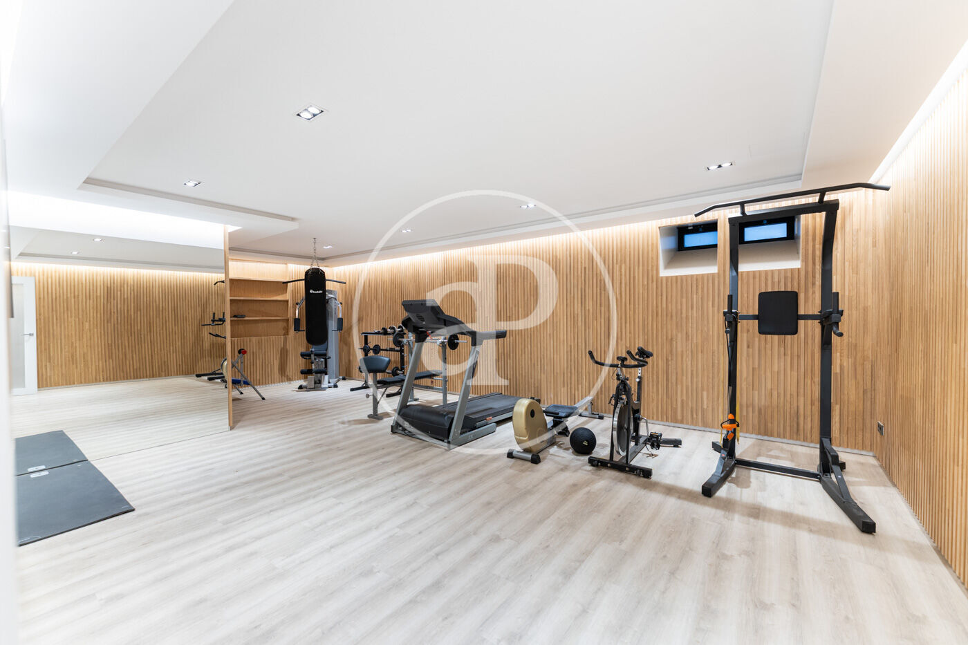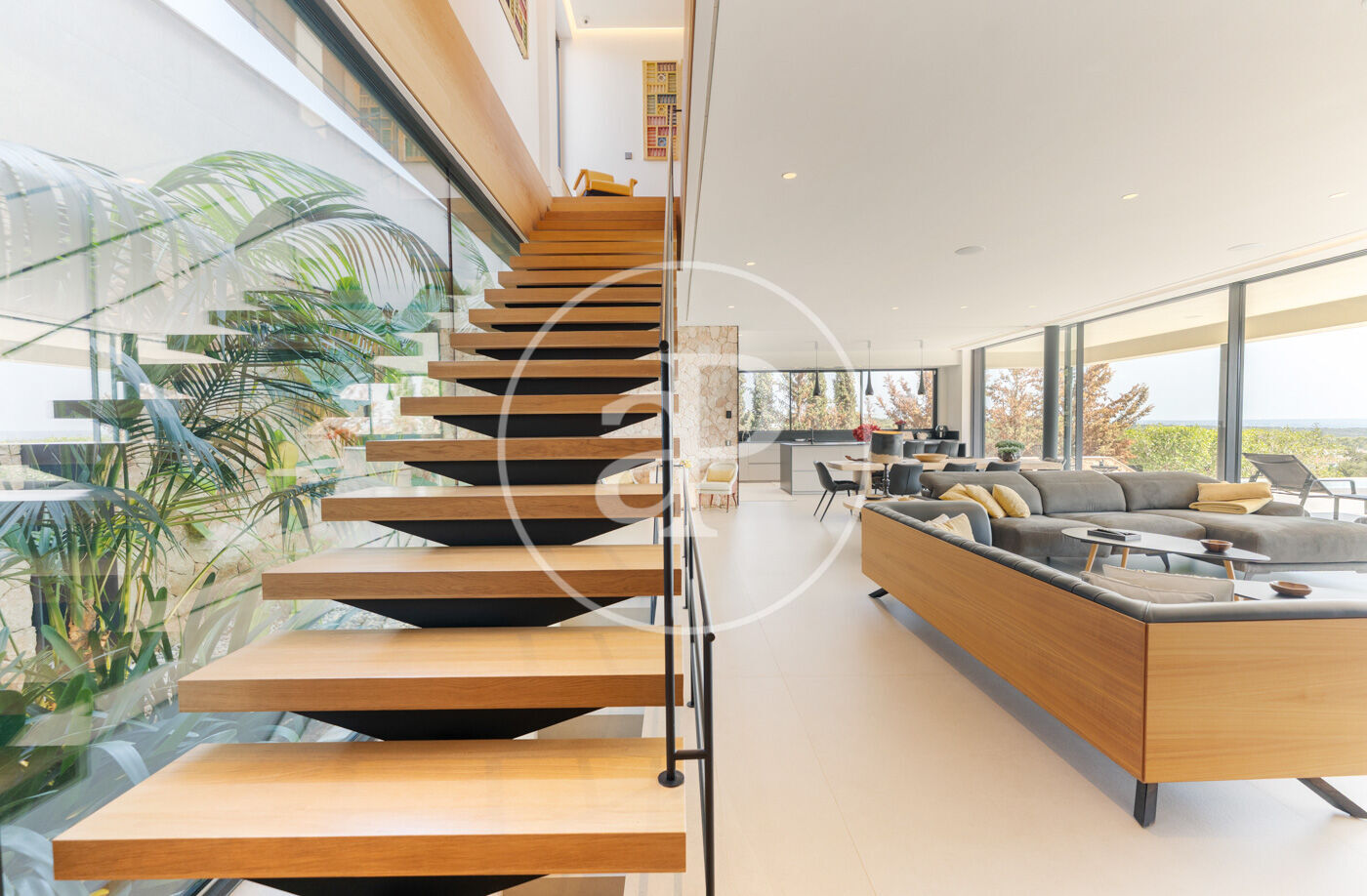 Among its exclusive features are underfloor heating for optimal comfort in winter, motorized blinds, state-of-the-art home automation, and a fully equipped kitchen. On the lower floor, a private gym and an elegant dining room with industrial kitchen turn every gathering into a unique experience.