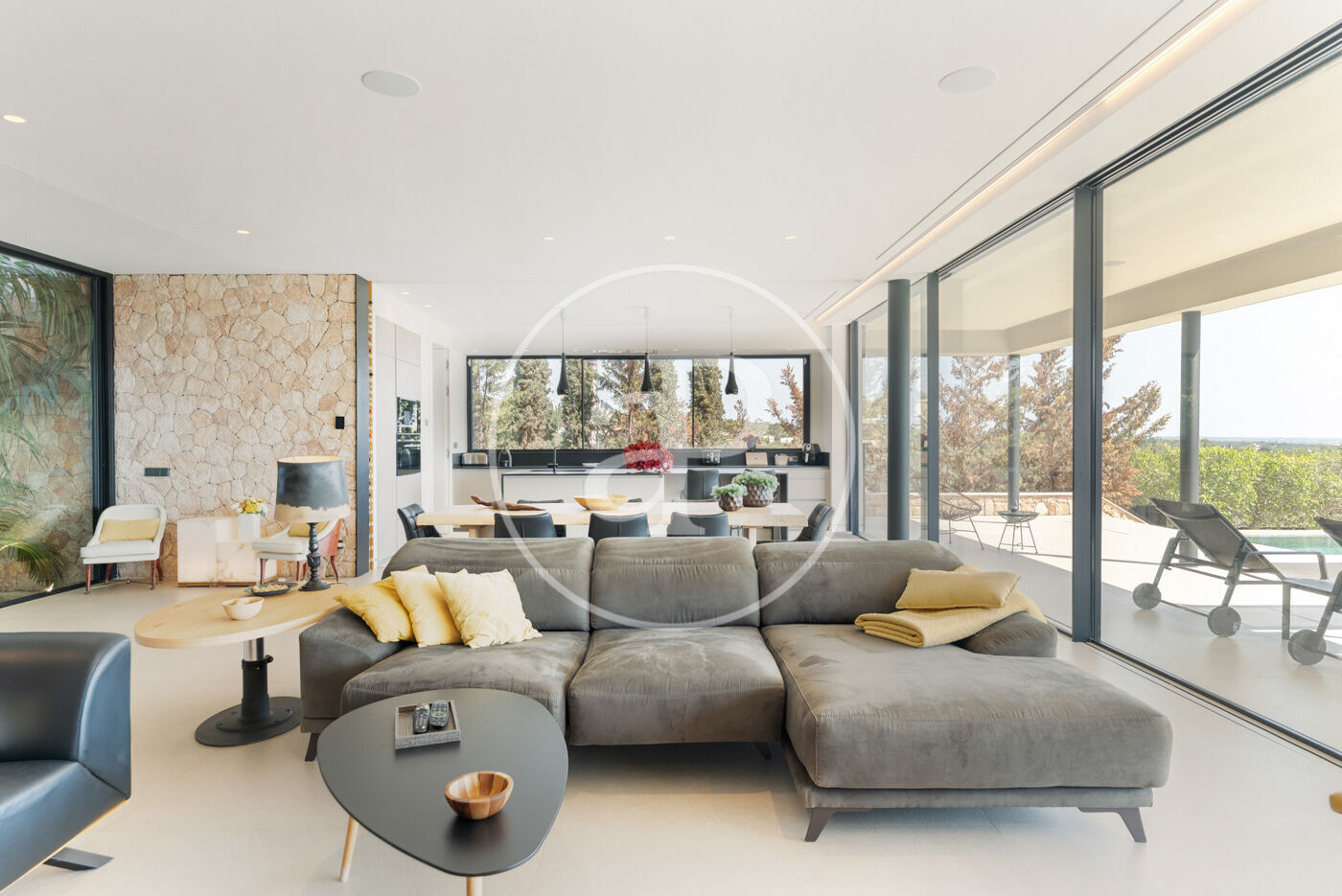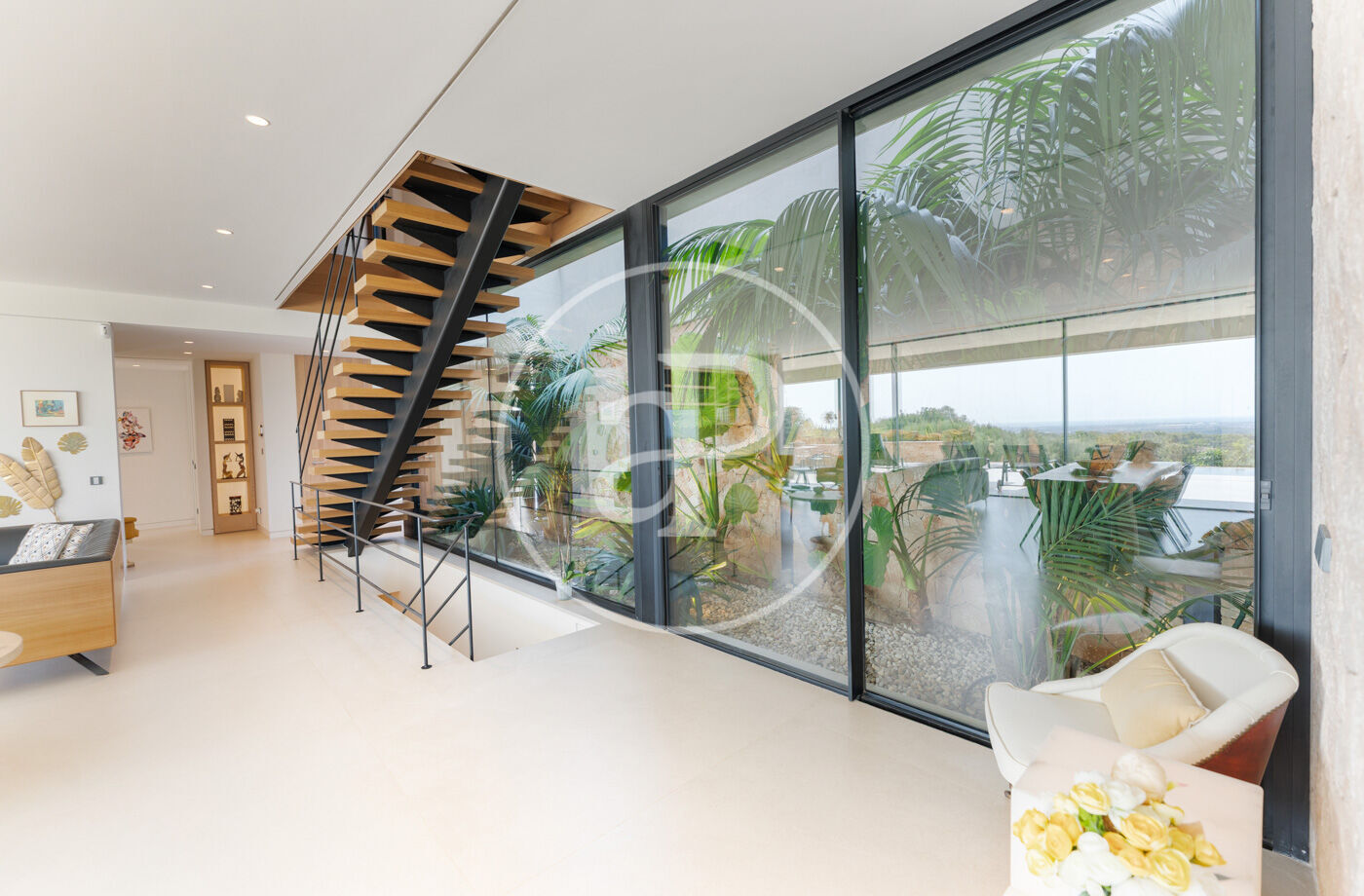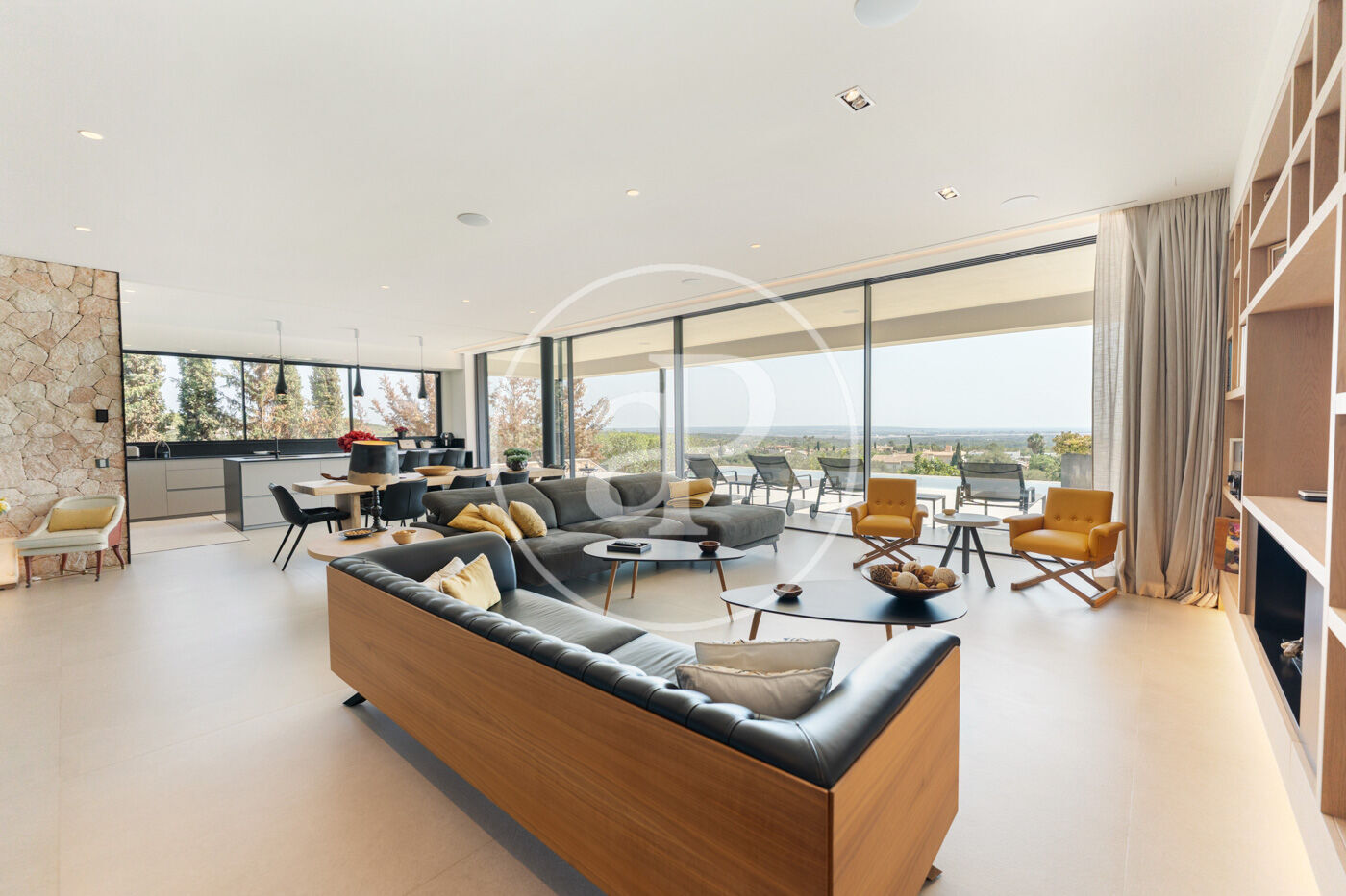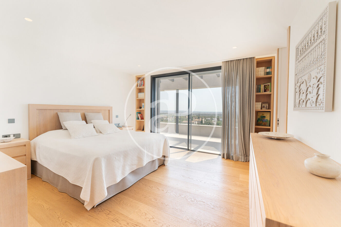 The villa has 5 bedrooms, two of them en suite including the master suite with dressing room, and 6 bathrooms, all with the highest quality finishes. The main living room, bathed in natural light, features stunning sea views and large fully-opening windows, allowing the space to be opened completely and connecting the interior with the terrace, creating a sense of infinite spaciousness.