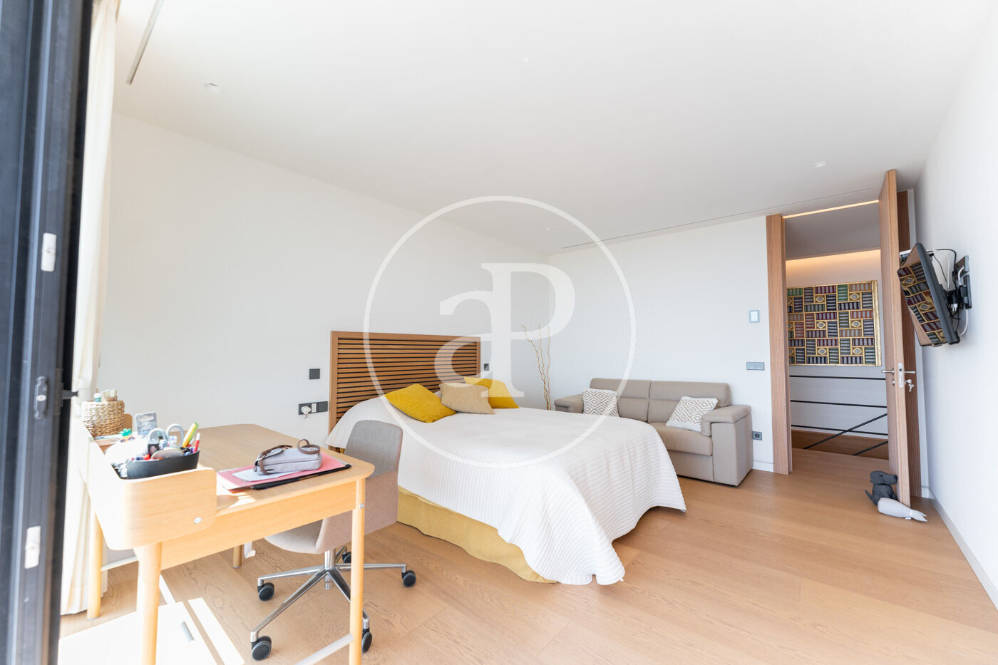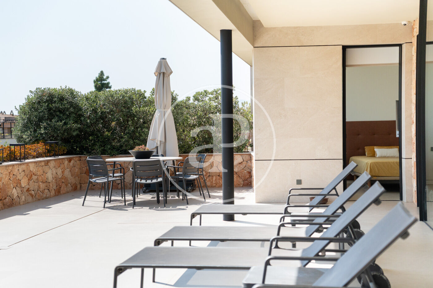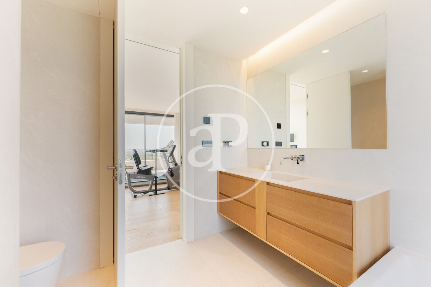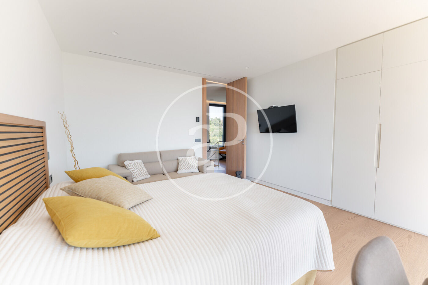 The villa has 5 bedrooms, two of them en suite including the master suite with dressing room, and 6 bathrooms, all with the highest quality finishes. The main living room, bathed in natural light, features stunning sea views and large fully-opening windows, allowing the space to be opened completely and connecting the interior with the terrace, creating a sense of infinite spaciousness.