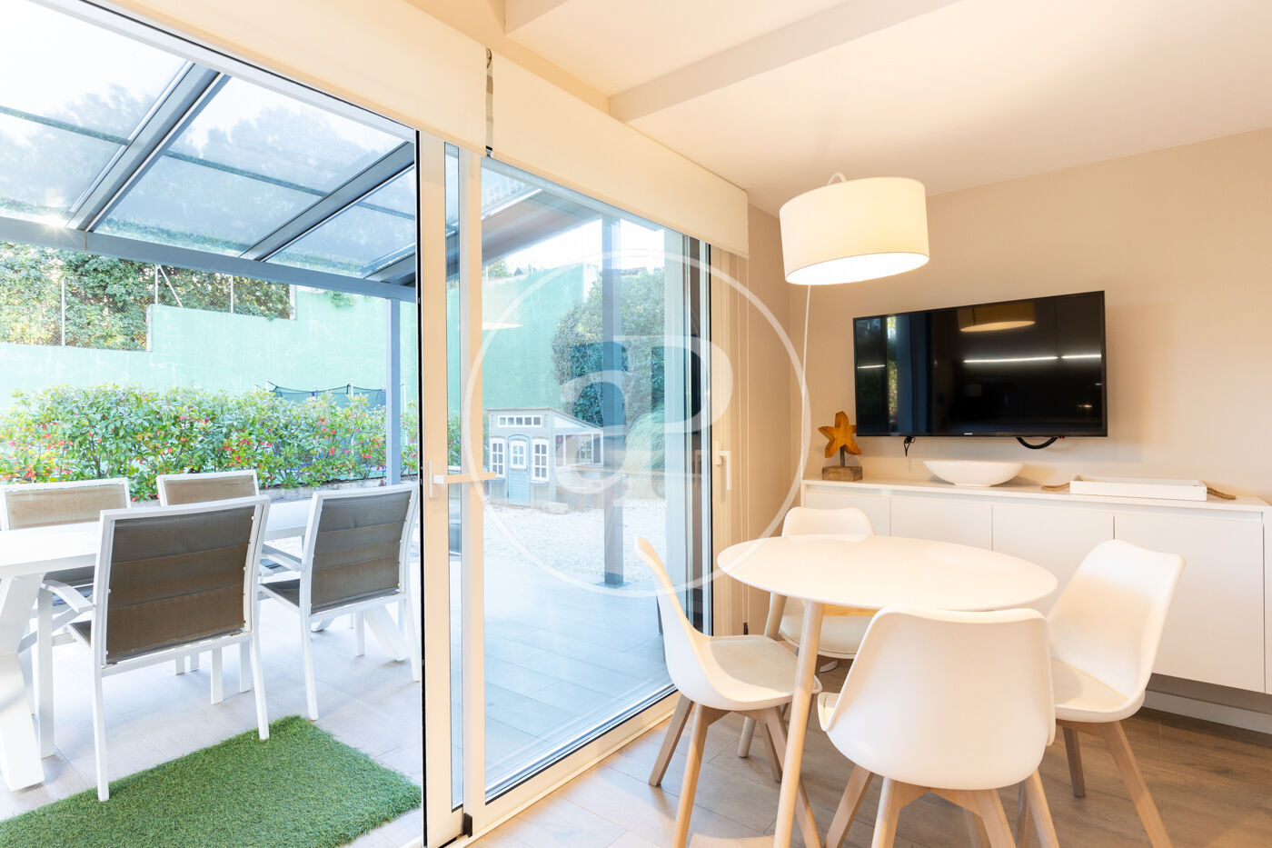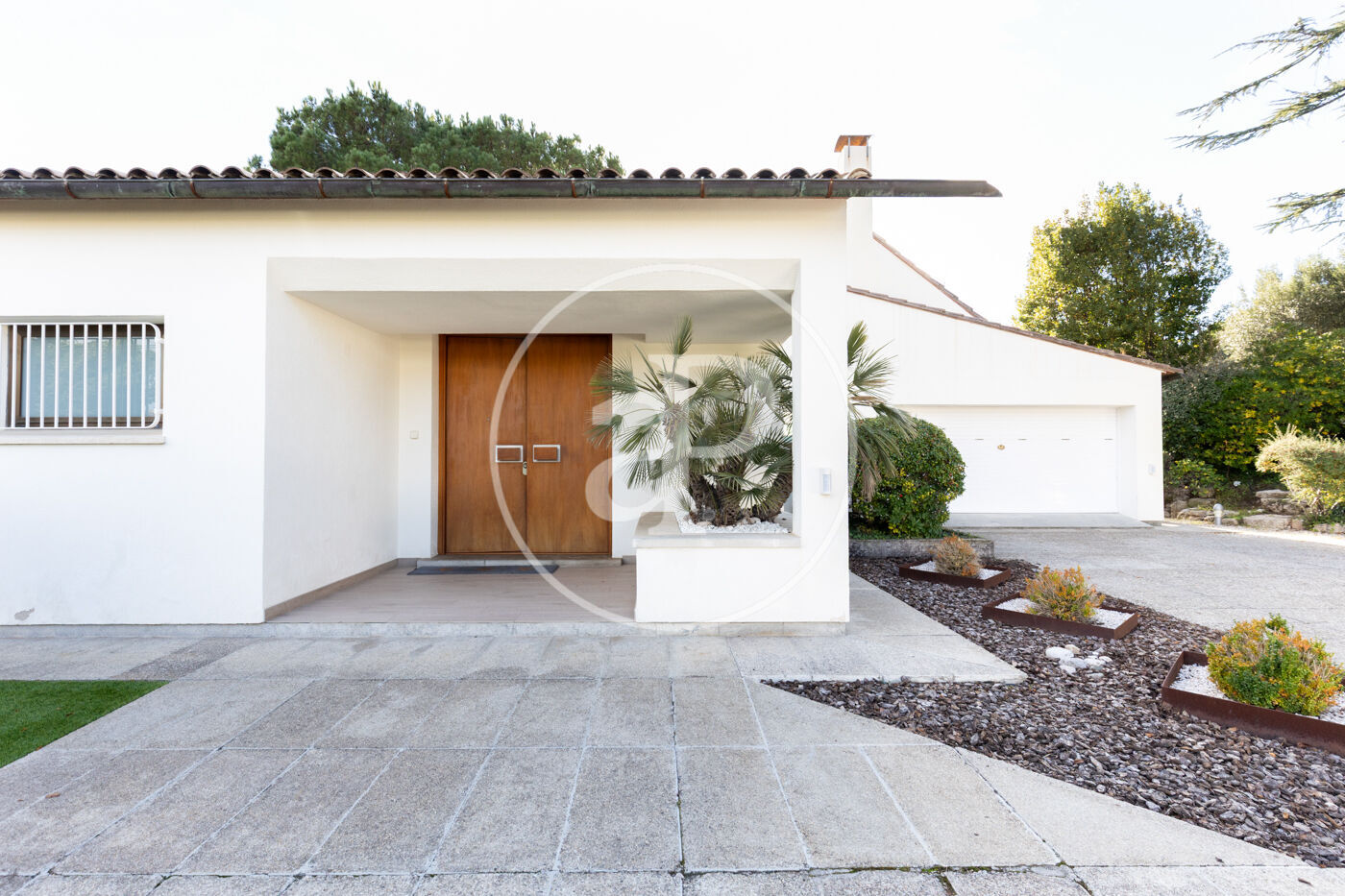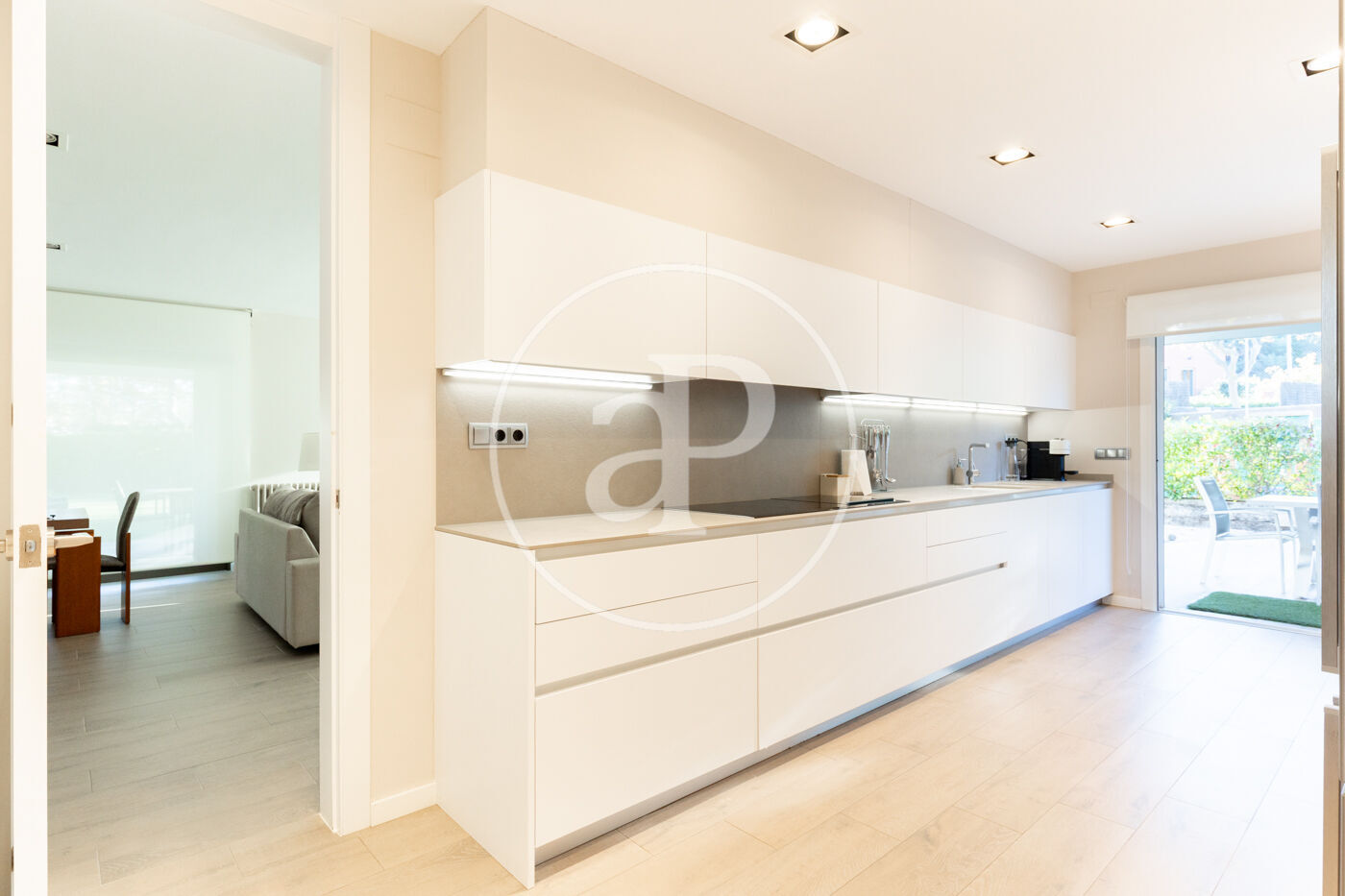 The fully equipped kitchen with high-end appliances offers generous storage space and direct access to the garden, making it the true heart of the home. Adjacent to the kitchen is a practical and elegant laundry area, with direct access to the garage, which accommodates two vehicles.
