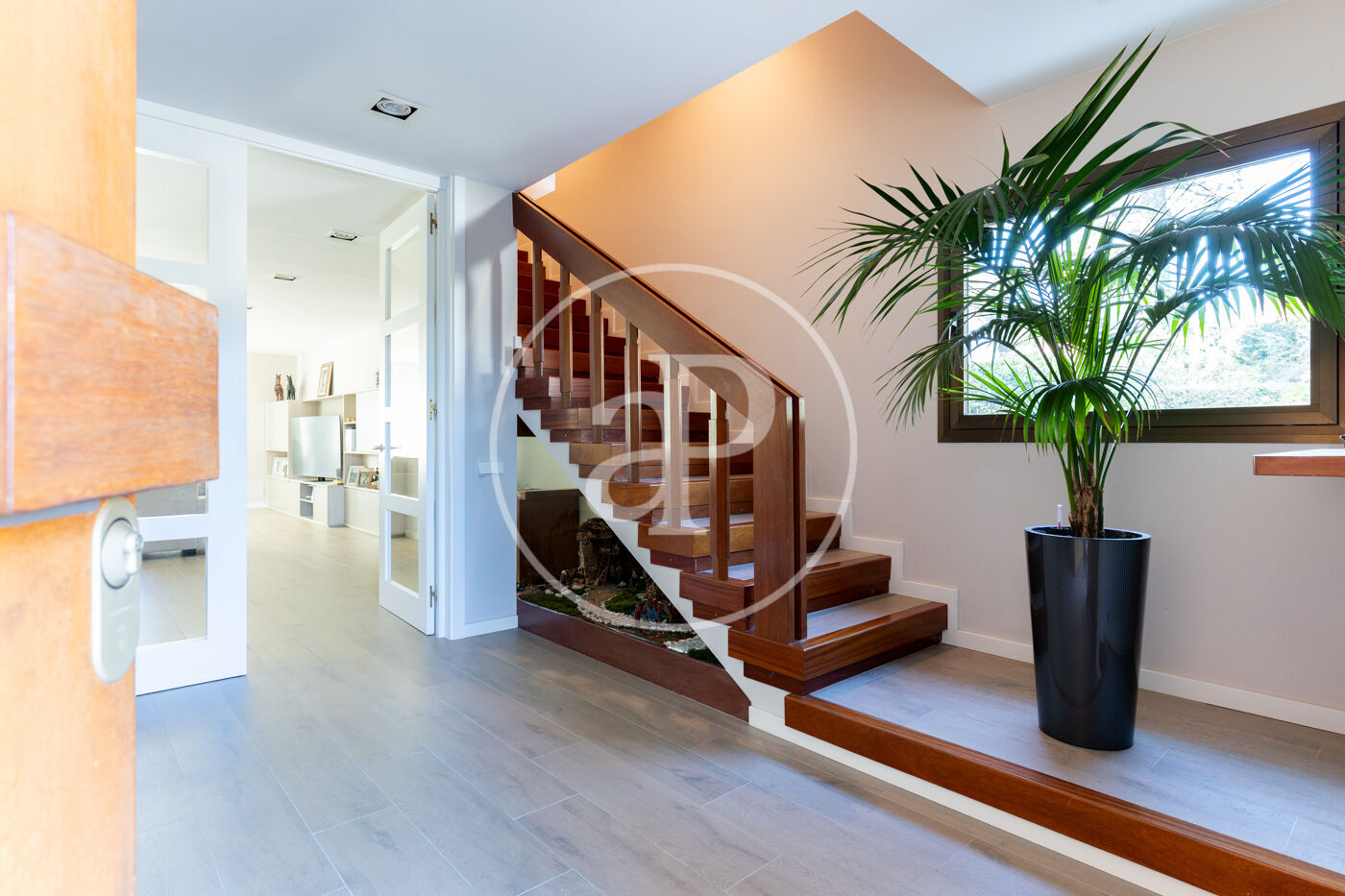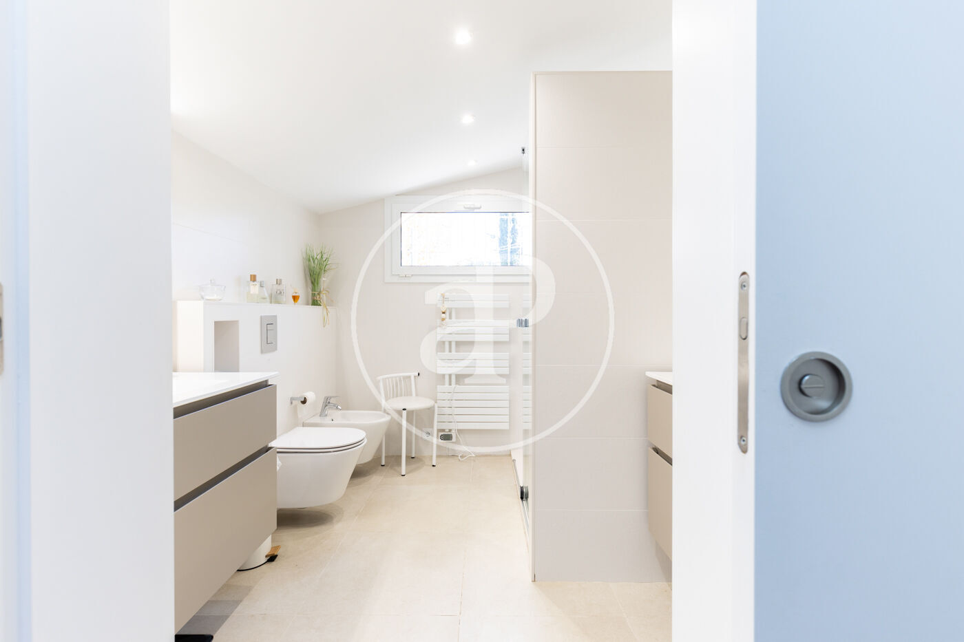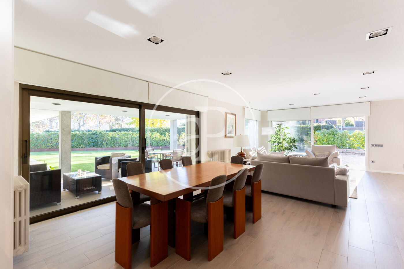 The fully equipped kitchen with high-end appliances offers generous storage space and direct access to the garden, making it the true heart of the home. Adjacent to the kitchen is a practical and elegant laundry area, with direct access to the garage, which accommodates two vehicles.