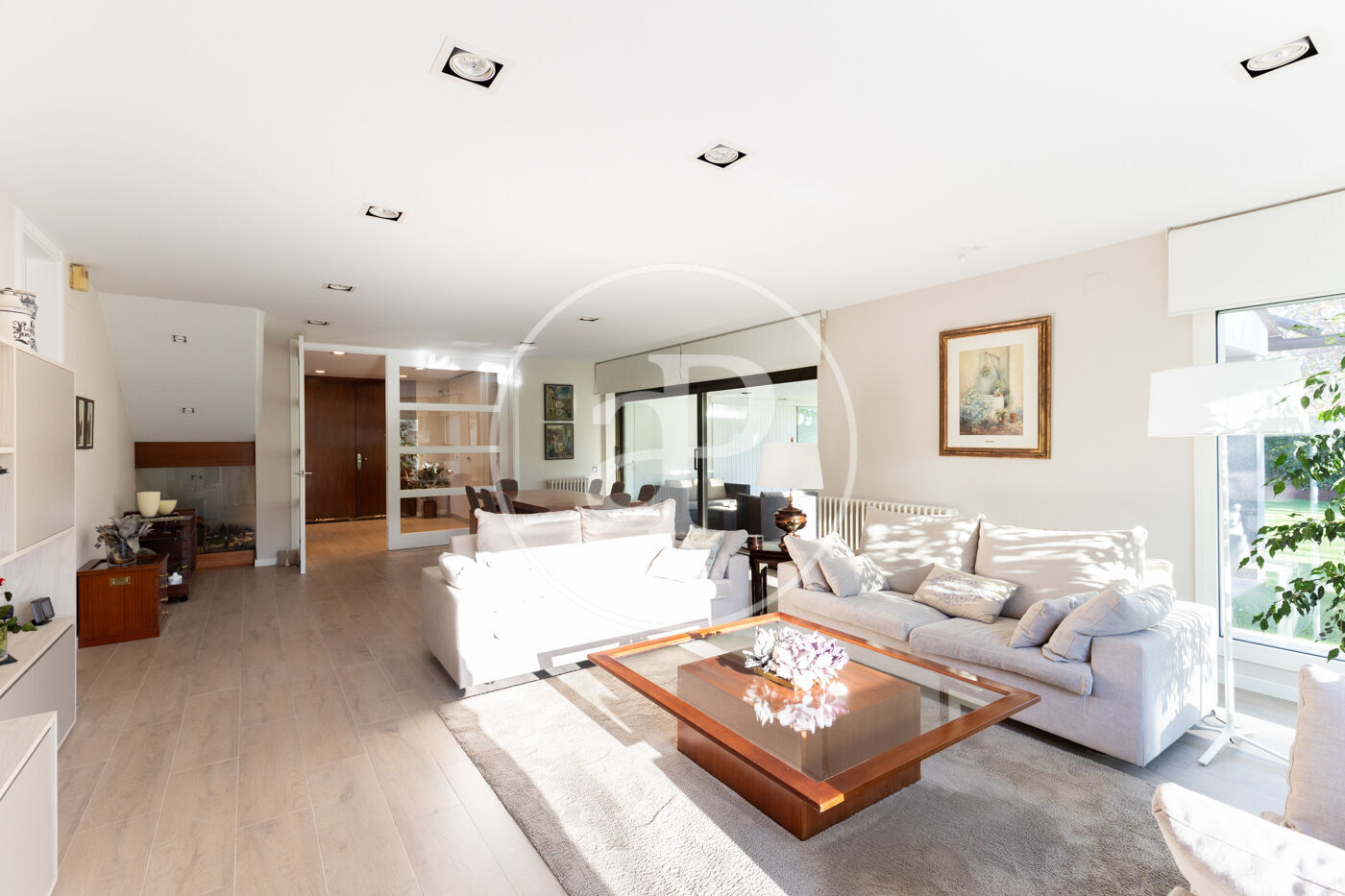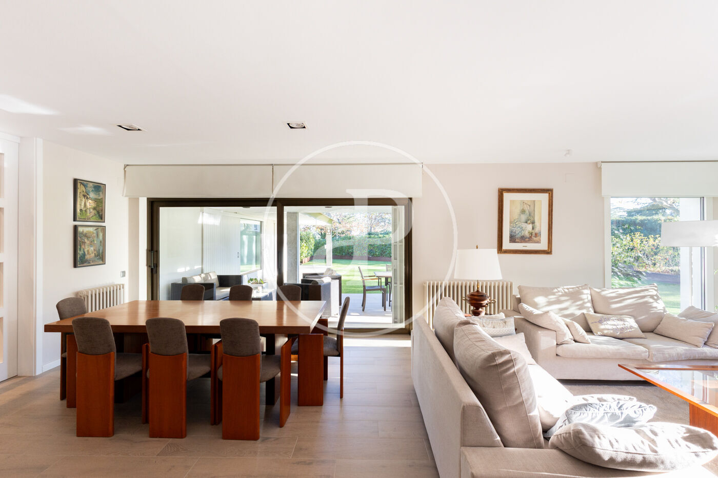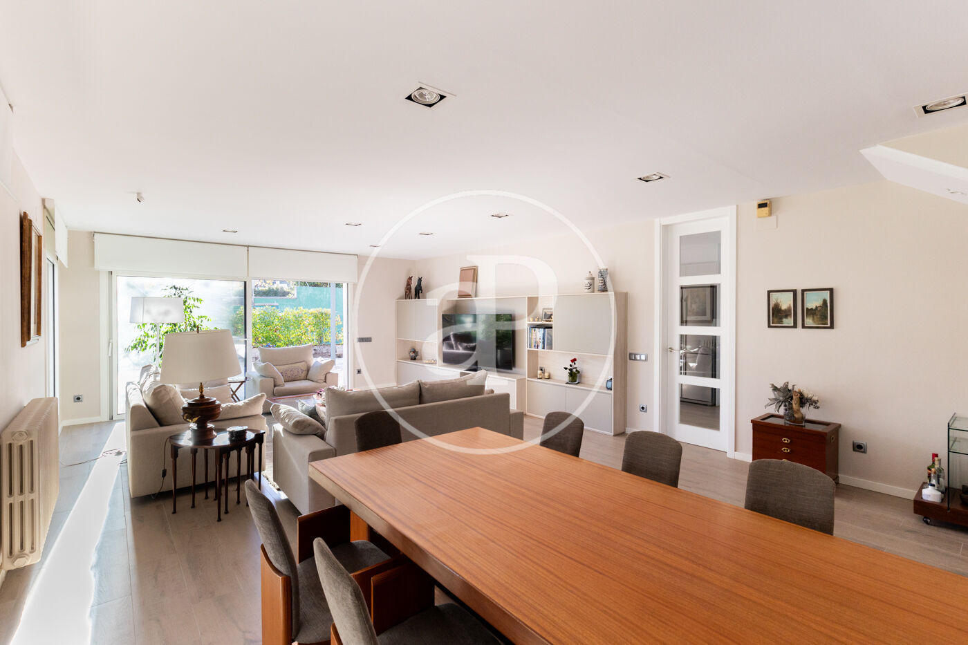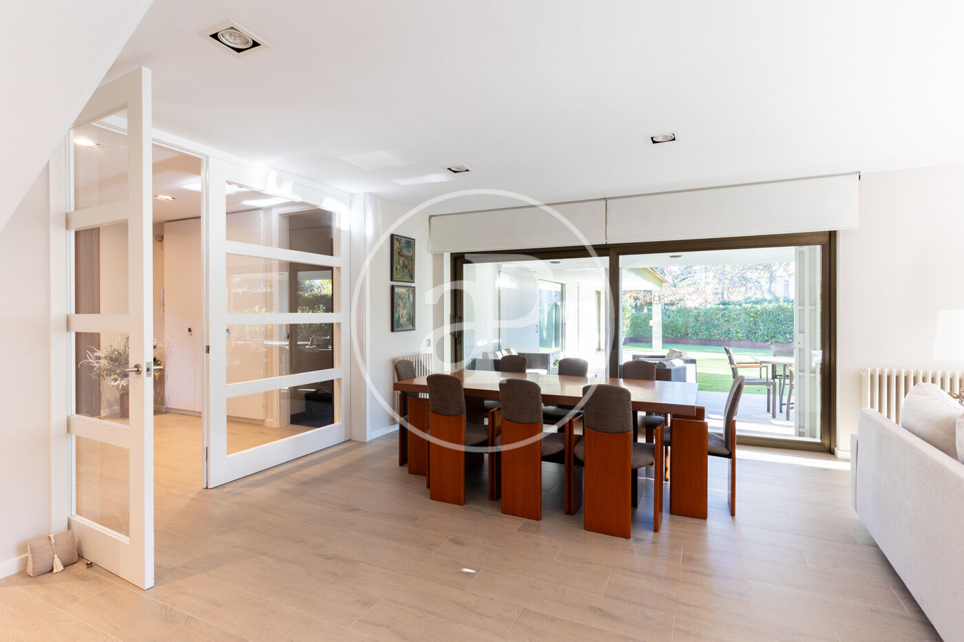 The day area begins with a welcoming entrance hall leading to a spacious living-dining room with large floor-to-ceiling windows opening onto the garden, creating a sense of openness, calm, and seamless indoor-outdoor living.