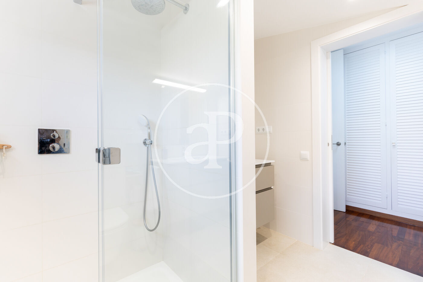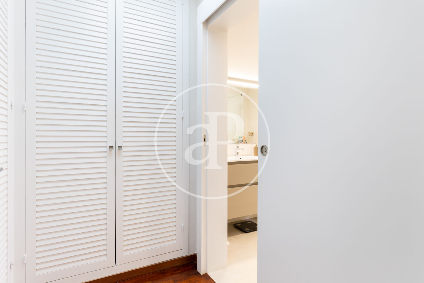 The night area comprises three bedrooms: a master suite, a double bedroom, and a single bedroom, all exterior, featuring built-in wardrobes and natural wood and stoneware flooring. The latter two share a spacious full bathroom.