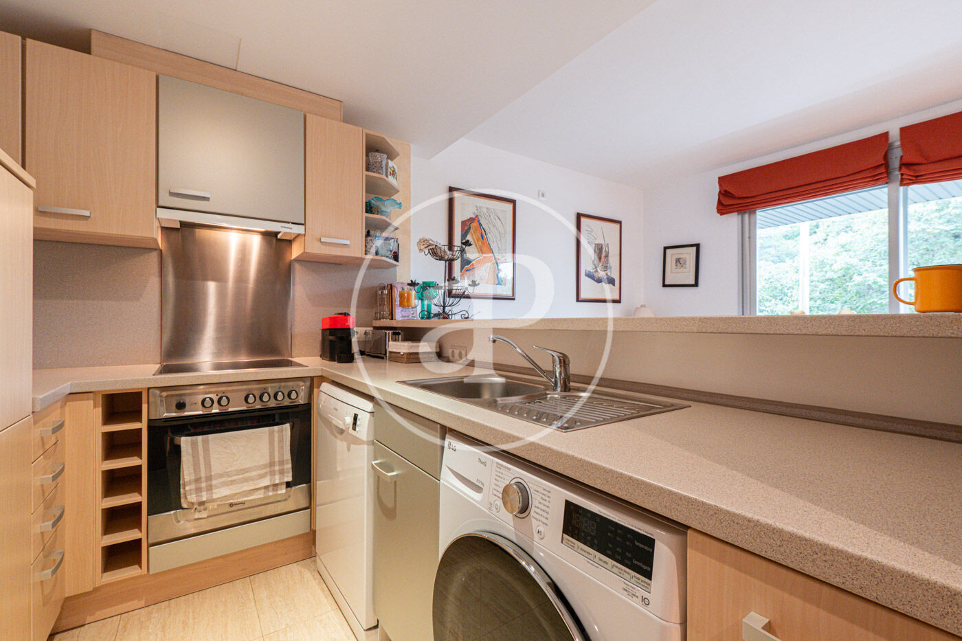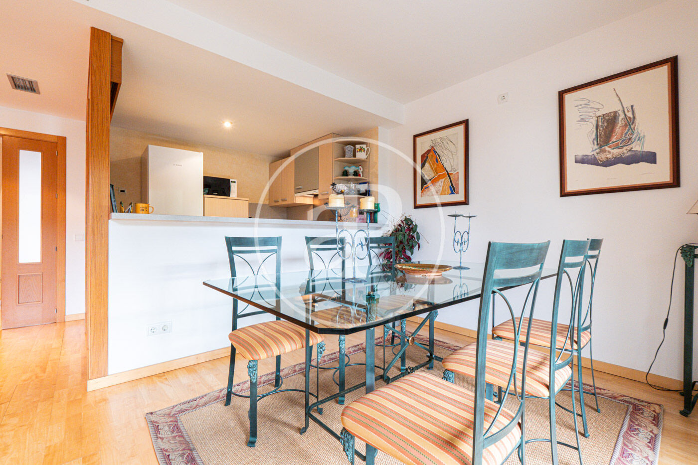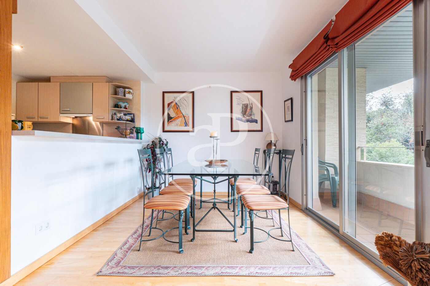 The living-dining room with two large windows that give access to a balcony with views to the park, has a fully equipped and functional open plan kitchen.