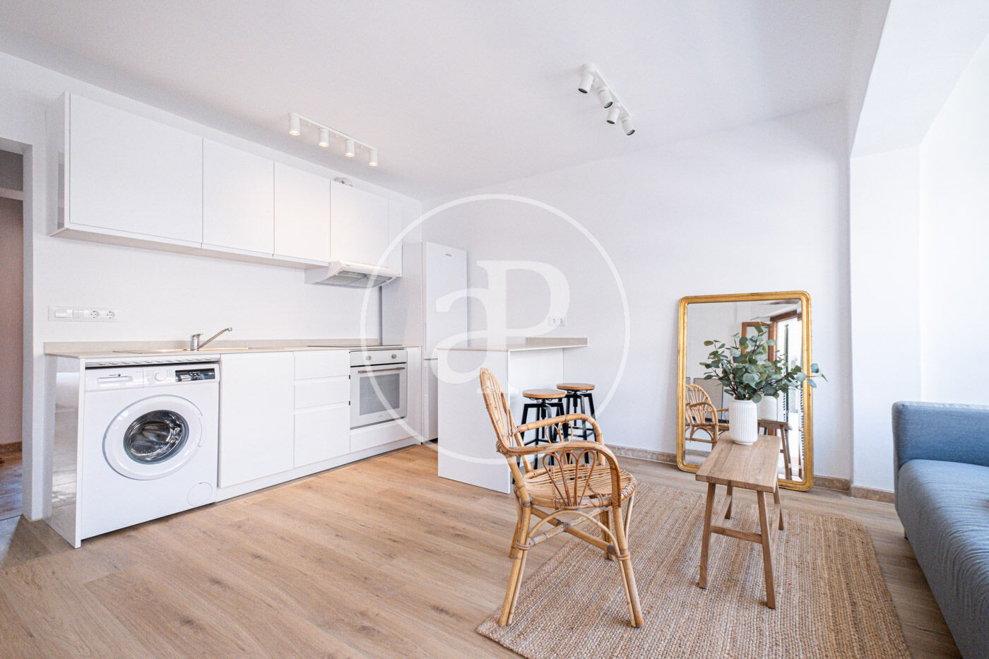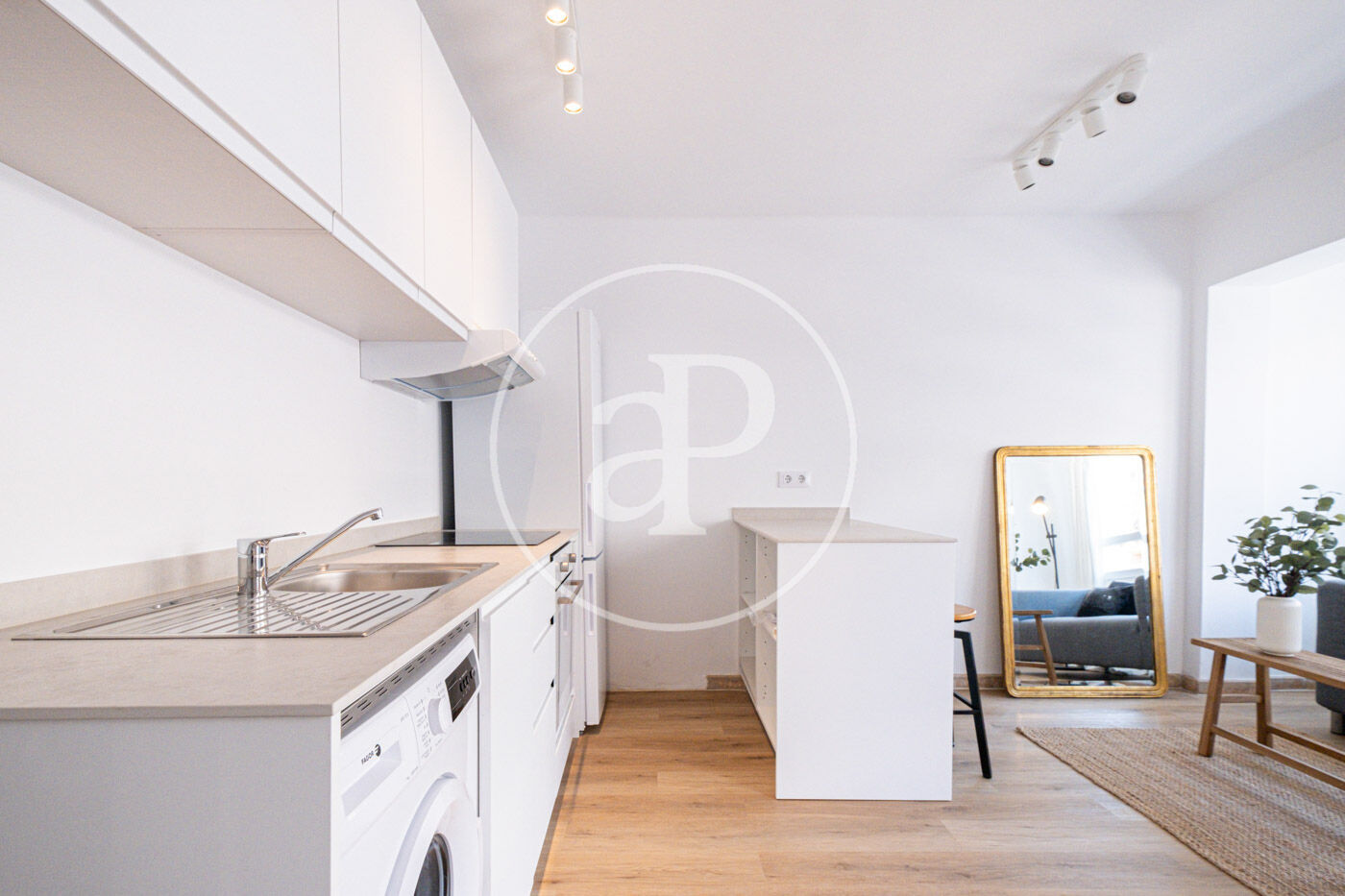 On entering the flat we find a small hall that leads us to the living-dining room, spacious and bright thanks to the large window that shows us the views of the city. It communicates with the balcony, arranged with a table and chairs to enjoy the views and a quiet dinner. The kitchen is fully equipped and has a comfortable island to add extra space when cooking or to have an informal aperitif in it.