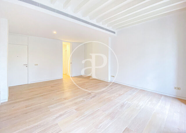 The apartment includes an equipped kitchen, a living room with balcony and views of the Paseo del Born, a guest toilet, a double bedroom and an en suite bathroom. It stands out for its large windows, wooden beams and hot and cold air conditioning system, ideal to enjoy all year round.