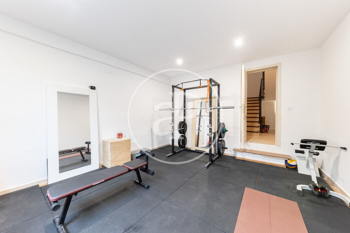 On the ground floor, a large entrance hall leads to a bright, fully furnished and equipped kitchen with direct access to a terrace featuring a jacuzzi, barbecue, and a very spacious laundry area. From the kitchen, you can access a room with a fireplace, ideal as a dining room, living room, or office. The living-dining room stands out for its size, creating a warm and perfect atmosphere for daily life. On the same floor, there is a guest bedroom with a wardrobe, a full bathroom with a shower tray, and a fully functional gym.