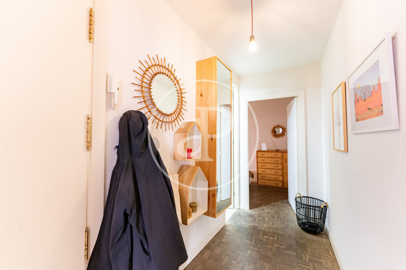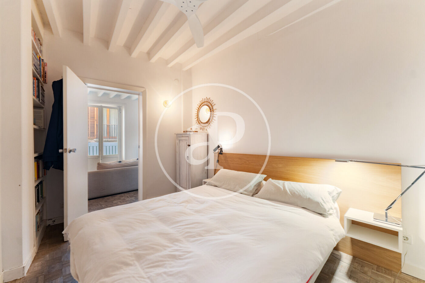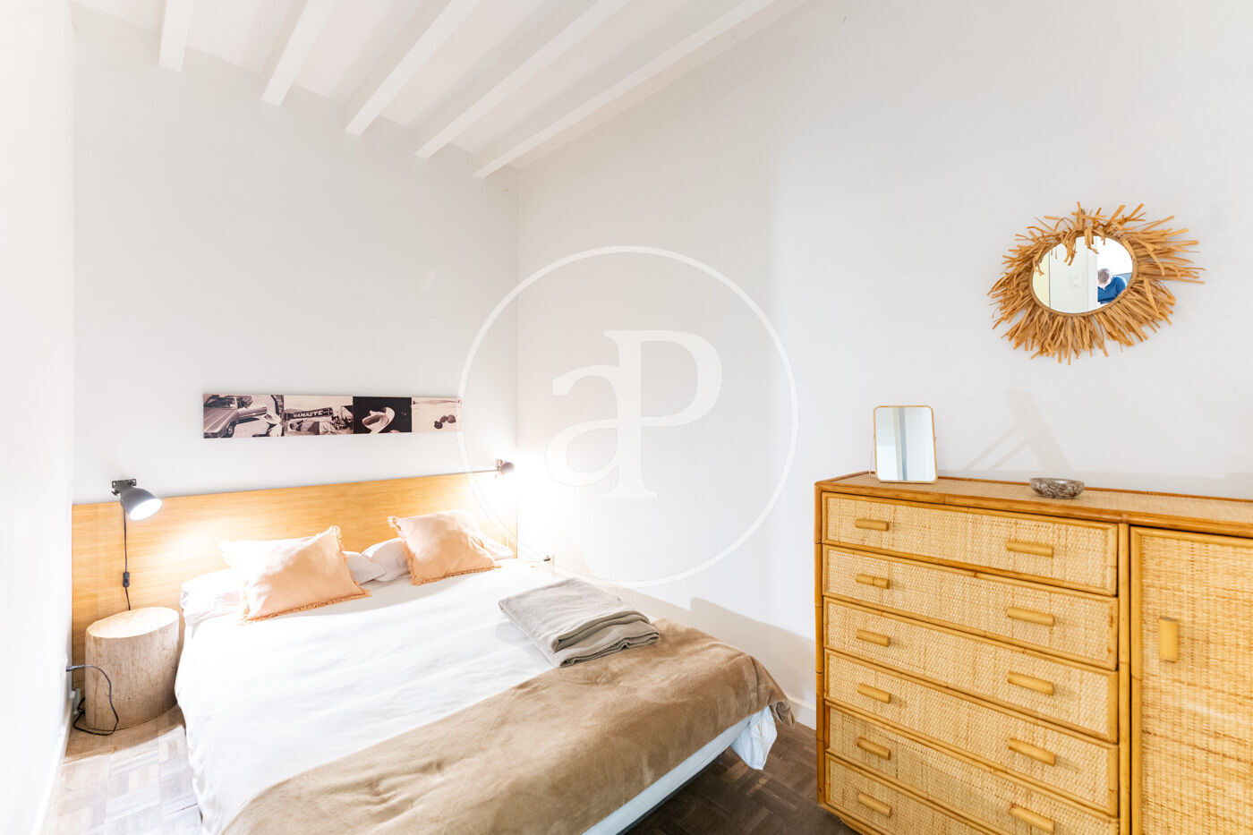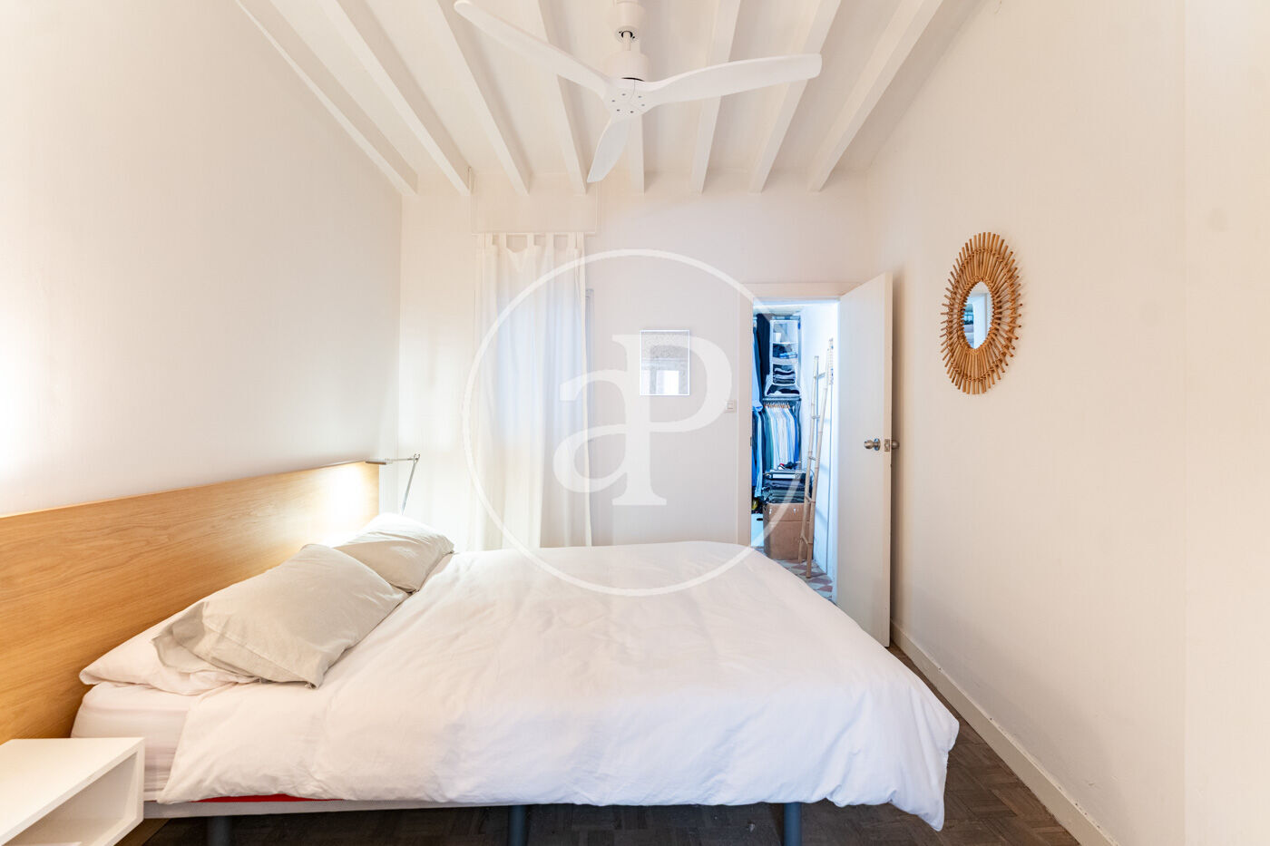 Notable features include wooden exterior carpentry, oak floors, exposed beams lacquered in white, designer ceiling fans, and a fully equipped kitchen. There is also the option to rent a nearby parking space.