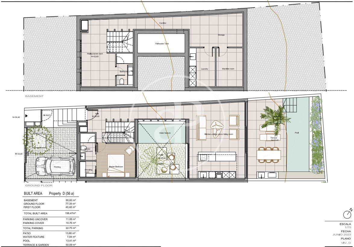 The main entrance is through a charming garden with private parking. The ground floor features a master bedroom suite with views of a central patio, which, while offering total privacy, visually connects with the living room. From the entrance hall, we access the spacious living-dining room with an open kitchen, an elegant guest bathroom, and a porch that directly connects to the garden and pool, creating a perfect space for leisure and relaxation. On the upper floor, there are two large exterior bedrooms with built-in wardrobes and access to a terrace. In the basement, you’ll find the laundry room and utility room, but it can also be used as a wine cellar, home cinema, or gym. The home features underfloor heating and ducted air conditioning.