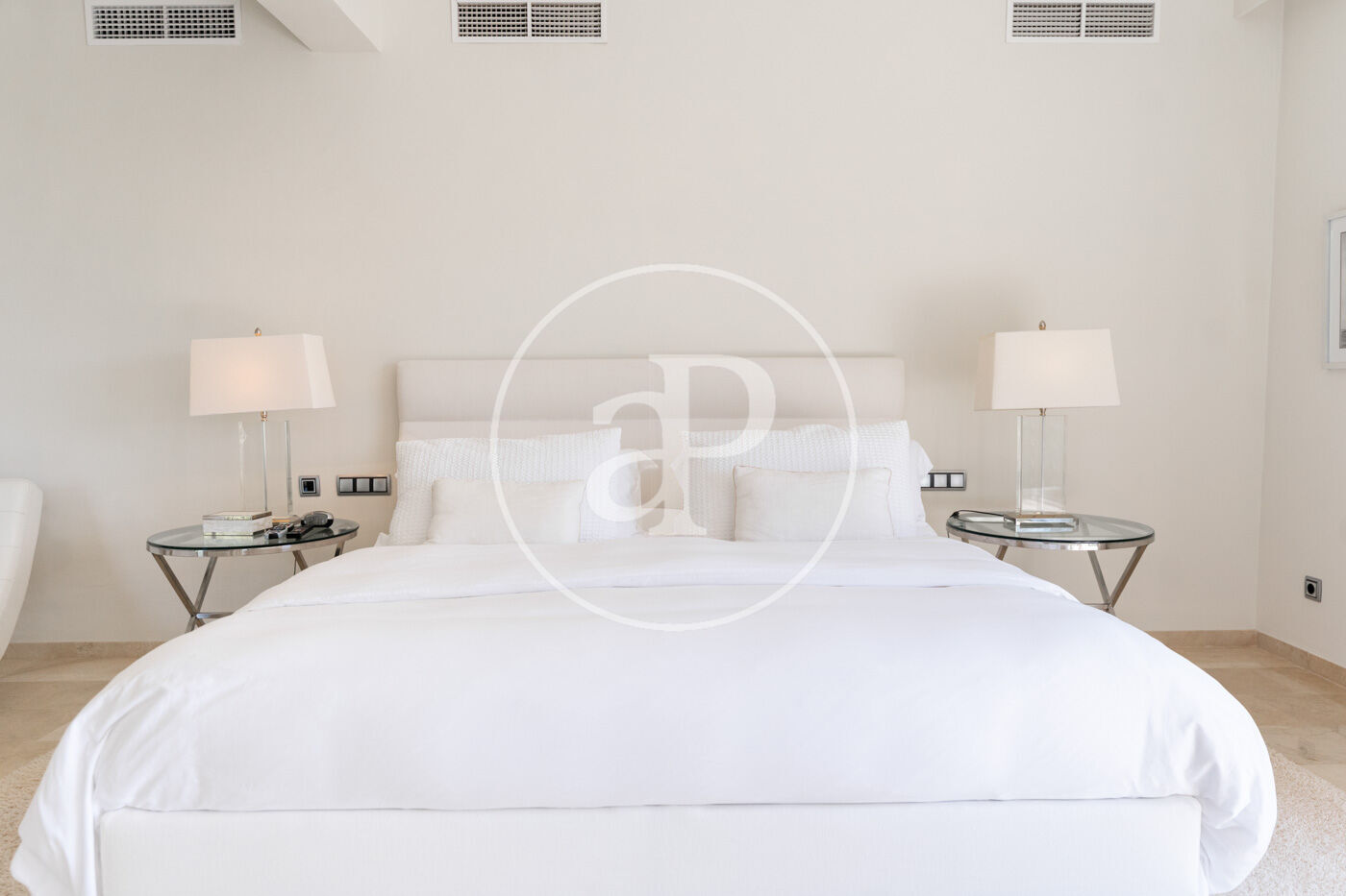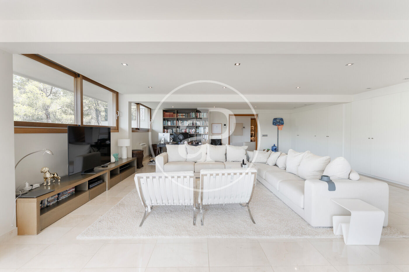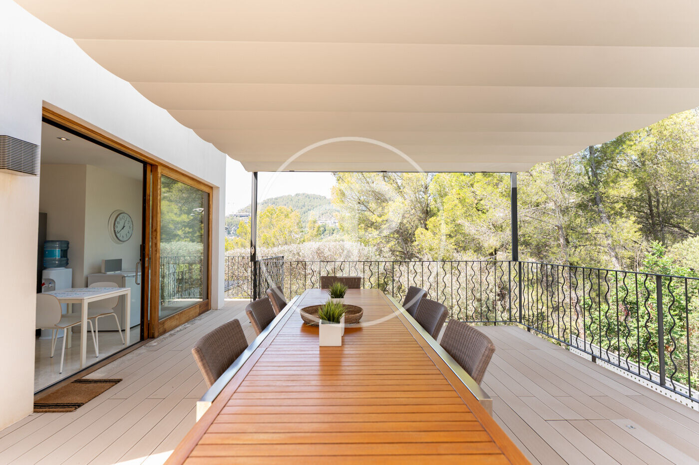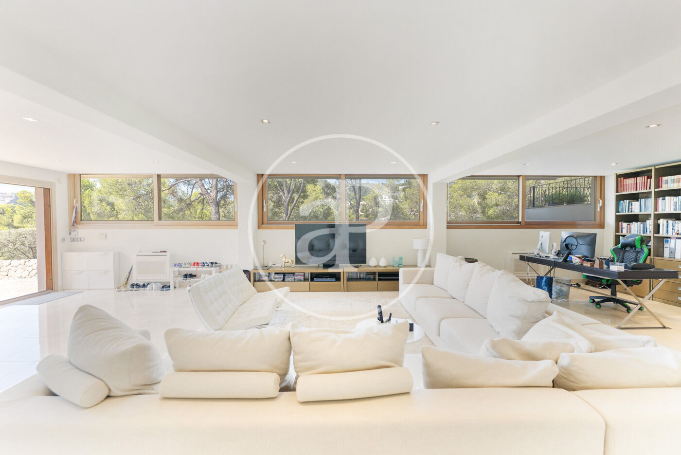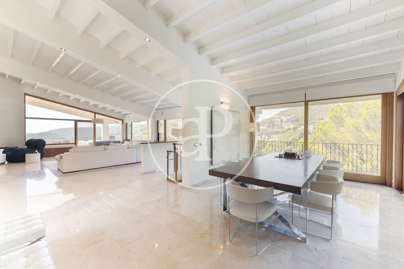The elegant living-dining room with high ceilings and large windows becomes the heart of the home, offering views of Palma Bay and the Son Vida mountains. From one of the terraces, you can even enjoy sea views.
