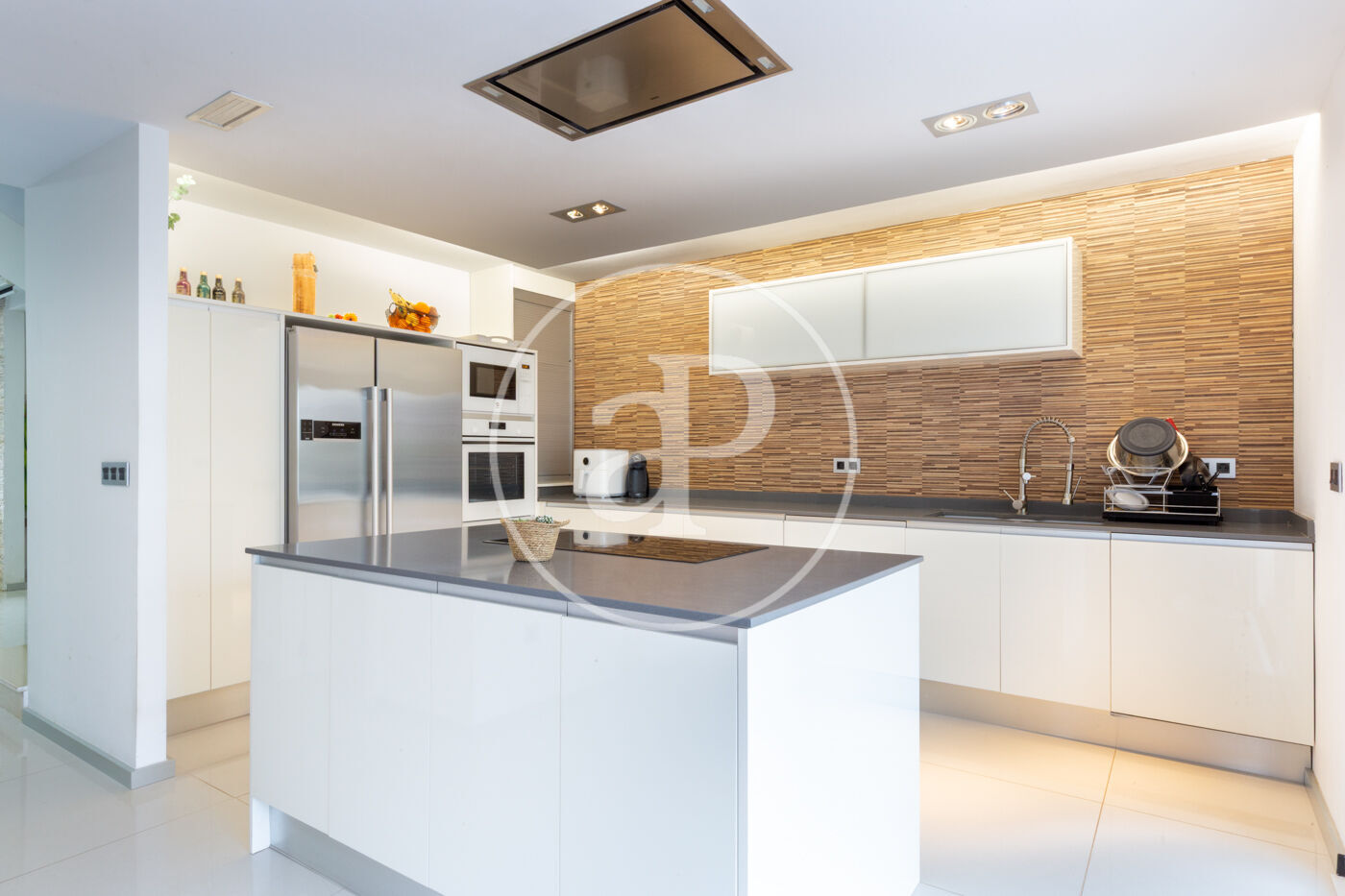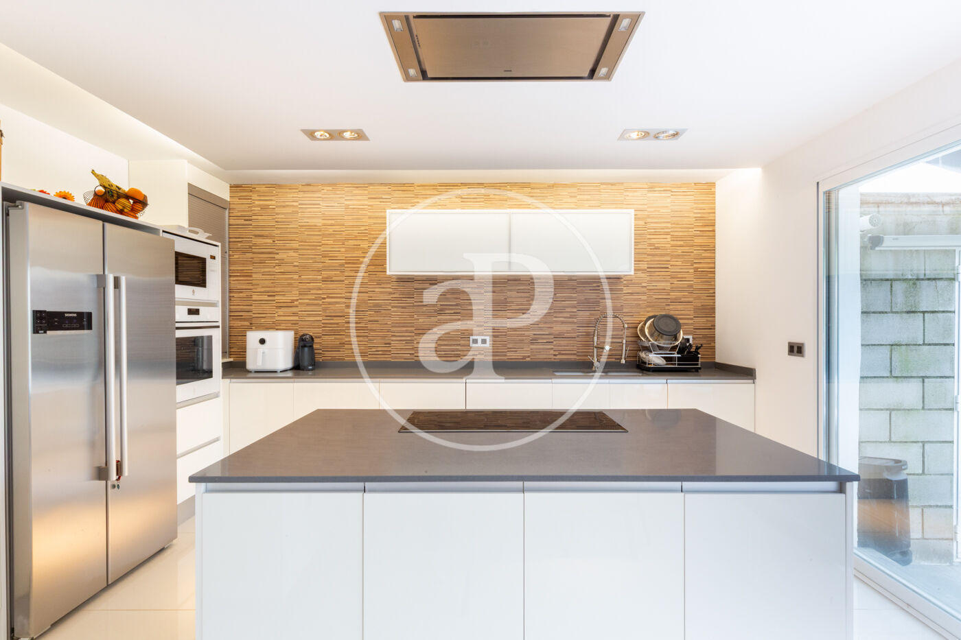 Stunning kitchen with a central island, plenty of storage space and an office area, perfect for cooking lovers.