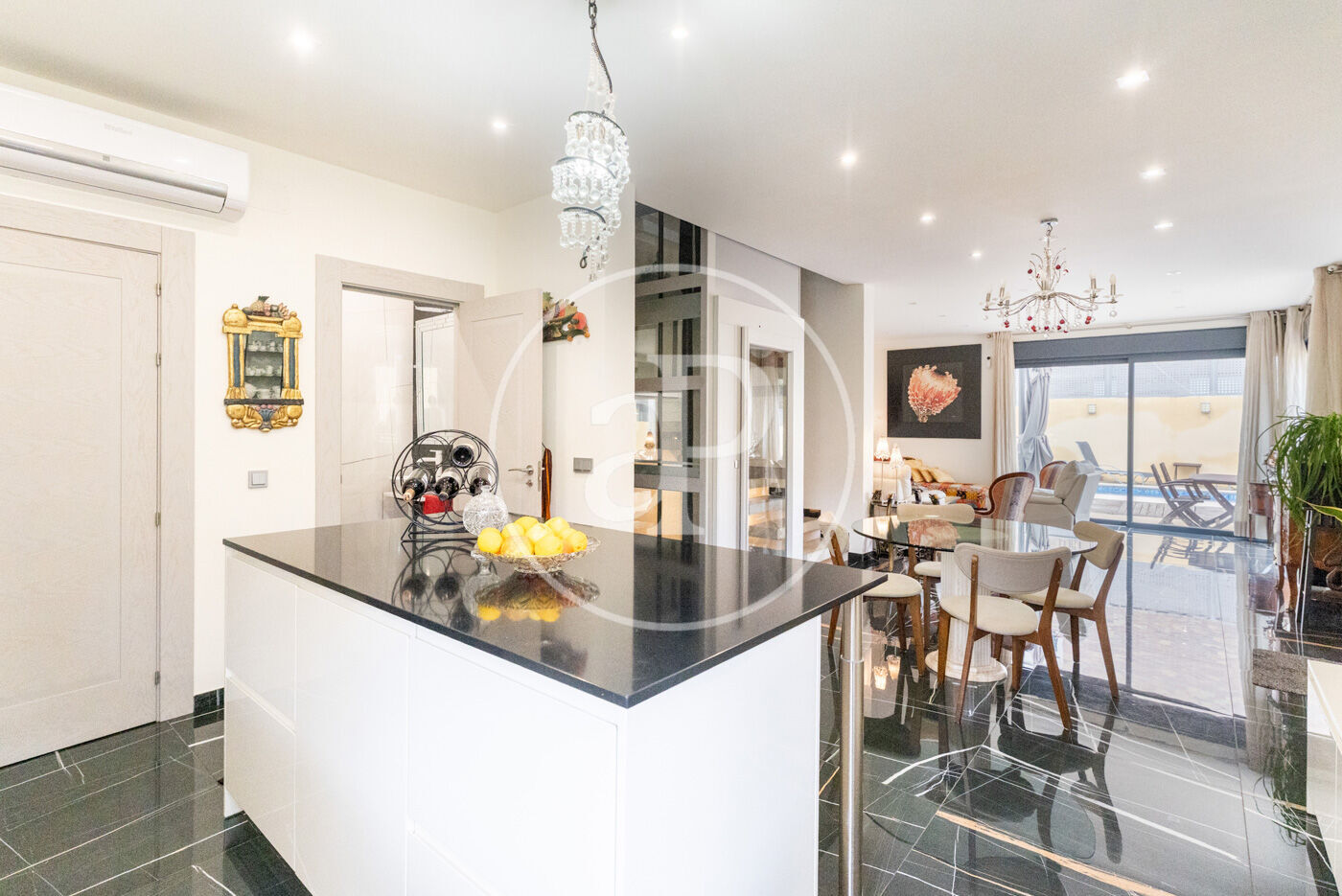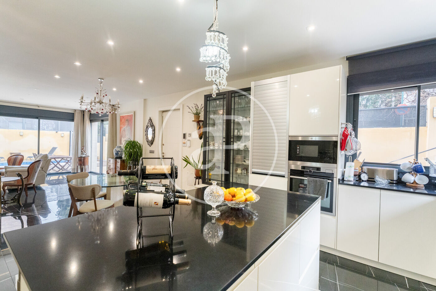 On the ground floor, a spacious and bright living room with large windows opens directly to the private garden with swimming pool, creating an ideal space to enjoy with family or friends. The open kitchen, equipped with a central island, combines design and practicality. On this floor there is also a separate pantry and a toilet.