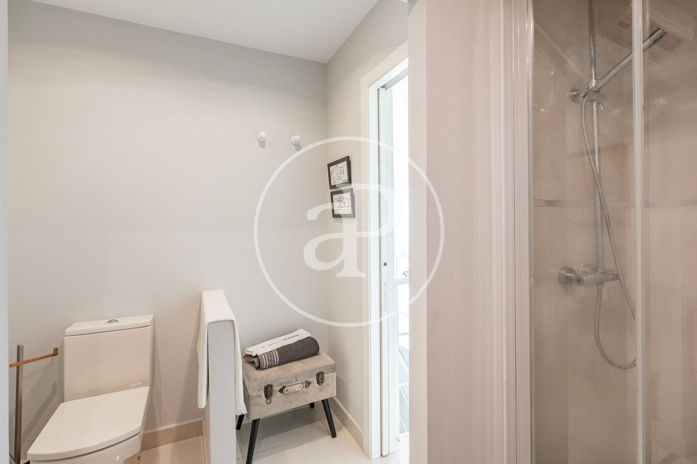 On the first floor we find a spacious living room and modern and functional integrated kitchen, equipped with all appliances, as well as large windows that give much luminosity to the space. In the entrance, spacious wardrobe and bathroom with shower. The living room has access to a hallway terrace.