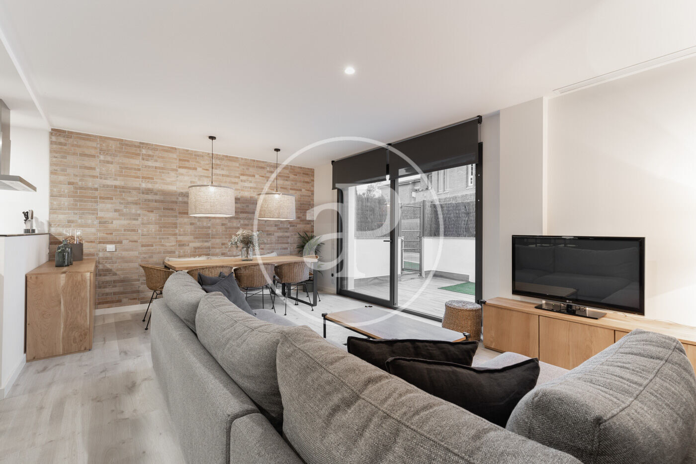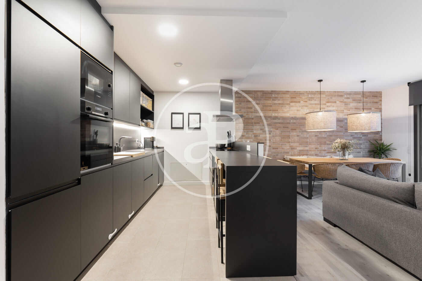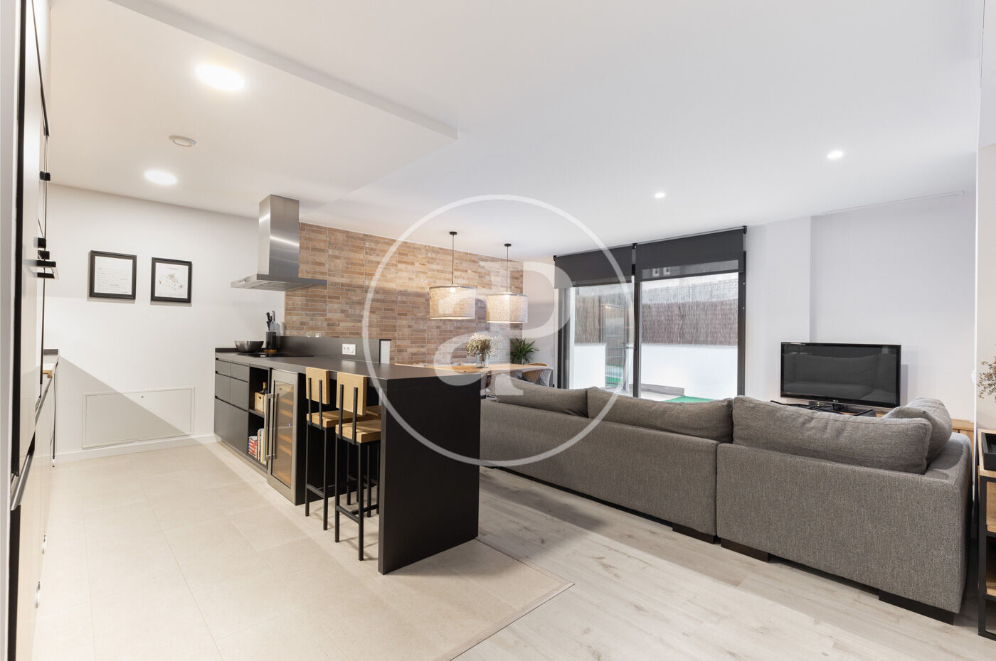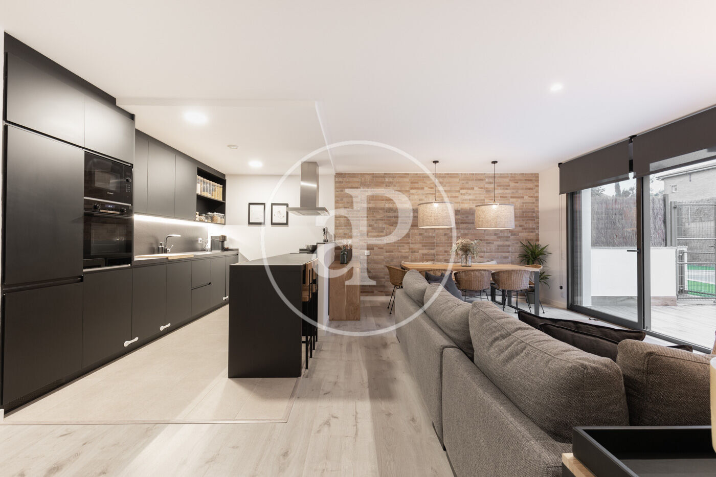 Upon entering the property, we find a living-dining room integrated with the kitchen. Featuring high-end finishes and appliances built into the custom-designed furniture, this space includes large windows that not only provide natural light and ventilation but also lead to the 60 m² private garden—perfect for enjoying a peaceful chill-out area.