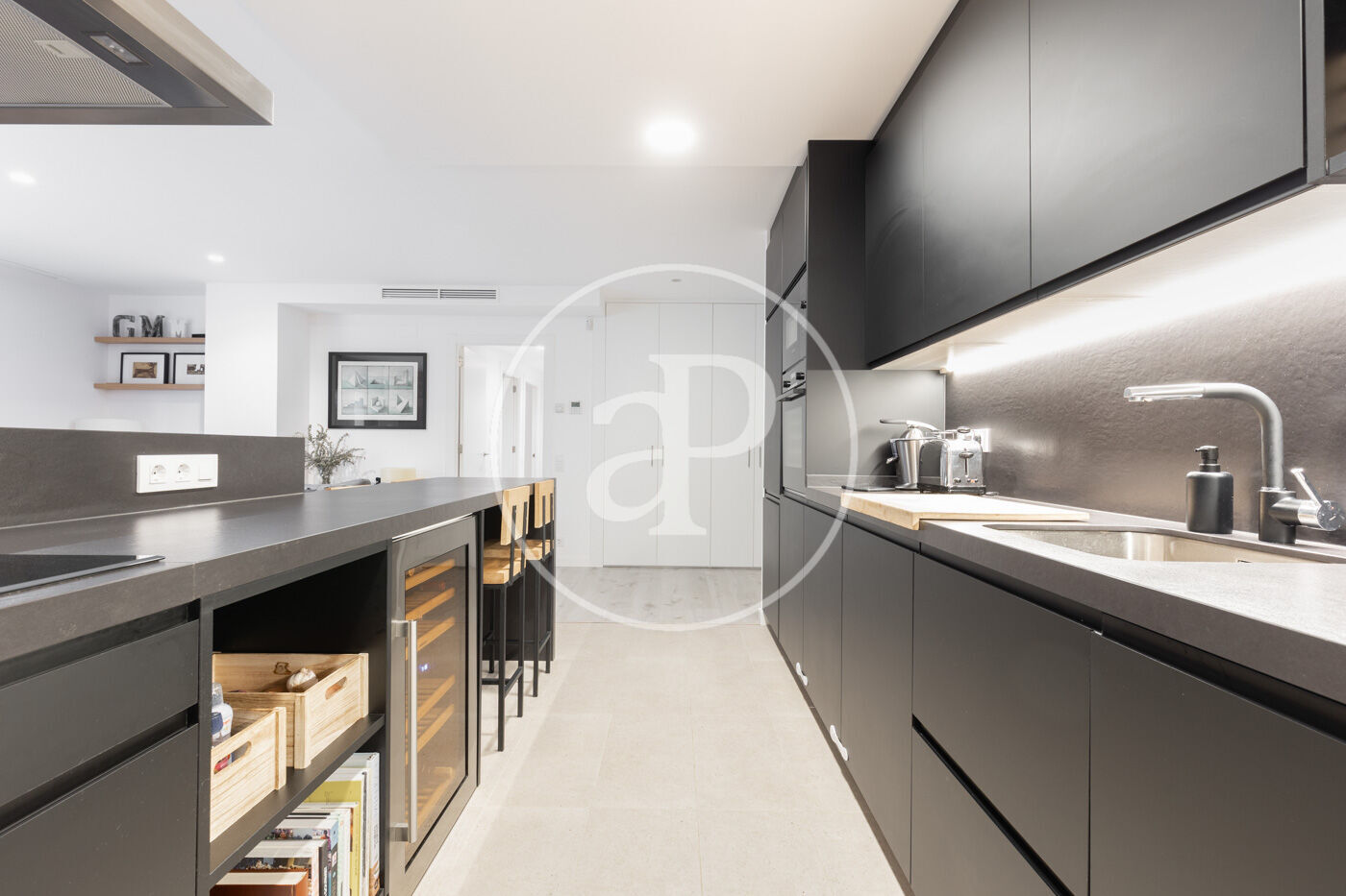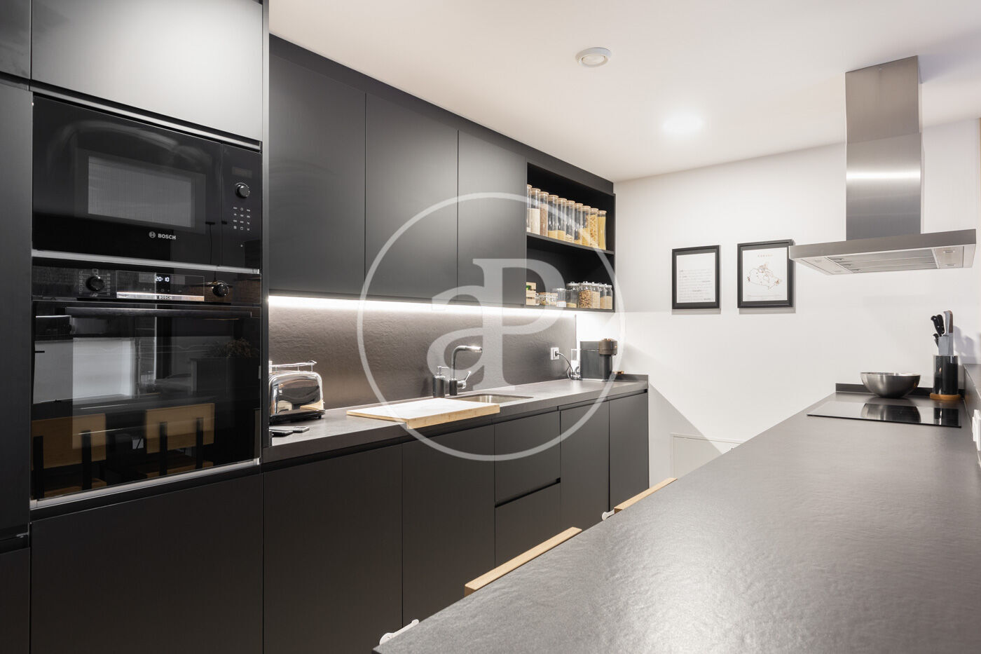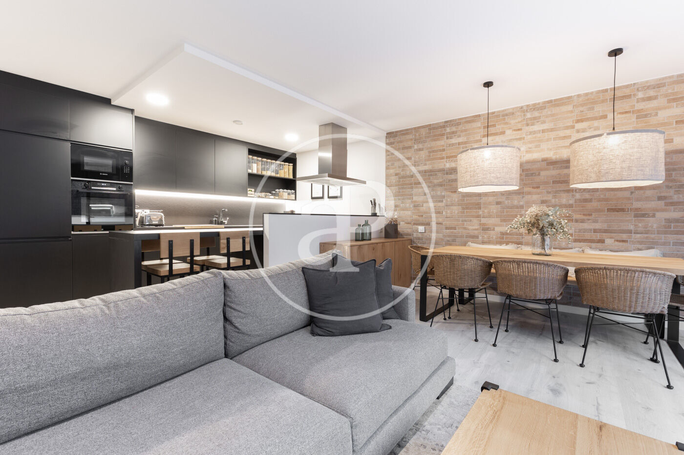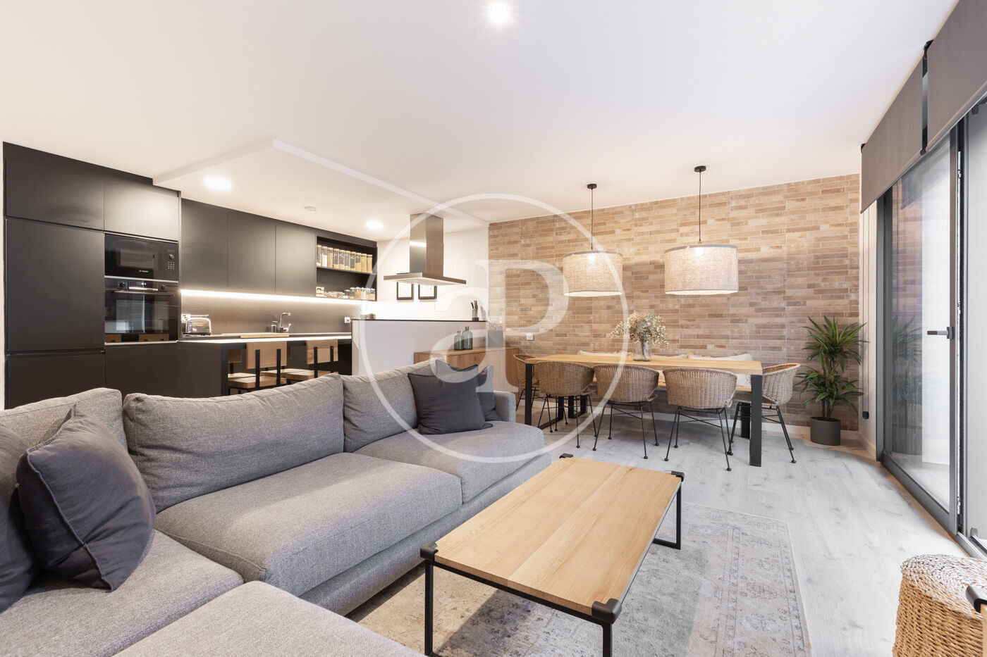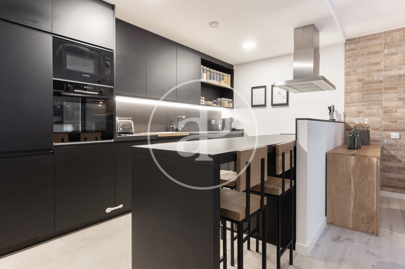 Upon entering the property, we find a living-dining room integrated with the kitchen. Featuring high-end finishes and appliances built into the custom-designed furniture, this space includes large windows that not only provide natural light and ventilation but also lead to the 60 m² private garden—perfect for enjoying a peaceful chill-out area.