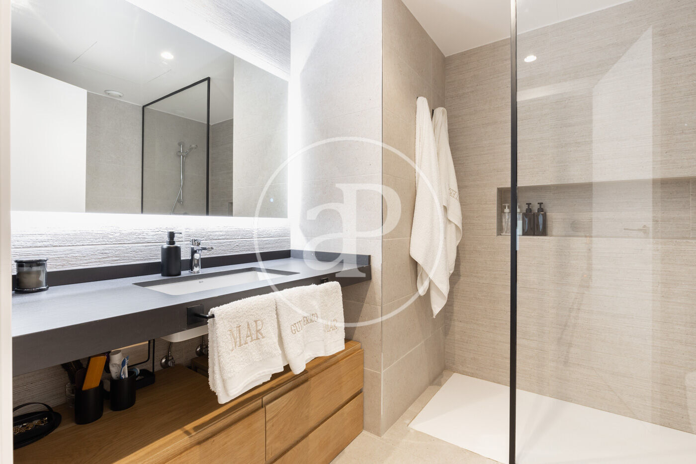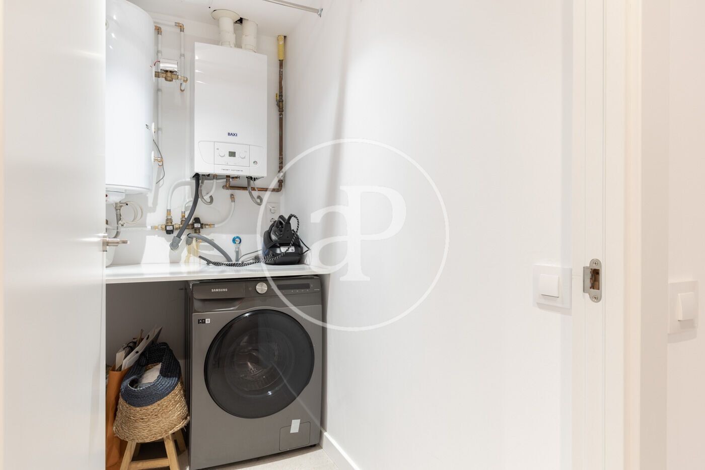 The night area offers two double bedrooms with built-in wardrobes and some integrated furniture. There is also a suite bedroom with a full bathroom and dressing area. Additionally, there is another full bathroom with a bathtub and a laundry area.