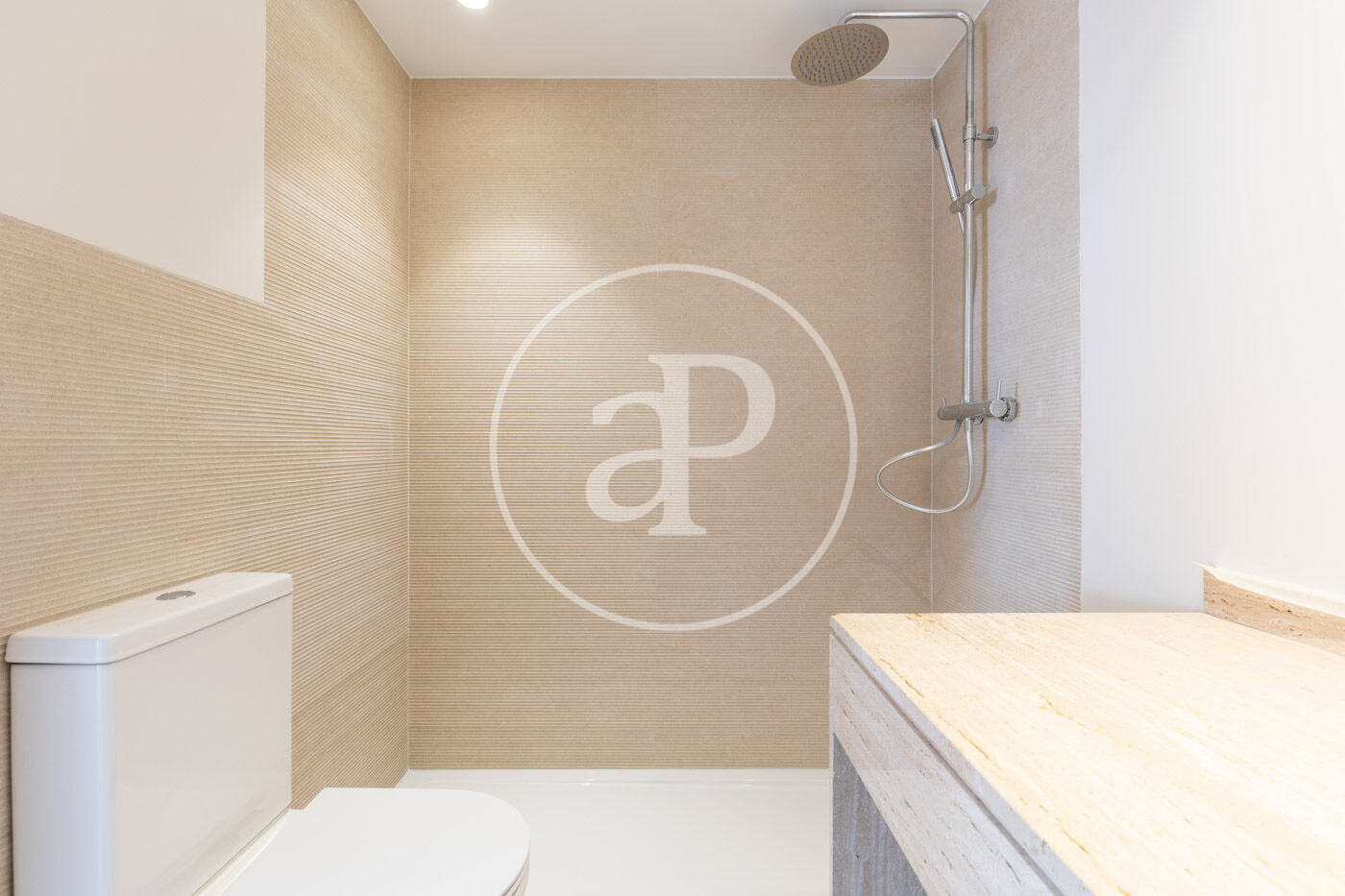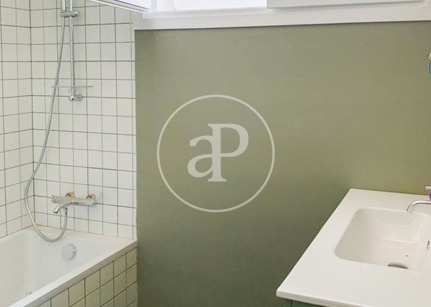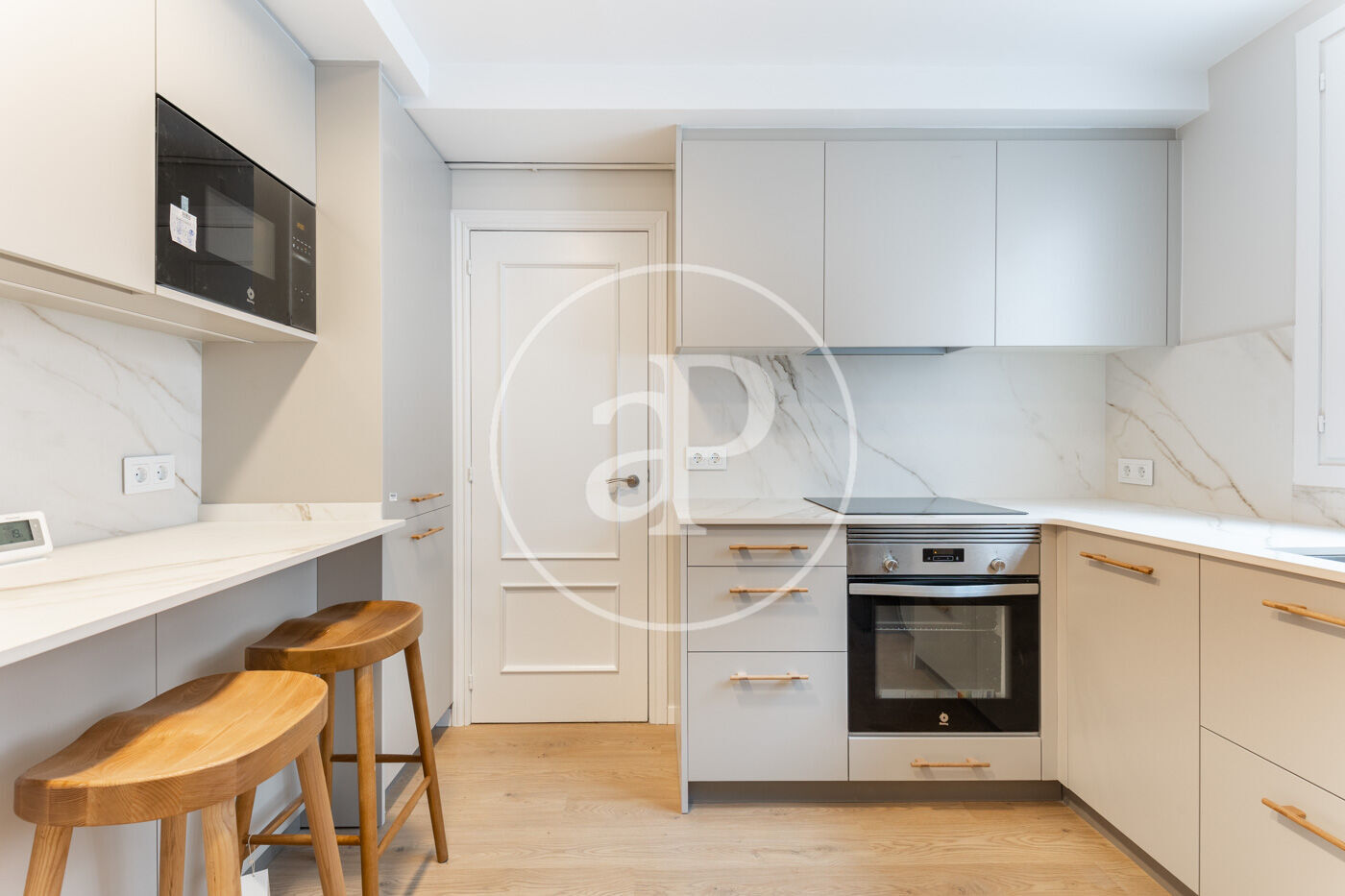 In Diputación Street, near Rambla Catalunya and the beautiful Passeig de Gracia, we find this 90sqm property recently renovated and furnished with a modern, minimalist, sober and elegant design. It is located in a regal state and is very bright, quiet, silent and cozy. In addition, it is very well connected with public transport. When coming into the day area of the house we find a large kitchen opened to the living room and equipped with high-quality appliances, cupboards with a lot of storage space and a table that can be moved to the bright living room with access to a typical balcony of Eixample, with double glazing and restored blinds. A high corridor with shelves from the floor to the ceiling and a storage room separates the night area of the house. In this area, we find a toilet, two double bedrooms that share an interior terrace and one of them en suite with light in the head of the bed and the utility room equipped with a washing machine. The floor keeps original catalan high ceilings and wooden beams that give an authenticity essence to the property. It has oak sliding doors in several rooms, micro cement floors and hot and cold air conditioning. The whole house plays with the contrasts of materials, basically with the wood, metal and brick and is ideal for a couple or a family who wants to live in one of the most representative areas of Barcelona. Available at the end of December.  * In compliance with Law 12/2023 and Law 18/2007, we inform that