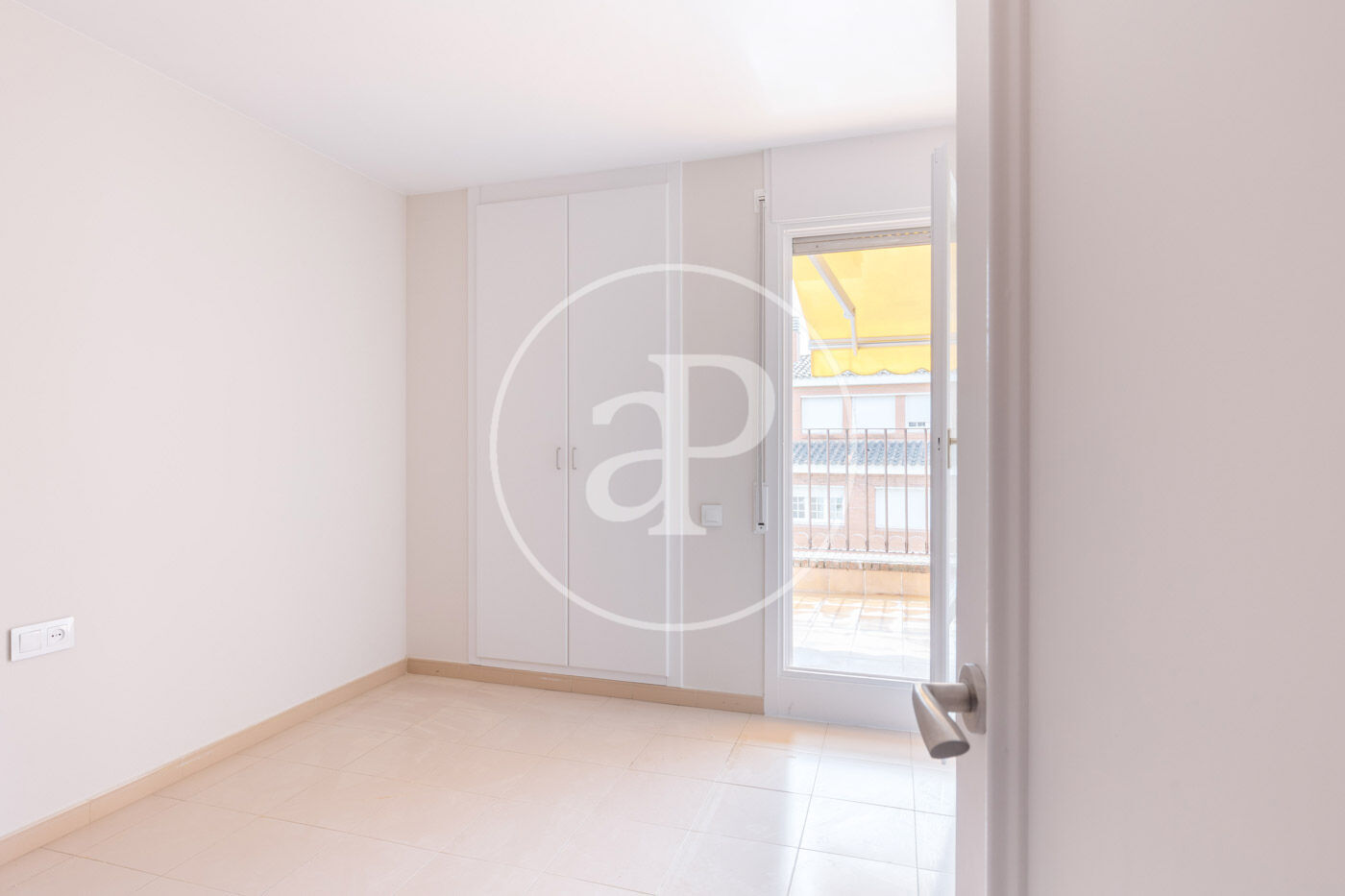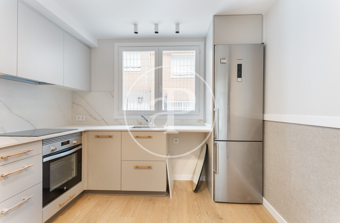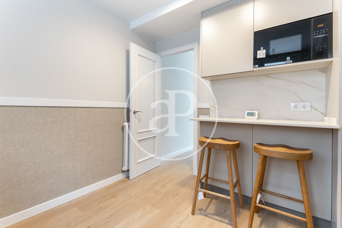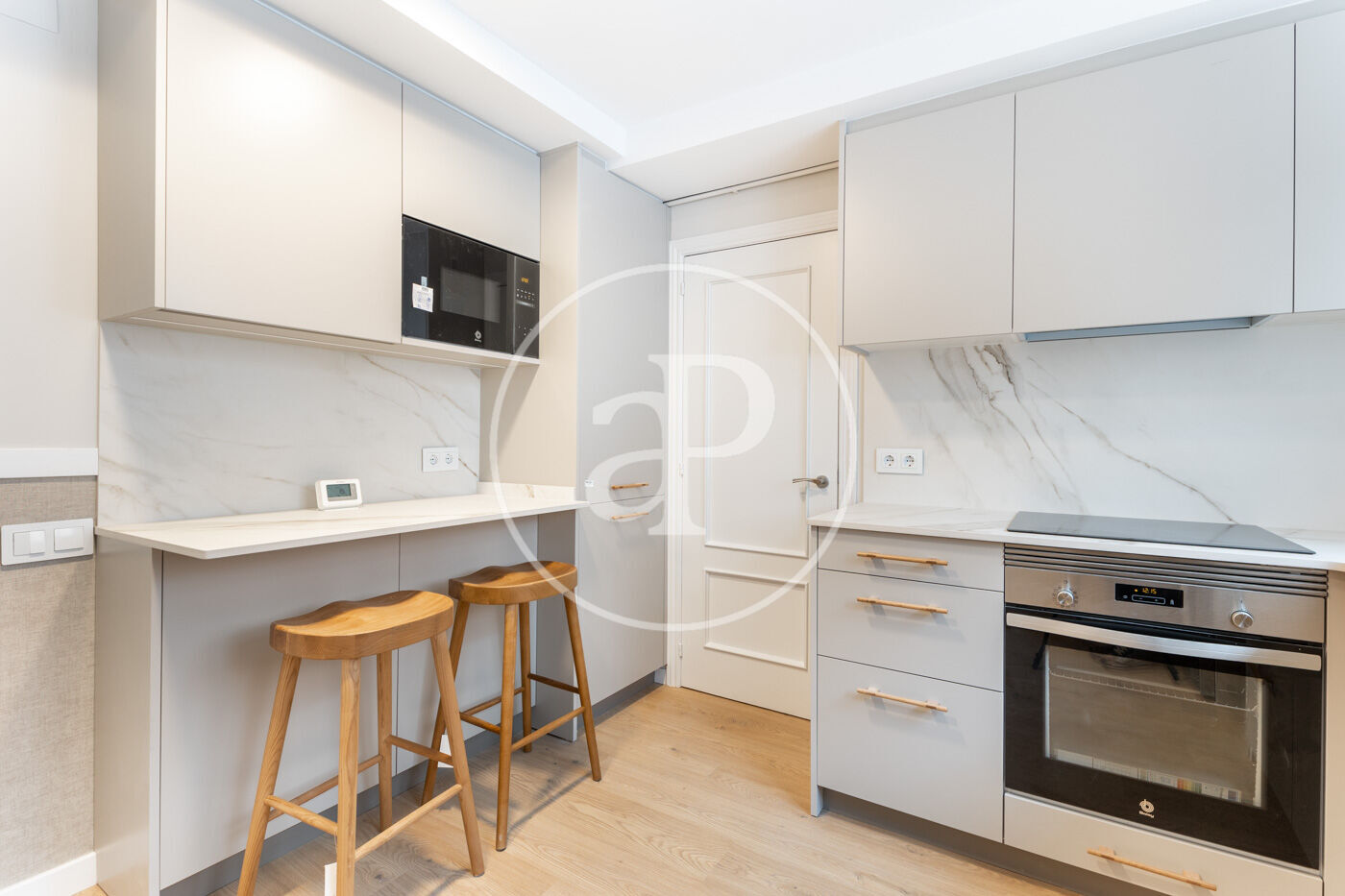 In Diputación Street, near Rambla Catalunya and the beautiful Passeig de Gracia, we find this 90sqm property recently renovated and furnished with a modern, minimalist, sober and elegant design. It is located in a regal state and is very bright, quiet, silent and cozy. In addition, it is very well connected with public transport. When coming into the day area of the house we find a large kitchen opened to the living room and equipped with high-quality appliances, cupboards with a lot of storage space and a table that can be moved to the bright living room with access to a typical balcony of Eixample, with double glazing and restored blinds. A high corridor with shelves from the floor to the ceiling and a storage room separates the night area of the house. In this area, we find a toilet, two double bedrooms that share an interior terrace and one of them en suite with light in the head of the bed and the utility room equipped with a washing machine. The floor keeps original catalan high ceilings and wooden beams that give an authenticity essence to the property. It has oak sliding doors in several rooms, micro cement floors and hot and cold air conditioning. The whole house plays with the contrasts of materials, basically with the wood, metal and brick and is ideal for a couple or a family who wants to live in one of the most representative areas of Barcelona. Available at the end of December.  * In compliance with Law 12/2023 and Law 18/2007, we inform that