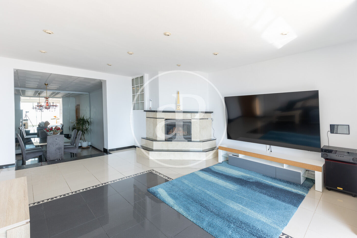 Spacious living-dining room with fireplace and large windows