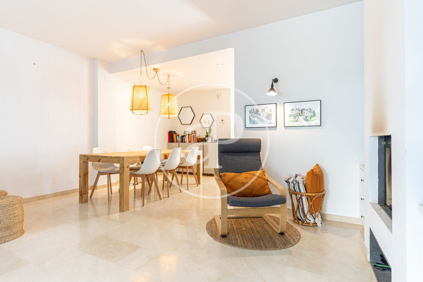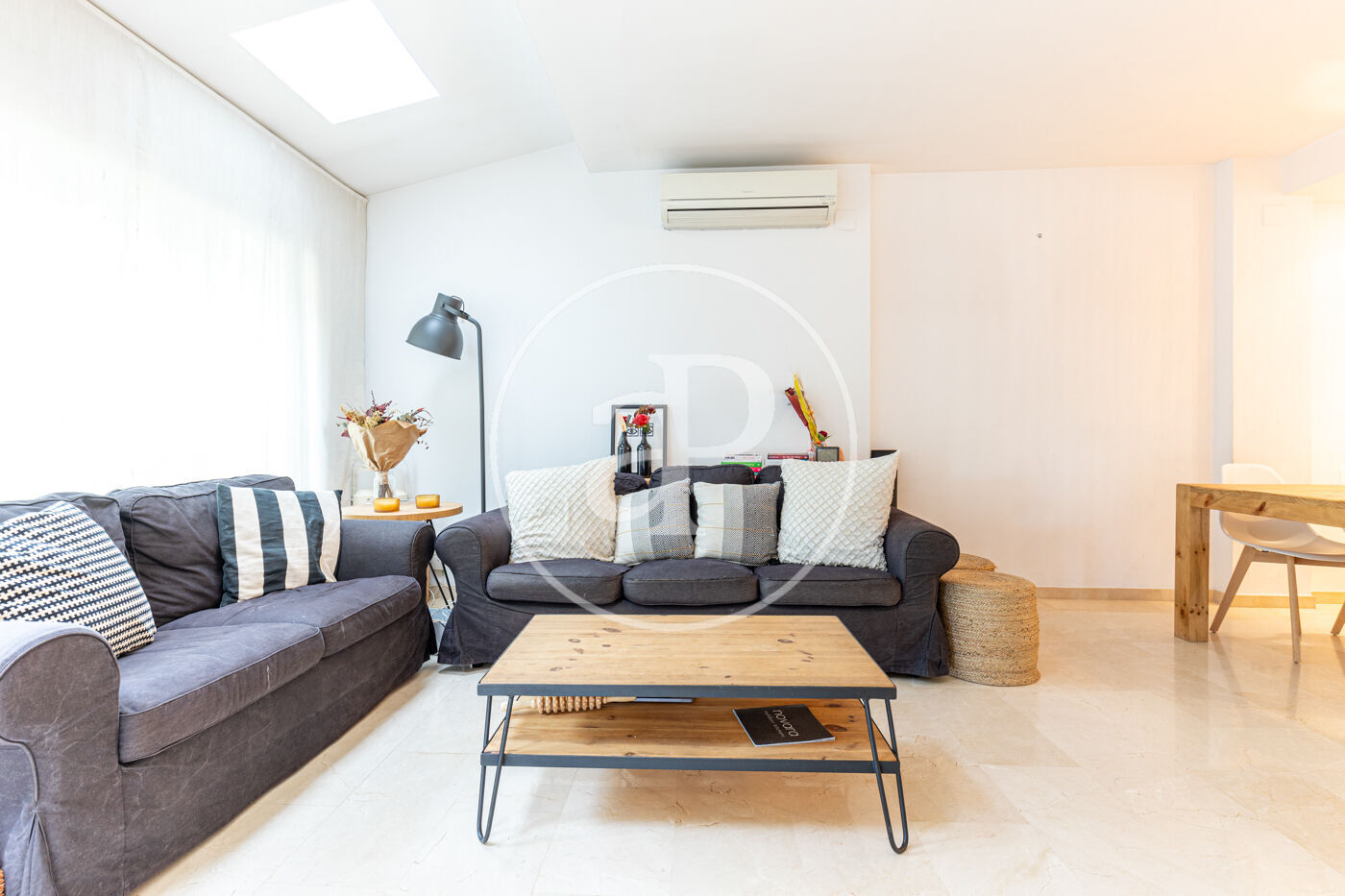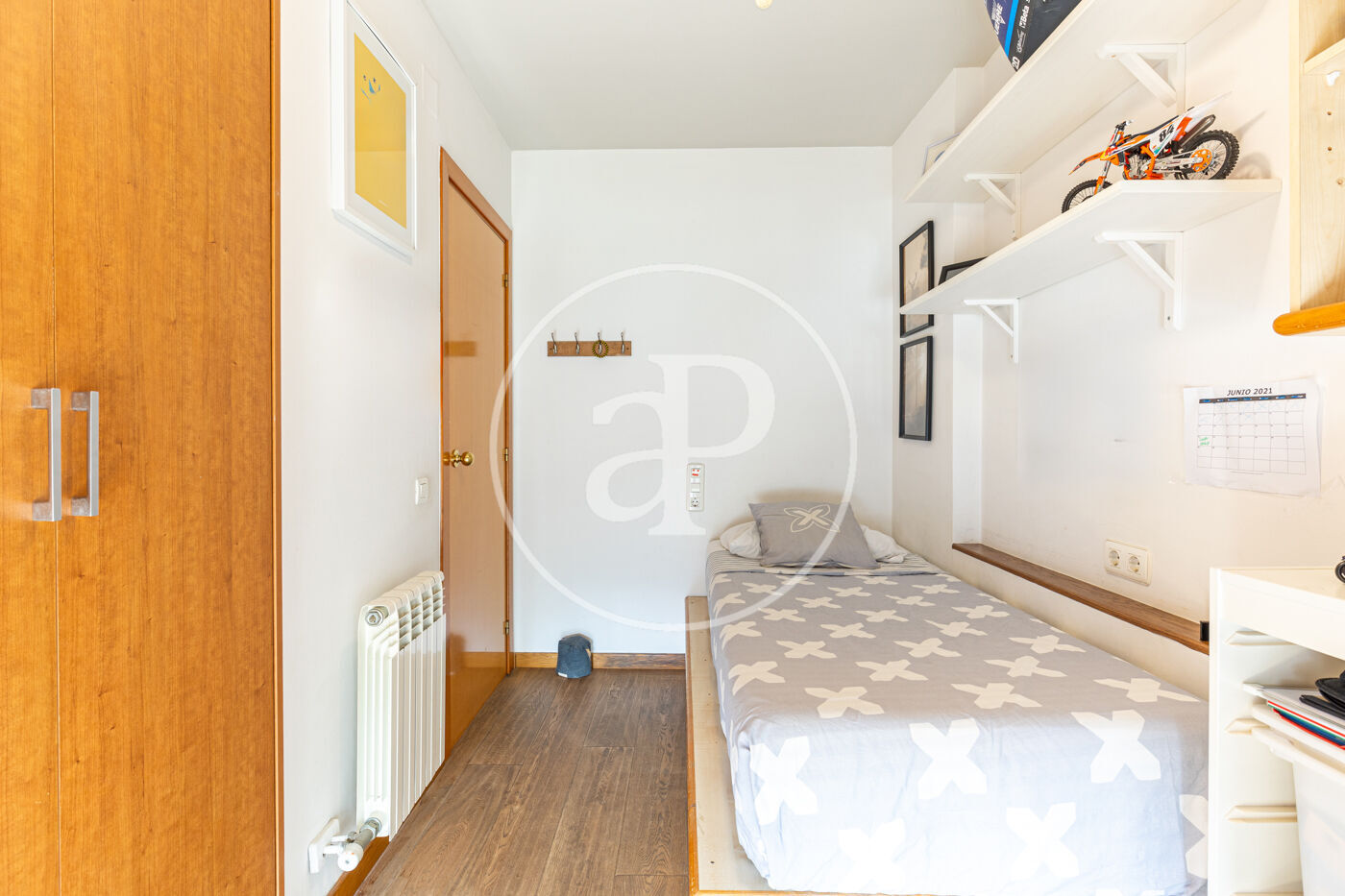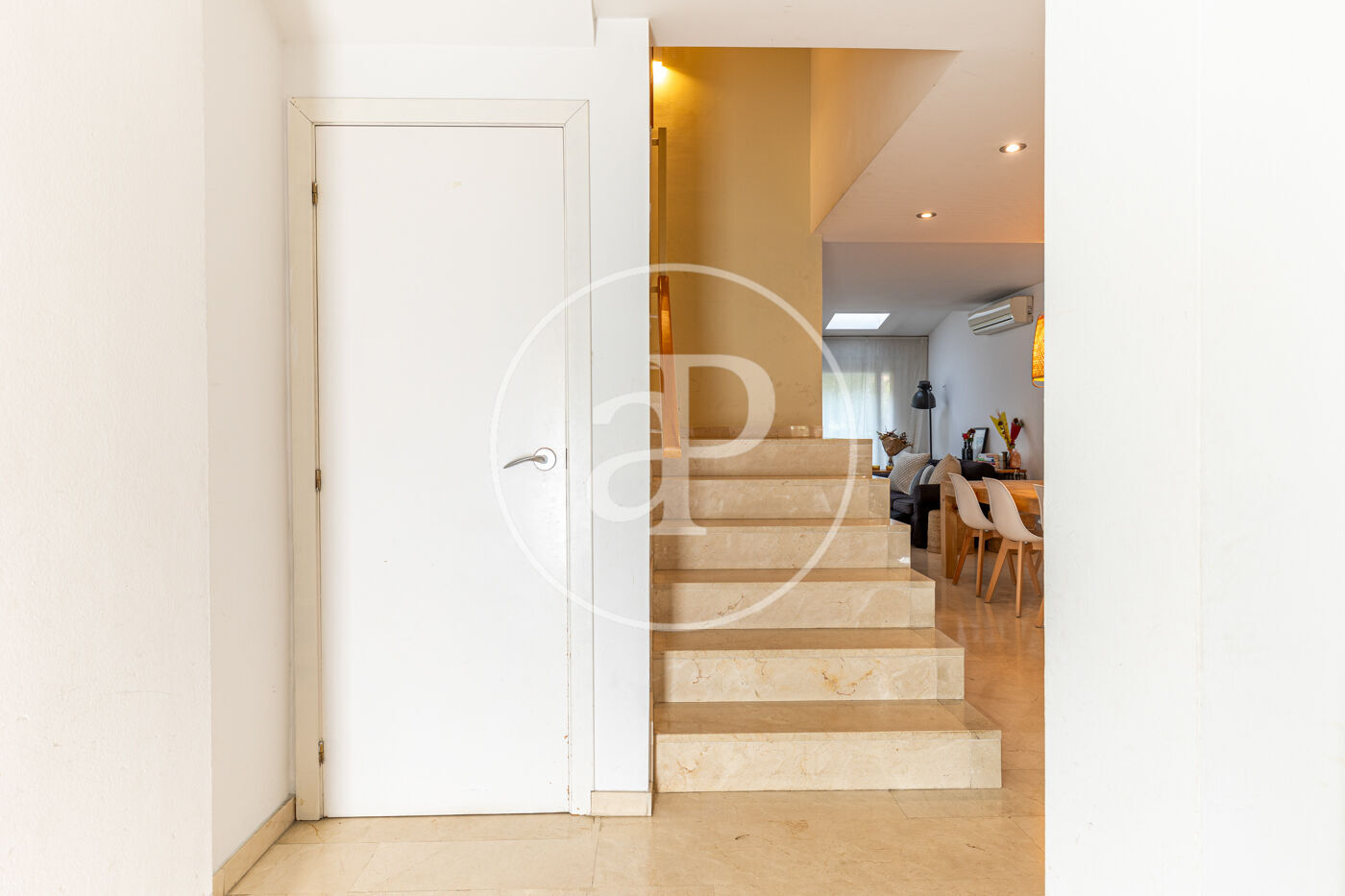 From Aproperties we are pleased to present you EXCLUSIVELY, this magnificent designer duplex penthouse located in the exclusive area of Can Magi. The property is located in an estate of 1998 and has been updated by its owners, providing it with quality finishes that convey a comfortable and cozy atmosphere. Its location is unbeatable, as it is in a quiet area with mountain views, and at the same time it is just a few minutes drive from the center of Sant Cugat del Vallés.  The house of 124m² built, which are developed as follows: 76.30m² on the ground floor to which are added a small terrace of 3.70m², 33m² on the second floor with sloping ceilings, plus a super terrace of 25.80m² with views of the most characteristic mountains of the Vallés.  The whole apartment is completely exterior, with privileged orientation that bathes each of the rooms in natural light. It is located in a very quiet community of neighbors with gardens and swimming pool.   We begin our tour after crossing the hall, equipped with courtesy closets. We move towards the spacious living room with large windows, a wall with a large window joins the fully equipped kitchen with access to a covered terrace ideal for two people to eat and enjoy the views. On this floor, also develops the sleeping area consisting of a double bedroom (originally two single rooms) with designer closets and a bathroom. Finally, the floor is completed with a water area.   Returning to the living room we find a beautiful staircase that combines steel and wood and leads to the upper floor. There is a small hall that divides the floor into areas, the suite that has fitted closets and a wall with natural stone cladding and an elegant and original design bathroom clad in marble, which includes a large bathtub and a spacious space with two showers. There is also a single bedroom with fitted closets and a large sun terrace with artificial grass, views that invite summer evenings, barbecues, etc..  The property has a security entrance door, parquet floors, aluminum windows with double glazing and motorized blinds controlled with home automation. The kitchen is fully equipped with oven, ceramic hob and extractor hood. It has cold-heat pump on all floors.  The price includes two parking spaces and a storage room.