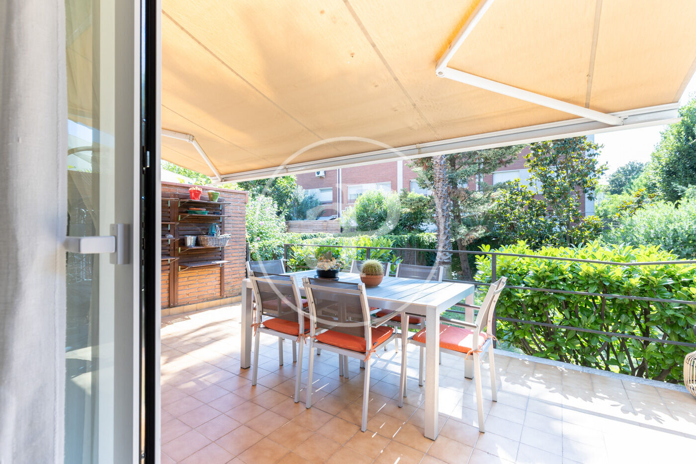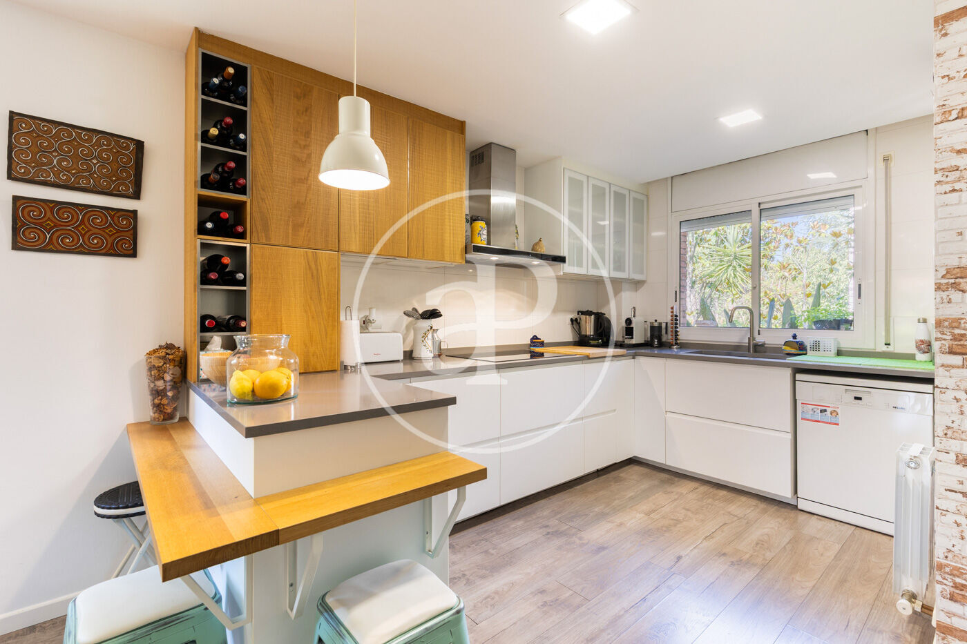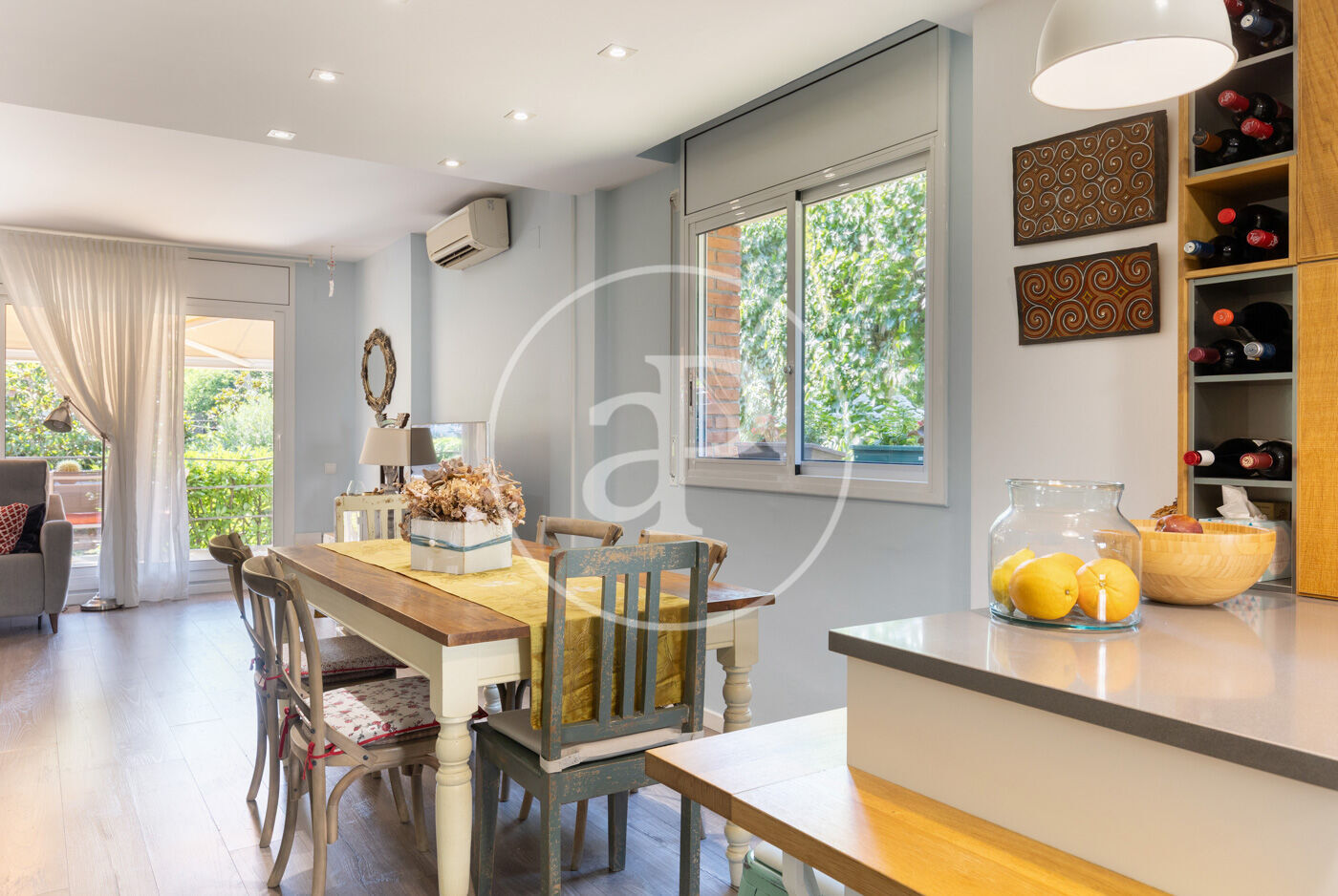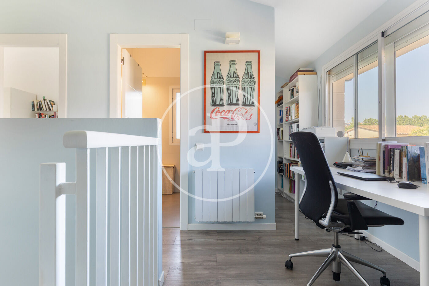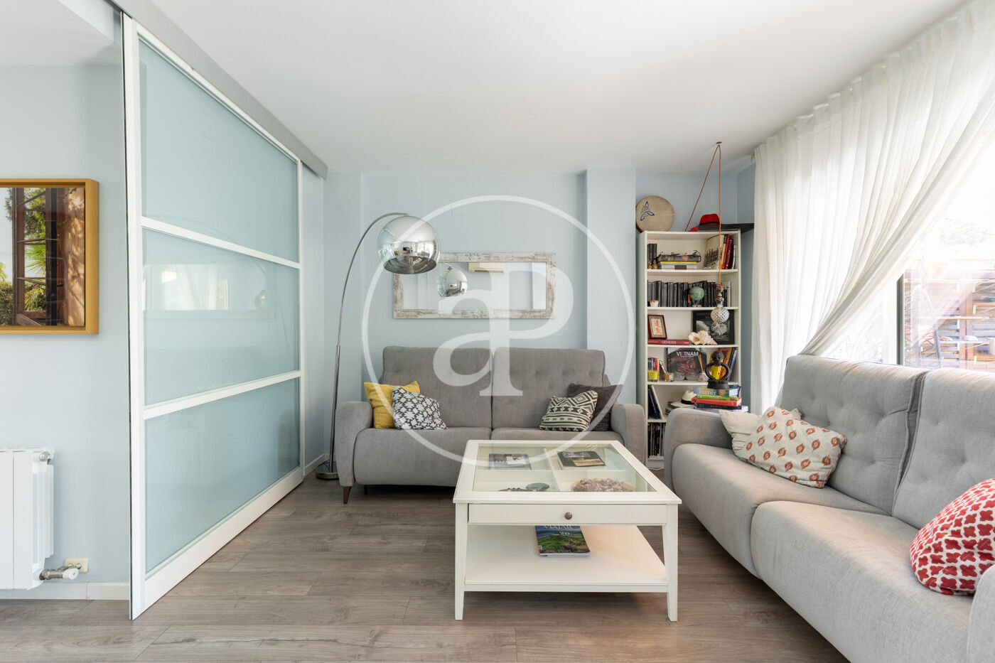 From Aproperties we are pleased to present you EXCLUSIVELY, this magnificent designer duplex penthouse located in the exclusive area of Can Magi. The property is located in an estate of 1998 and has been updated by its owners, providing it with quality finishes that convey a comfortable and cozy atmosphere. Its location is unbeatable, as it is in a quiet area with mountain views, and at the same time it is just a few minutes drive from the center of Sant Cugat del Vallés.  The house of 124m² built, which are developed as follows: 76.30m² on the ground floor to which are added a small terrace of 3.70m², 33m² on the second floor with sloping ceilings, plus a super terrace of 25.80m² with views of the most characteristic mountains of the Vallés.  The whole apartment is completely exterior, with privileged orientation that bathes each of the rooms in natural light. It is located in a very quiet community of neighbors with gardens and swimming pool.   We begin our tour after crossing the hall, equipped with courtesy closets. We move towards the spacious living room with large windows, a wall with a large window joins the fully equipped kitchen with access to a covered terrace ideal for two people to eat and enjoy the views. On this floor, also develops the sleeping area consisting of a double bedroom (originally two single rooms) with designer closets and a bathroom. Finally, the floor is completed with a water area.   Returning to the living room we find a beautiful staircase that combines steel and wood and leads to the upper floor. There is a small hall that divides the floor into areas, the suite that has fitted closets and a wall with natural stone cladding and an elegant and original design bathroom clad in marble, which includes a large bathtub and a spacious space with two showers. There is also a single bedroom with fitted closets and a large sun terrace with artificial grass, views that invite summer evenings, barbecues, etc..  The property has a security entrance door, parquet floors, aluminum windows with double glazing and motorized blinds controlled with home automation. The kitchen is fully equipped with oven, ceramic hob and extractor hood. It has cold-heat pump on all floors.  The price includes two parking spaces and a storage room.