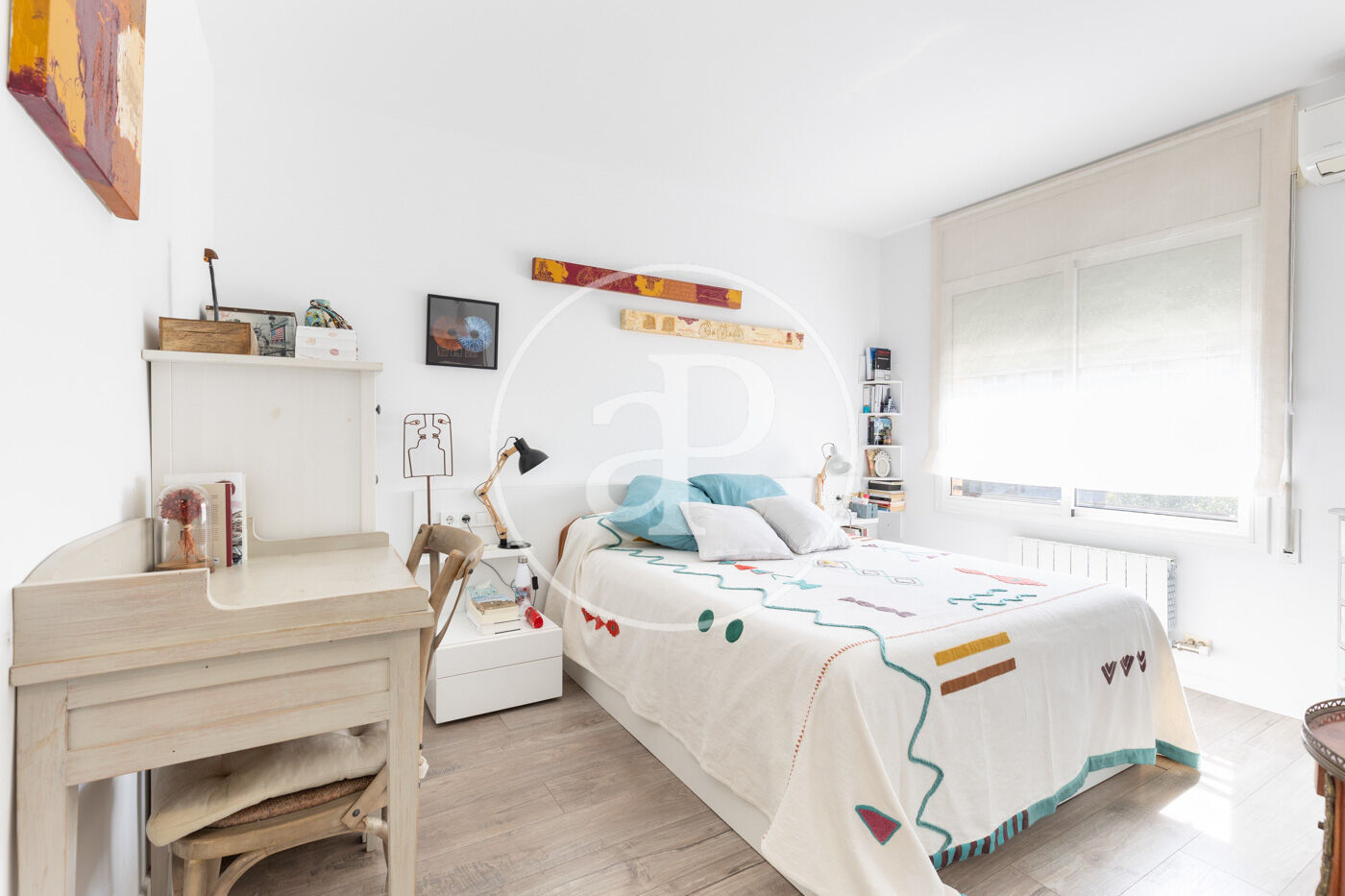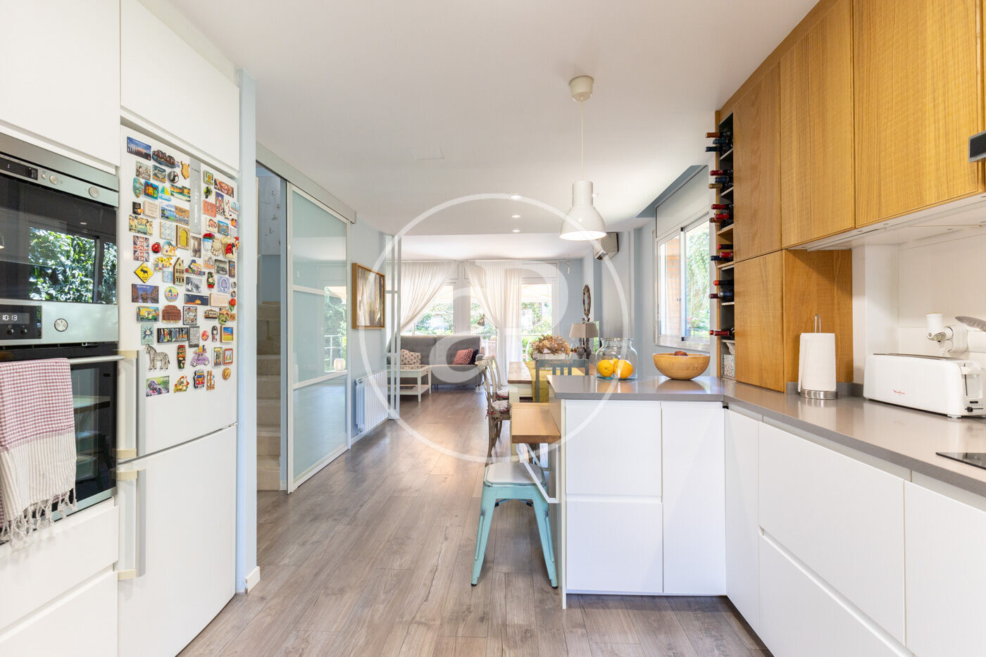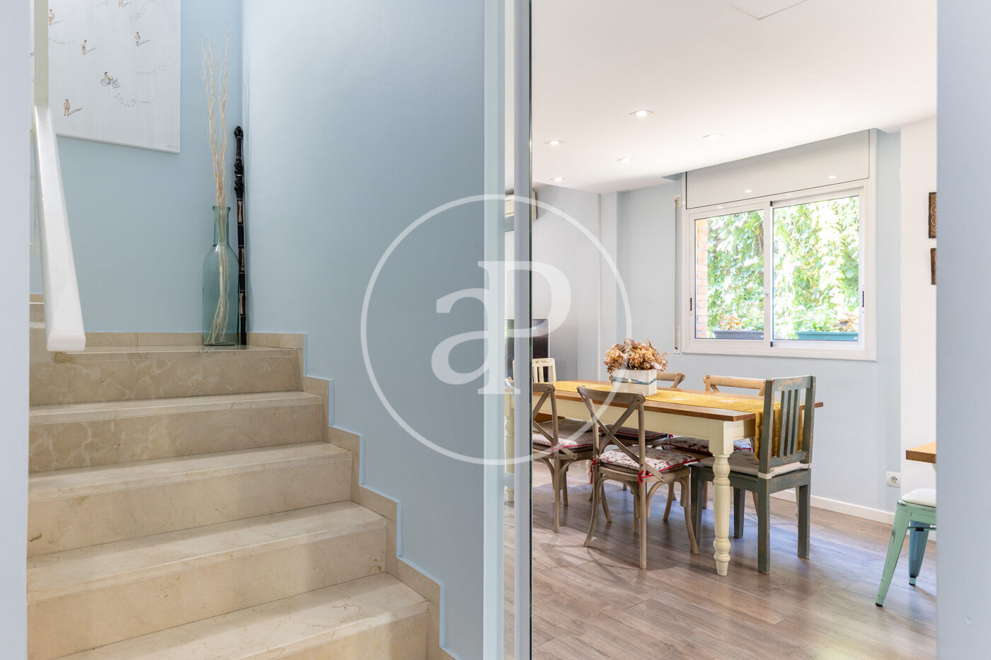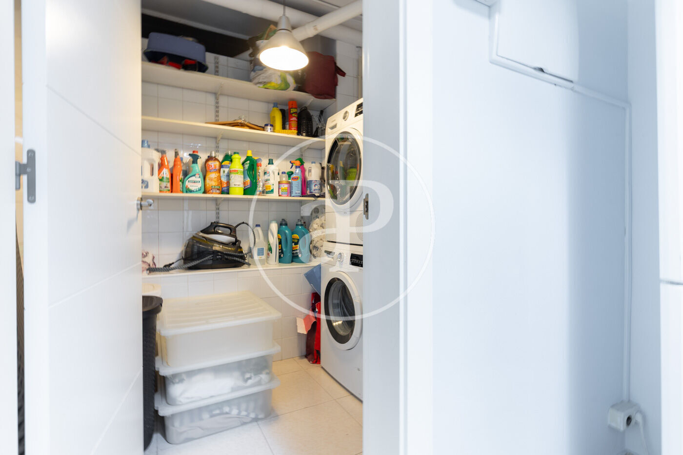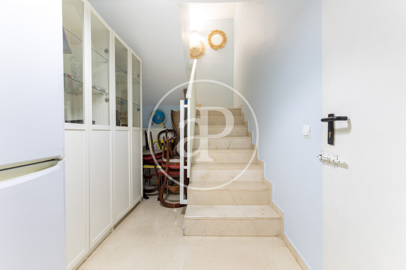 From Aproperties we are pleased to present you EXCLUSIVELY, this magnificent designer duplex penthouse located in the exclusive area of Can Magi. The property is located in an estate of 1998 and has been updated by its owners, providing it with quality finishes that convey a comfortable and cozy atmosphere. Its location is unbeatable, as it is in a quiet area with mountain views, and at the same time it is just a few minutes drive from the center of Sant Cugat del Vallés.  The house of 124m² built, which are developed as follows: 76.30m² on the ground floor to which are added a small terrace of 3.70m², 33m² on the second floor with sloping ceilings, plus a super terrace of 25.80m² with views of the most characteristic mountains of the Vallés.  The whole apartment is completely exterior, with privileged orientation that bathes each of the rooms in natural light. It is located in a very quiet community of neighbors with gardens and swimming pool.   We begin our tour after crossing the hall, equipped with courtesy closets. We move towards the spacious living room with large windows, a wall with a large window joins the fully equipped kitchen with access to a covered terrace ideal for two people to eat and enjoy the views. On this floor, also develops the sleeping area consisting of a double bedroom (originally two single rooms) with designer closets and a bathroom. Finally, the floor is completed with a water area.   Returning to the living room we find a beautiful staircase that combines steel and wood and leads to the upper floor. There is a small hall that divides the floor into areas, the suite that has fitted closets and a wall with natural stone cladding and an elegant and original design bathroom clad in marble, which includes a large bathtub and a spacious space with two showers. There is also a single bedroom with fitted closets and a large sun terrace with artificial grass, views that invite summer evenings, barbecues, etc..  The property has a security entrance door, parquet floors, aluminum windows with double glazing and motorized blinds controlled with home automation. The kitchen is fully equipped with oven, ceramic hob and extractor hood. It has cold-heat pump on all floors.  The price includes two parking spaces and a storage room.