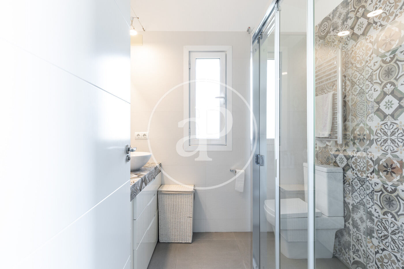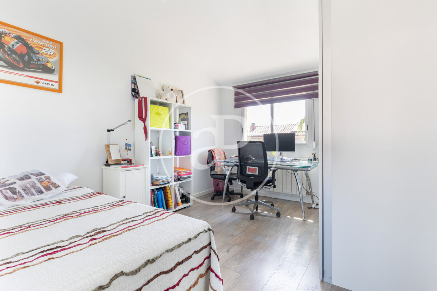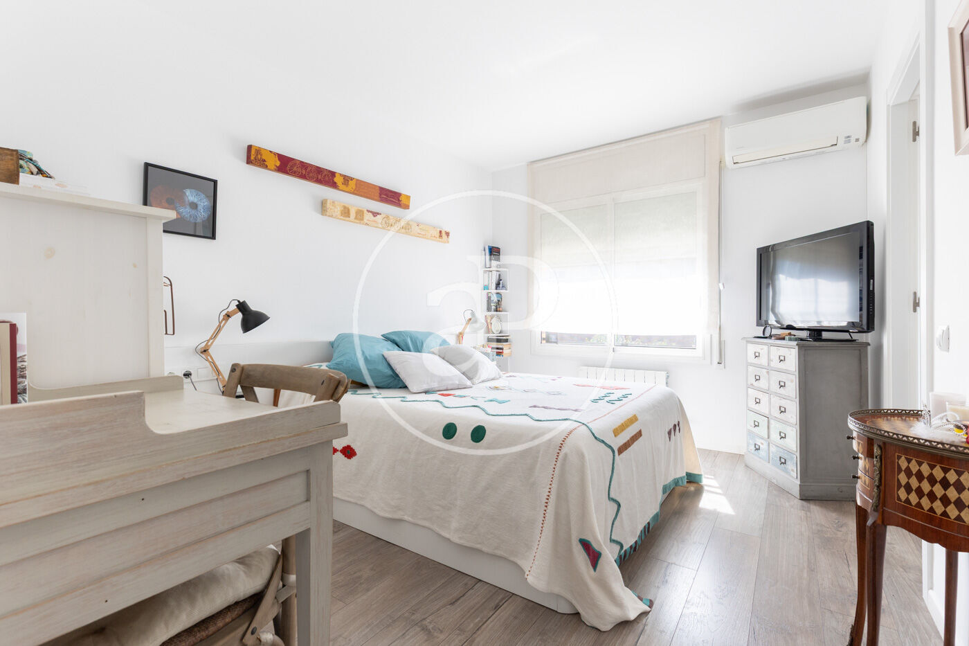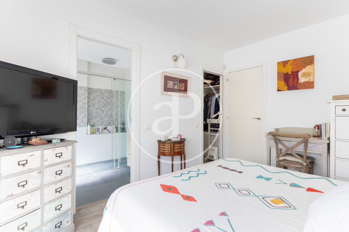 From Aproperties we are pleased to present you EXCLUSIVELY, this magnificent designer duplex penthouse located in the exclusive area of Can Magi. The property is located in an estate of 1998 and has been updated by its owners, providing it with quality finishes that convey a comfortable and cozy atmosphere. Its location is unbeatable, as it is in a quiet area with mountain views, and at the same time it is just a few minutes drive from the center of Sant Cugat del Vallés.  The house of 124m² built, which are developed as follows: 76.30m² on the ground floor to which are added a small terrace of 3.70m², 33m² on the second floor with sloping ceilings, plus a super terrace of 25.80m² with views of the most characteristic mountains of the Vallés.  The whole apartment is completely exterior, with privileged orientation that bathes each of the rooms in natural light. It is located in a very quiet community of neighbors with gardens and swimming pool.   We begin our tour after crossing the hall, equipped with courtesy closets. We move towards the spacious living room with large windows, a wall with a large window joins the fully equipped kitchen with access to a covered terrace ideal for two people to eat and enjoy the views. On this floor, also develops the sleeping area consisting of a double bedroom (originally two single rooms) with designer closets and a bathroom. Finally, the floor is completed with a water area.   Returning to the living room we find a beautiful staircase that combines steel and wood and leads to the upper floor. There is a small hall that divides the floor into areas, the suite that has fitted closets and a wall with natural stone cladding and an elegant and original design bathroom clad in marble, which includes a large bathtub and a spacious space with two showers. There is also a single bedroom with fitted closets and a large sun terrace with artificial grass, views that invite summer evenings, barbecues, etc..  The property has a security entrance door, parquet floors, aluminum windows with double glazing and motorized blinds controlled with home automation. The kitchen is fully equipped with oven, ceramic hob and extractor hood. It has cold-heat pump on all floors.  The price includes two parking spaces and a storage room.