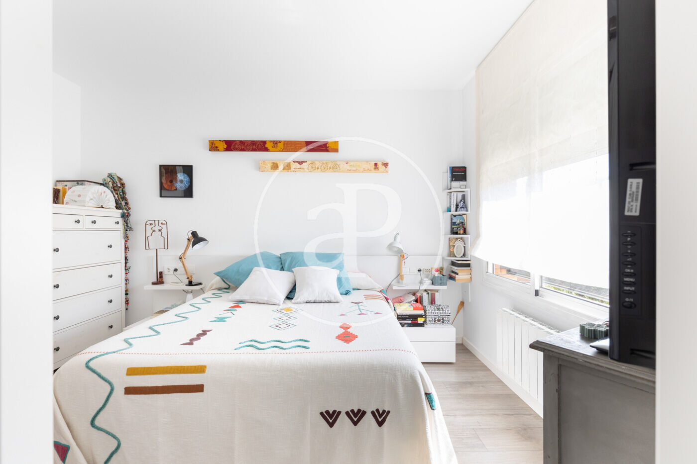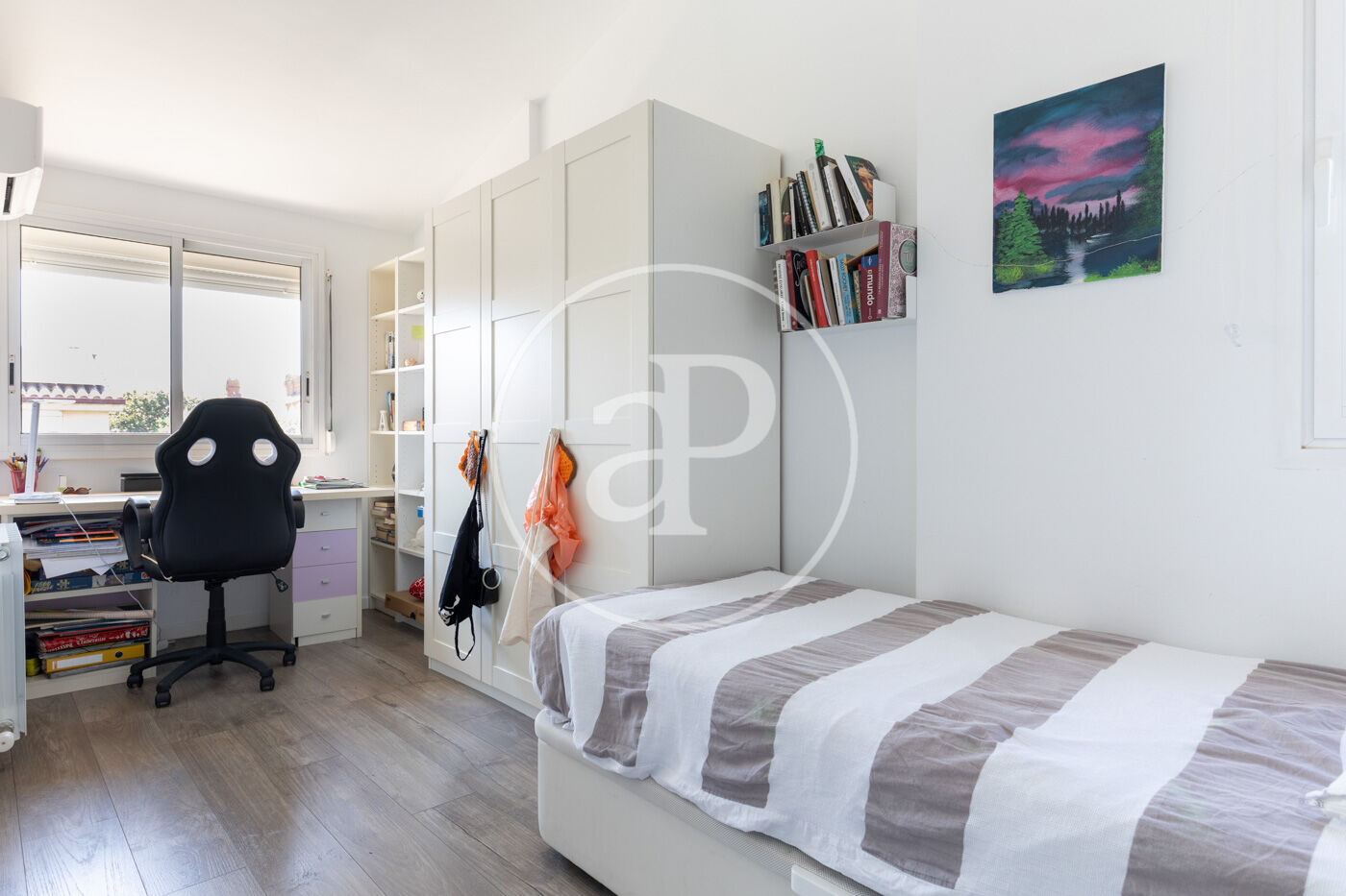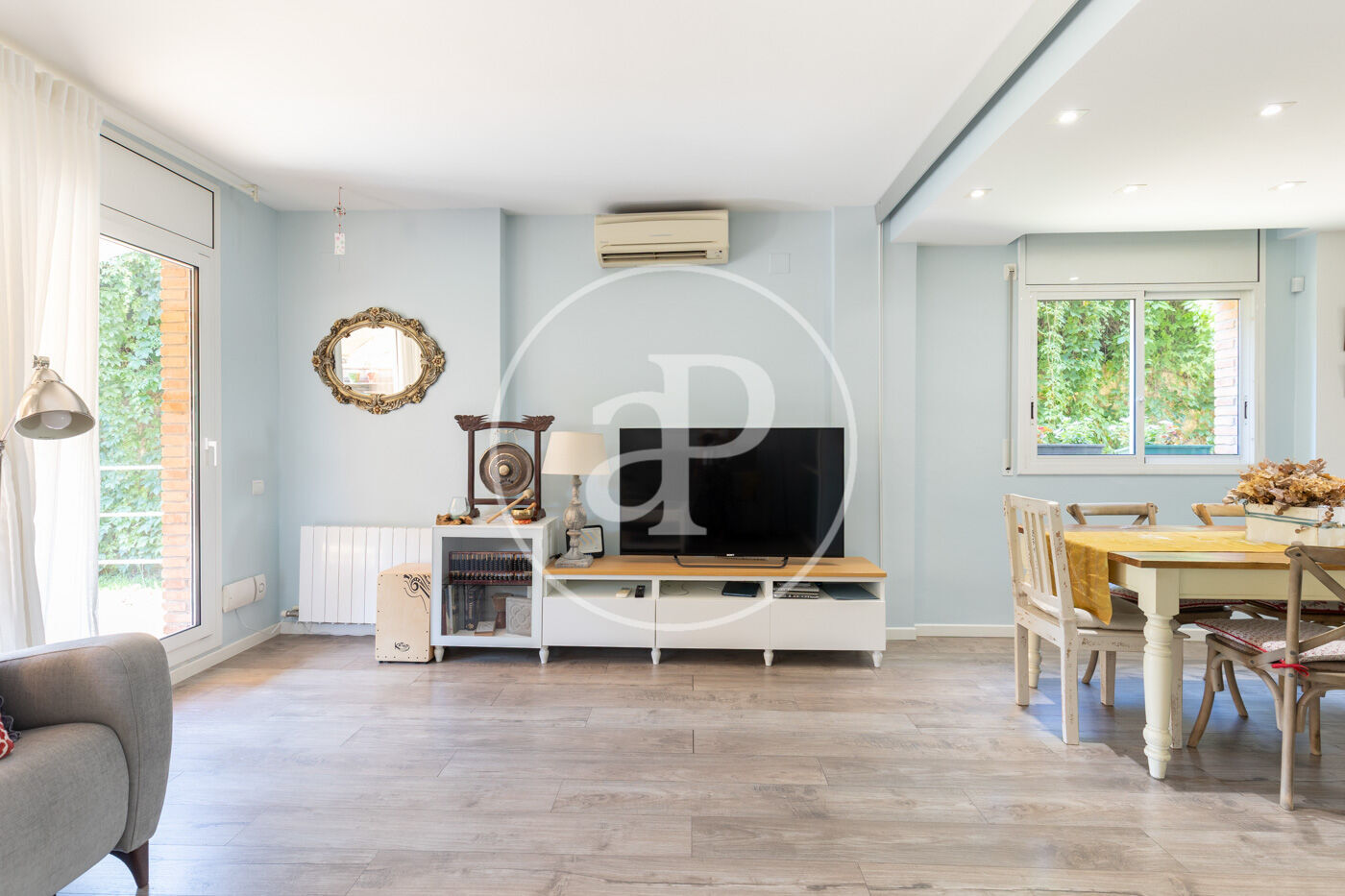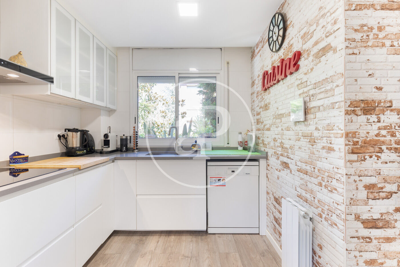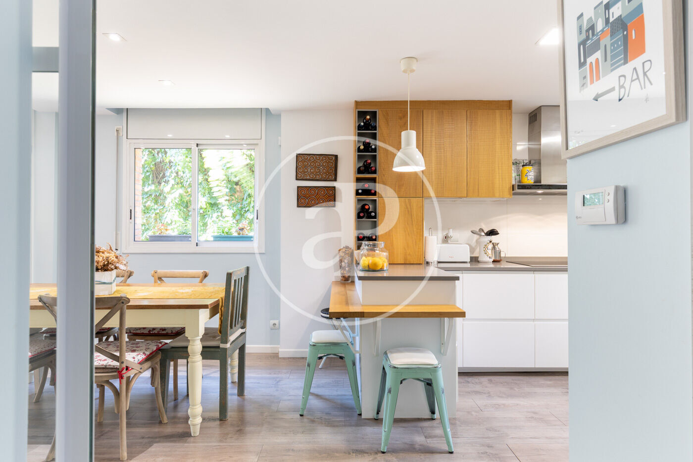 From Aproperties we are pleased to present you EXCLUSIVELY, this magnificent designer duplex penthouse located in the exclusive area of Can Magi. The property is located in an estate of 1998 and has been updated by its owners, providing it with quality finishes that convey a comfortable and cozy atmosphere. Its location is unbeatable, as it is in a quiet area with mountain views, and at the same time it is just a few minutes drive from the center of Sant Cugat del Vallés.  The house of 124m² built, which are developed as follows: 76.30m² on the ground floor to which are added a small terrace of 3.70m², 33m² on the second floor with sloping ceilings, plus a super terrace of 25.80m² with views of the most characteristic mountains of the Vallés.  The whole apartment is completely exterior, with privileged orientation that bathes each of the rooms in natural light. It is located in a very quiet community of neighbors with gardens and swimming pool.   We begin our tour after crossing the hall, equipped with courtesy closets. We move towards the spacious living room with large windows, a wall with a large window joins the fully equipped kitchen with access to a covered terrace ideal for two people to eat and enjoy the views. On this floor, also develops the sleeping area consisting of a double bedroom (originally two single rooms) with designer closets and a bathroom. Finally, the floor is completed with a water area.   Returning to the living room we find a beautiful staircase that combines steel and wood and leads to the upper floor. There is a small hall that divides the floor into areas, the suite that has fitted closets and a wall with natural stone cladding and an elegant and original design bathroom clad in marble, which includes a large bathtub and a spacious space with two showers. There is also a single bedroom with fitted closets and a large sun terrace with artificial grass, views that invite summer evenings, barbecues, etc..  The property has a security entrance door, parquet floors, aluminum windows with double glazing and motorized blinds controlled with home automation. The kitchen is fully equipped with oven, ceramic hob and extractor hood. It has cold-heat pump on all floors.  The price includes two parking spaces and a storage room.