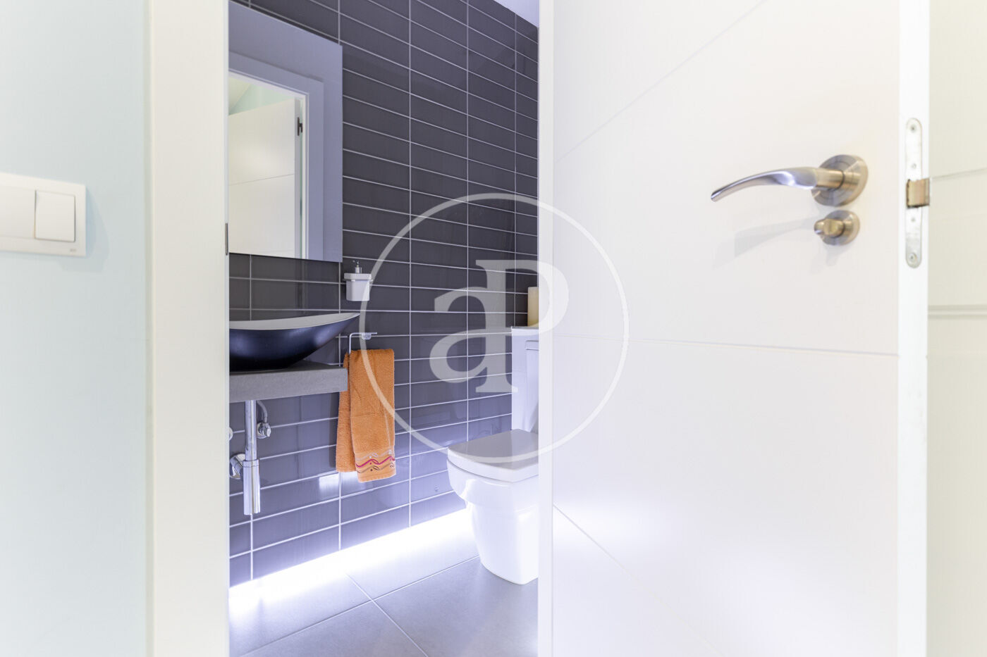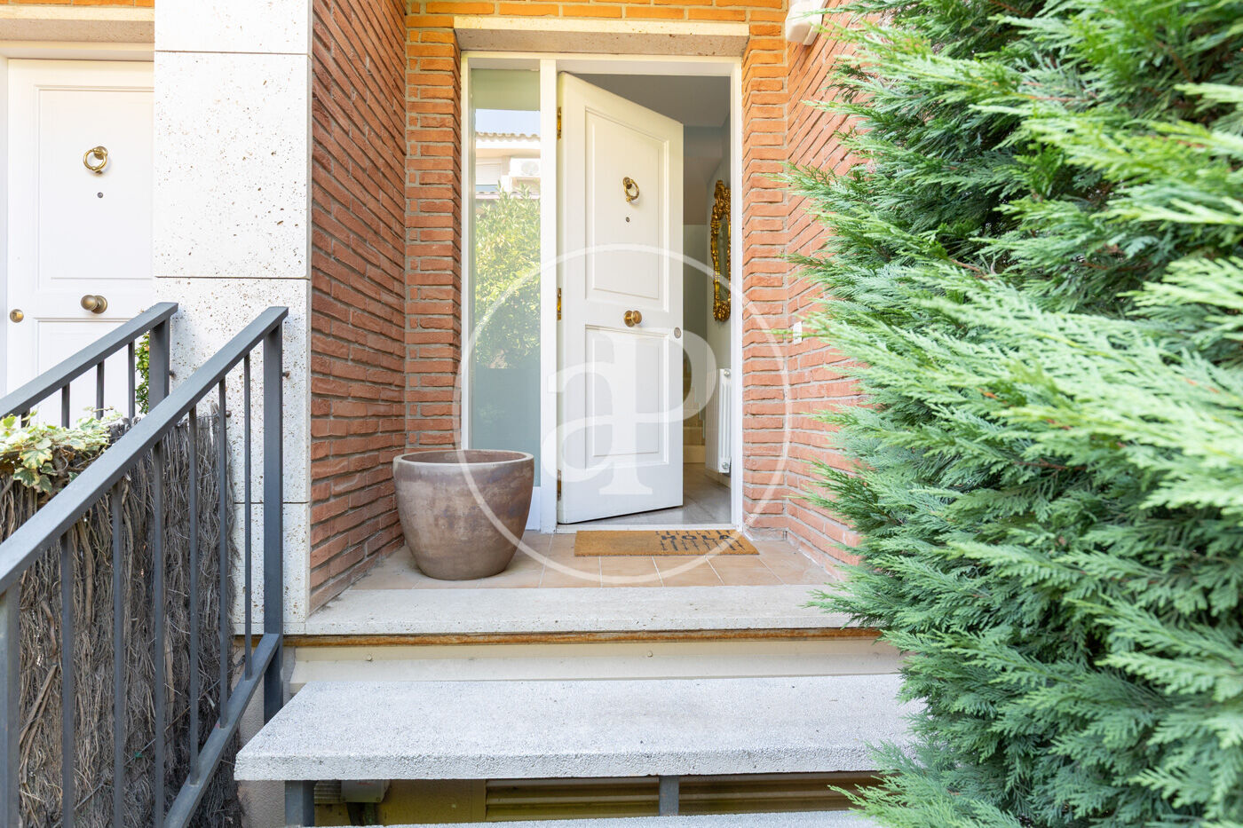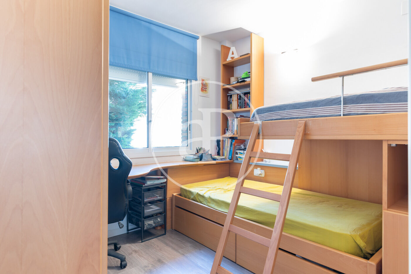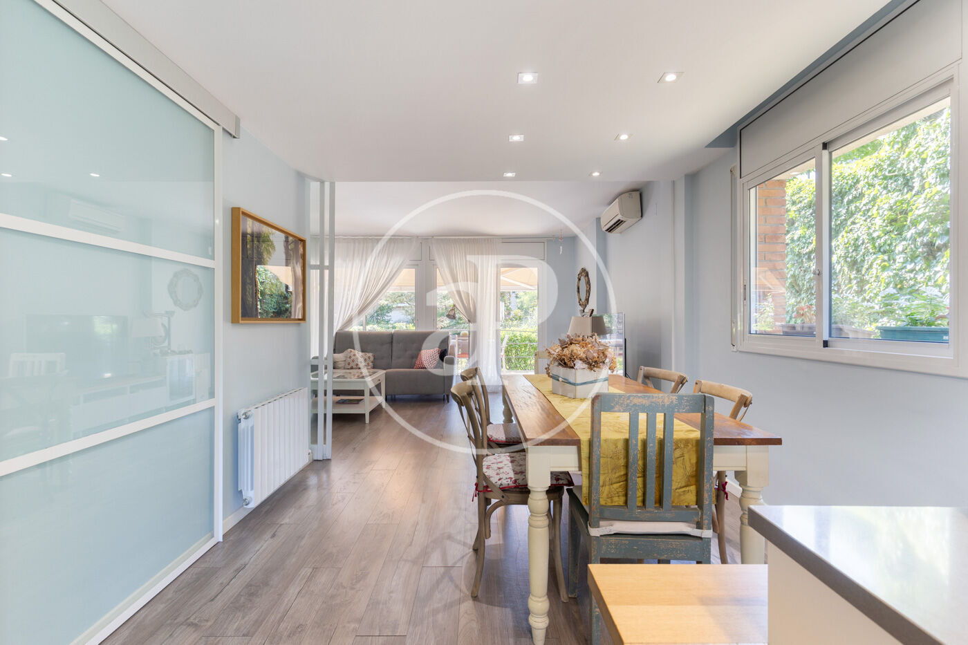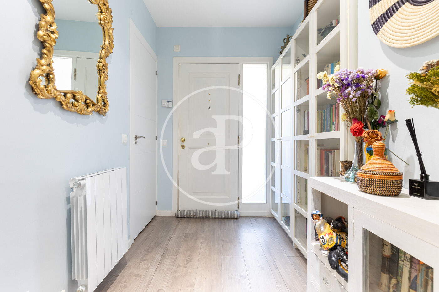 From Aproperties we are pleased to present you EXCLUSIVELY, this magnificent designer duplex penthouse located in the exclusive area of Can Magi. The property is located in an estate of 1998 and has been updated by its owners, providing it with quality finishes that convey a comfortable and cozy atmosphere. Its location is unbeatable, as it is in a quiet area with mountain views, and at the same time it is just a few minutes drive from the center of Sant Cugat del Vallés.  The house of 124m² built, which are developed as follows: 76.30m² on the ground floor to which are added a small terrace of 3.70m², 33m² on the second floor with sloping ceilings, plus a super terrace of 25.80m² with views of the most characteristic mountains of the Vallés.  The whole apartment is completely exterior, with privileged orientation that bathes each of the rooms in natural light. It is located in a very quiet community of neighbors with gardens and swimming pool.   We begin our tour after crossing the hall, equipped with courtesy closets. We move towards the spacious living room with large windows, a wall with a large window joins the fully equipped kitchen with access to a covered terrace ideal for two people to eat and enjoy the views. On this floor, also develops the sleeping area consisting of a double bedroom (originally two single rooms) with designer closets and a bathroom. Finally, the floor is completed with a water area.   Returning to the living room we find a beautiful staircase that combines steel and wood and leads to the upper floor. There is a small hall that divides the floor into areas, the suite that has fitted closets and a wall with natural stone cladding and an elegant and original design bathroom clad in marble, which includes a large bathtub and a spacious space with two showers. There is also a single bedroom with fitted closets and a large sun terrace with artificial grass, views that invite summer evenings, barbecues, etc..  The property has a security entrance door, parquet floors, aluminum windows with double glazing and motorized blinds controlled with home automation. The kitchen is fully equipped with oven, ceramic hob and extractor hood. It has cold-heat pump on all floors.  The price includes two parking spaces and a storage room.