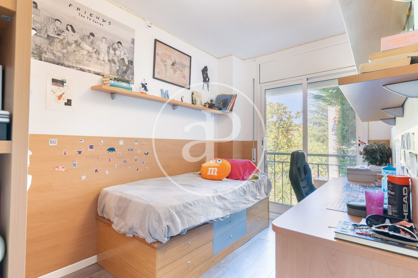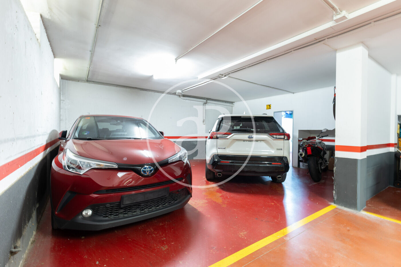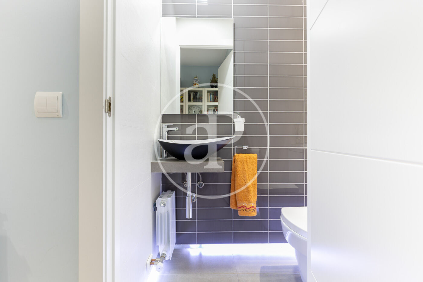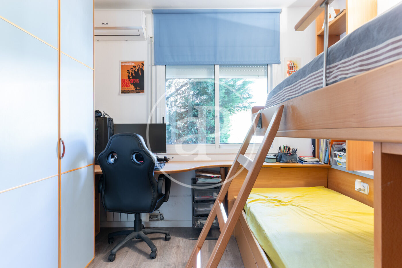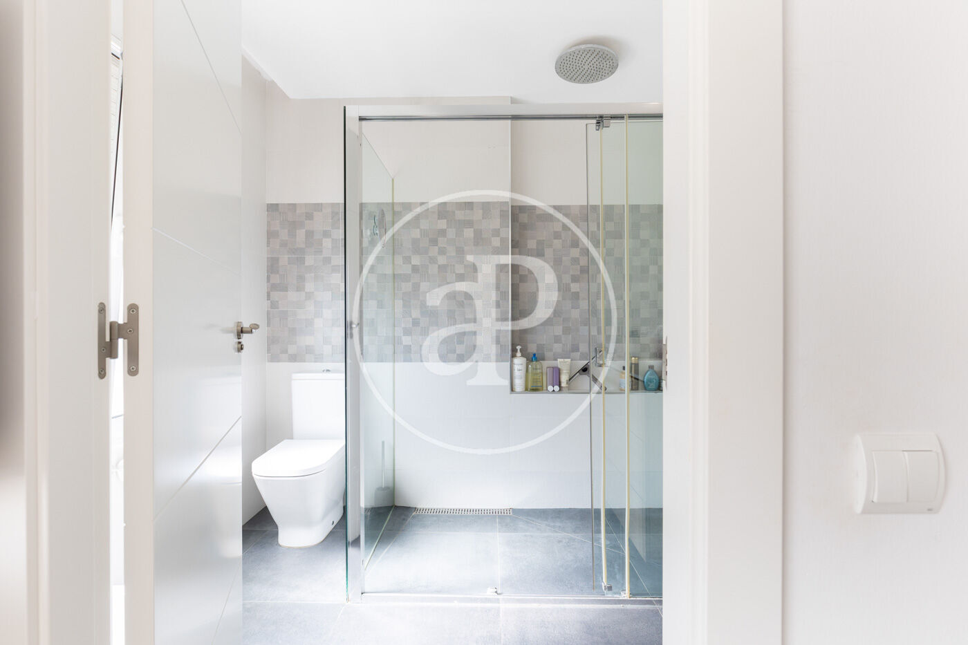From Aproperties we are pleased to present you EXCLUSIVELY, this magnificent designer duplex penthouse located in the exclusive area of Can Magi. The property is located in an estate of 1998 and has been updated by its owners, providing it with quality finishes that convey a comfortable and cozy atmosphere. Its location is unbeatable, as it is in a quiet area with mountain views, and at the same time it is just a few minutes drive from the center of Sant Cugat del Vallés.  The house of 124m² built, which are developed as follows: 76.30m² on the ground floor to which are added a small terrace of 3.70m², 33m² on the second floor with sloping ceilings, plus a super terrace of 25.80m² with views of the most characteristic mountains of the Vallés.  The whole apartment is completely exterior, with privileged orientation that bathes each of the rooms in natural light. It is located in a very quiet community of neighbors with gardens and swimming pool.   We begin our tour after crossing the hall, equipped with courtesy closets. We move towards the spacious living room with large windows, a wall with a large window joins the fully equipped kitchen with access to a covered terrace ideal for two people to eat and enjoy the views. On this floor, also develops the sleeping area consisting of a double bedroom (originally two single rooms) with designer closets and a bathroom. Finally, the floor is completed with a water area.   Returning to the living room we find a beautiful staircase that combines steel and wood and leads to the upper floor. There is a small hall that divides the floor into areas, the suite that has fitted closets and a wall with natural stone cladding and an elegant and original design bathroom clad in marble, which includes a large bathtub and a spacious space with two showers. There is also a single bedroom with fitted closets and a large sun terrace with artificial grass, views that invite summer evenings, barbecues, etc..  The property has a security entrance door, parquet floors, aluminum windows with double glazing and motorized blinds controlled with home automation. The kitchen is fully equipped with oven, ceramic hob and extractor hood. It has cold-heat pump on all floors.  The price includes two parking spaces and a storage room.