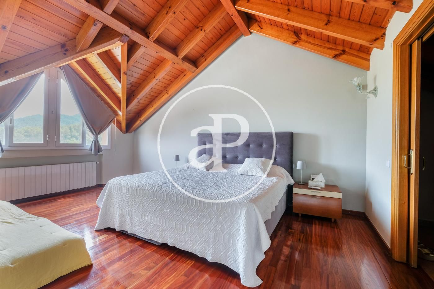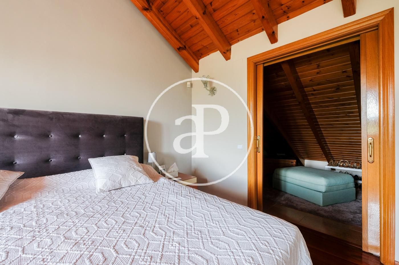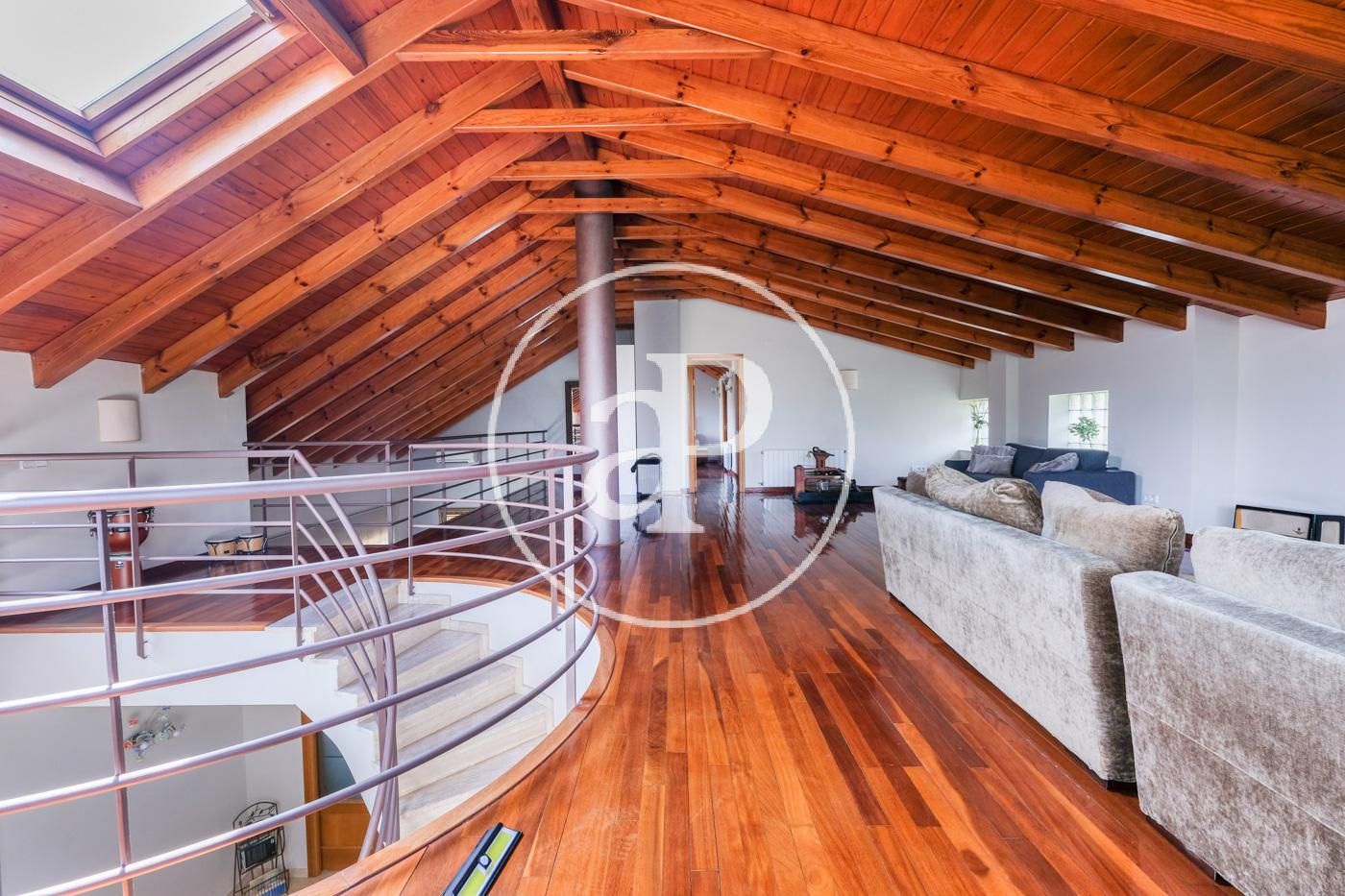 On the sloping first floor it has wooden ceilings, a large room ideal for a second living room, gym or games room. In addition, there is also a huge suite with a bathroom with bathtub and shower, dressing area and additional storage.