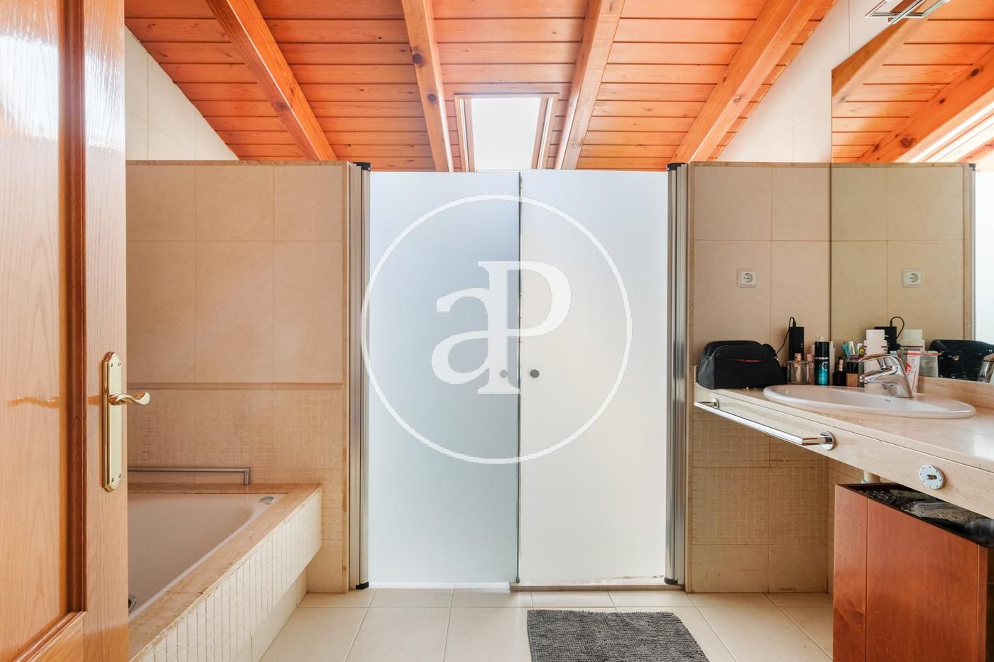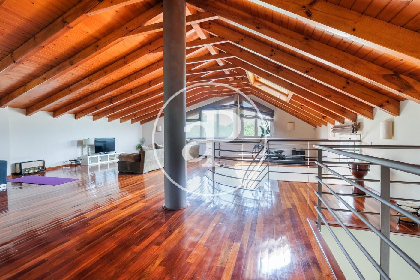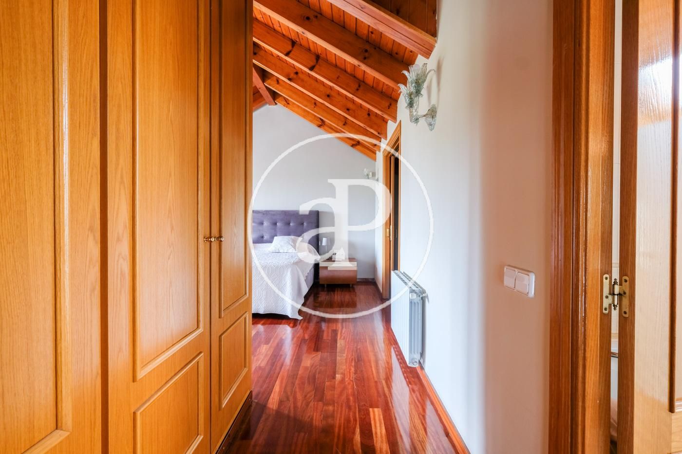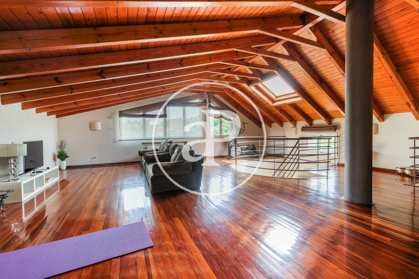 On the sloping first floor it has wooden ceilings, a large room ideal for a second living room, gym or games room. In addition, there is also a huge suite with a bathroom with bathtub and shower, dressing area and additional storage.