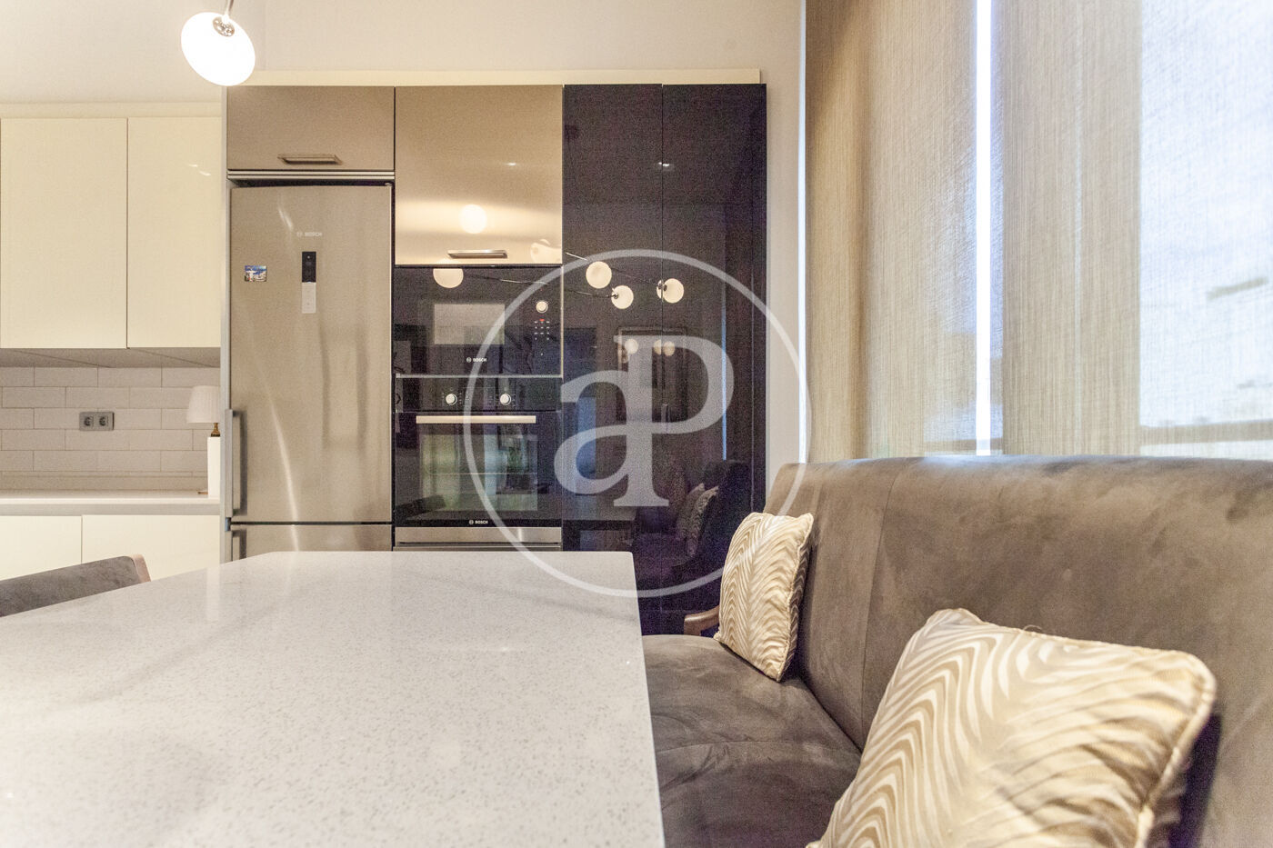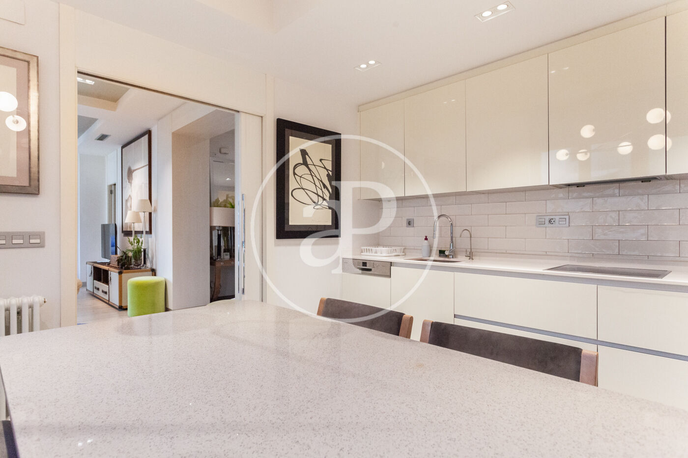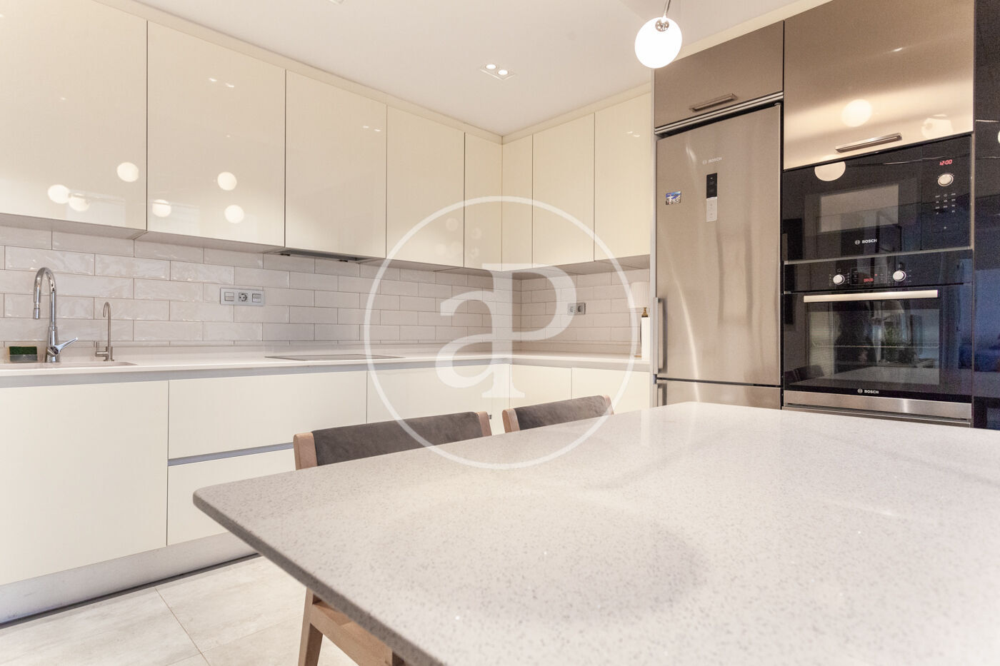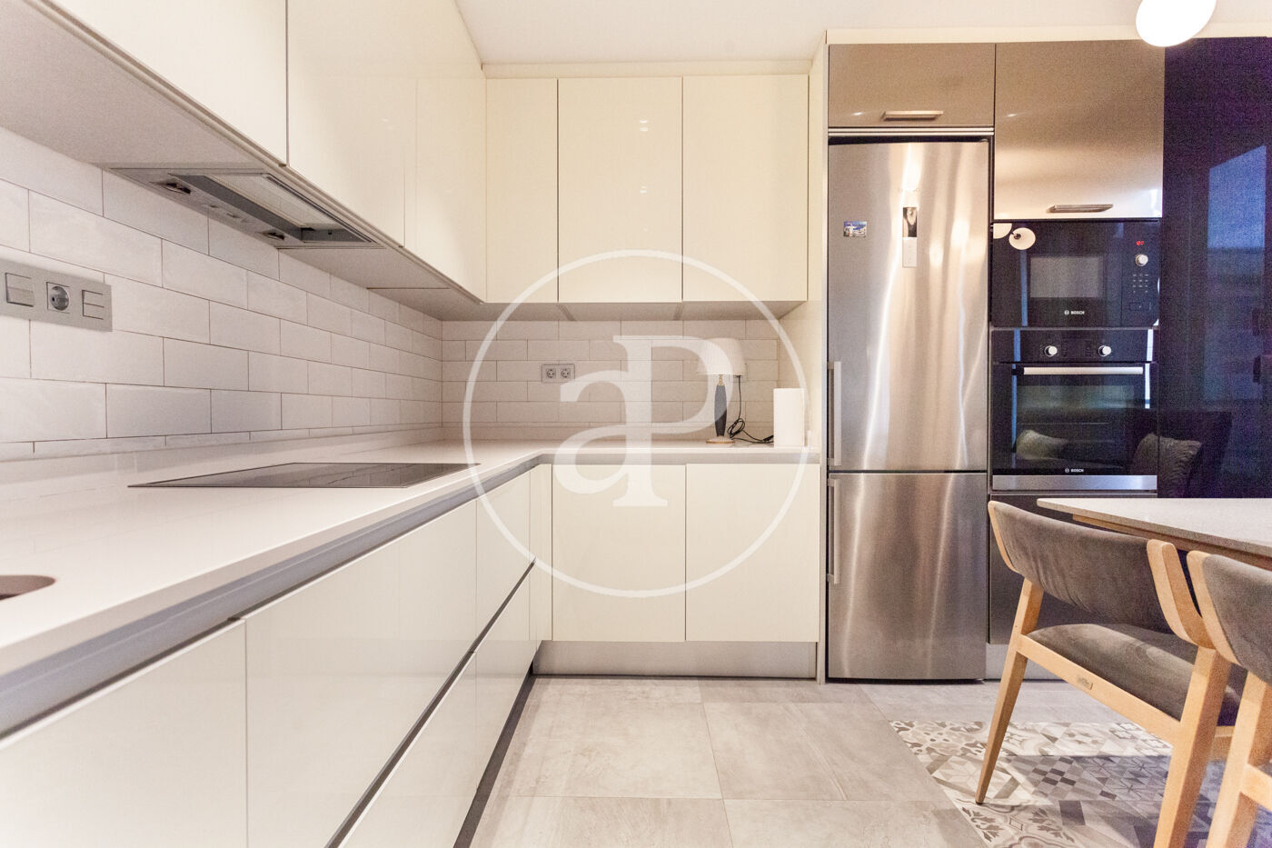The kitchen, with a modern design, is fully equipped with high-end appliances. A large window fills the space with abundant natural light and offers direct views of San Vicente Street, creating the perfect setting to enjoy gastronomy and everyday living.