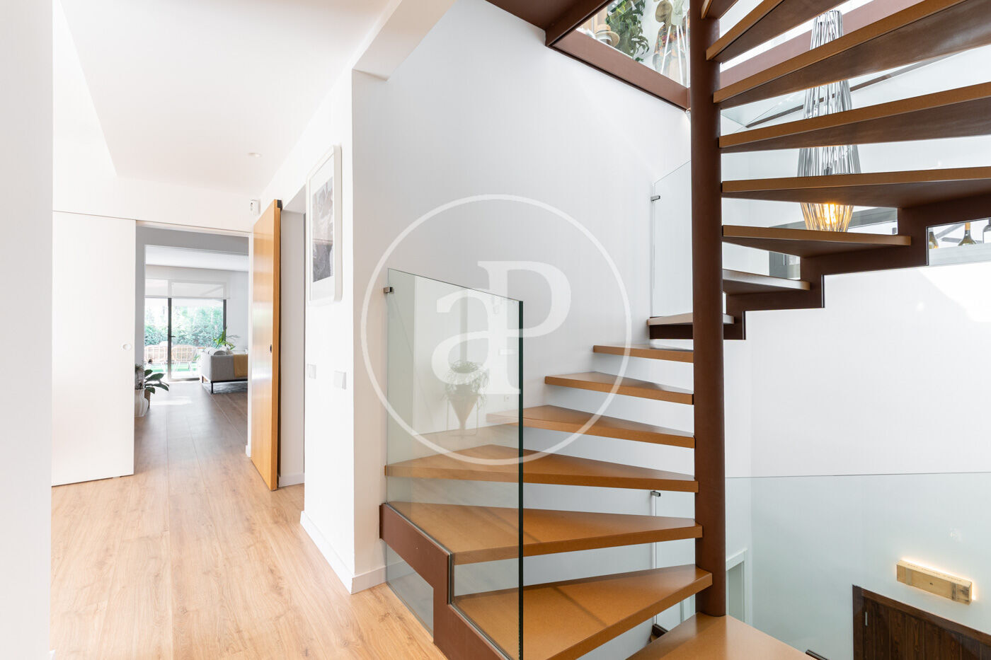 Descending a practical spiral staircase, we access a perfect apartment for guests or family members who wish to have their independence. This space features a fully equipped open kitchen, a double bedroom with access to a terrace, a full bathroom, and a laundry area.