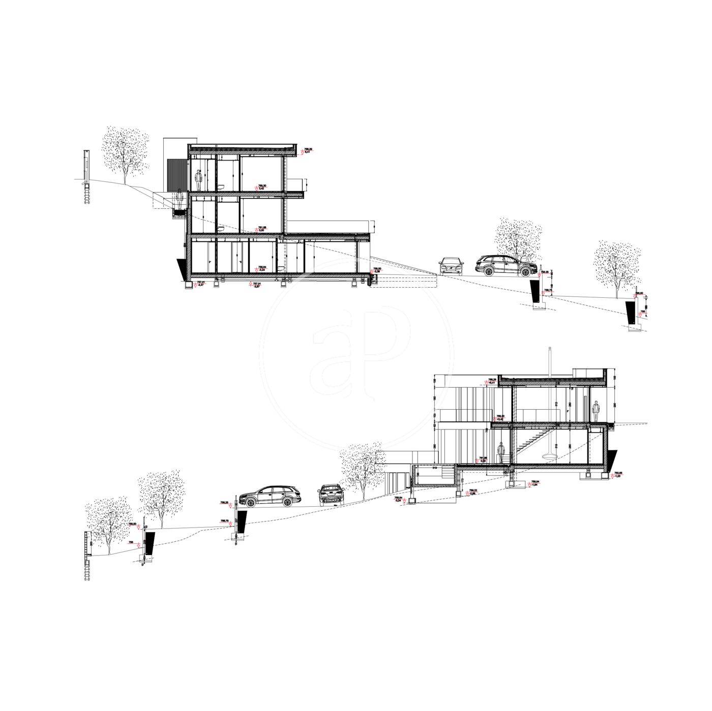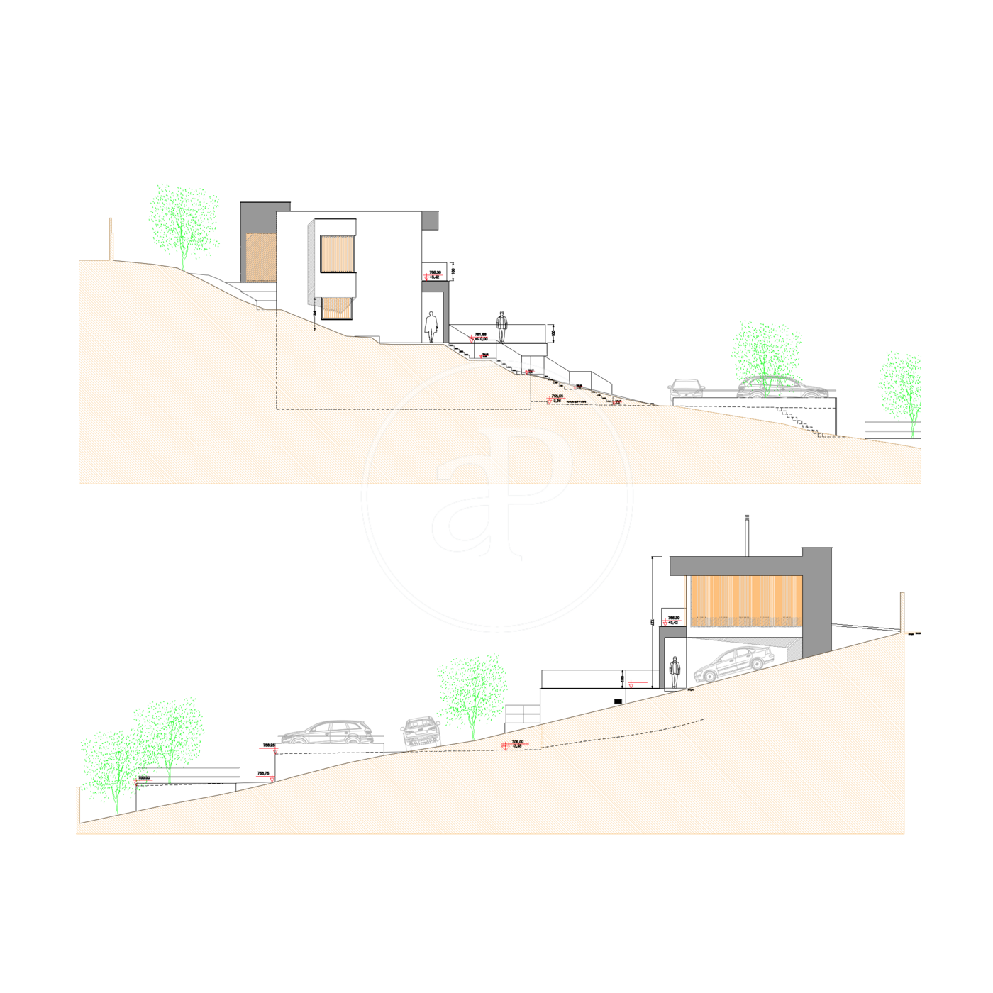 Ground floor as you go down the lift there is a large living room with suspended fireplace, open plan with dining area and kitchen, pantry, utility room, woodshed; on the right wing 2 bedrooms en-suite. This floor has two additional rooms so that you can arrange them according to your habits and tastes.