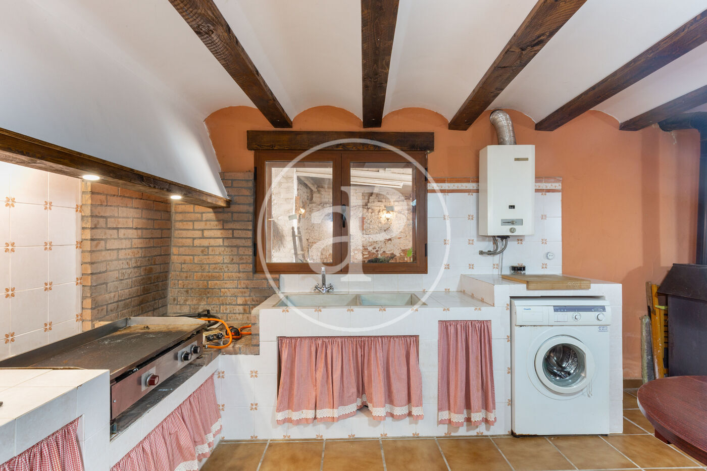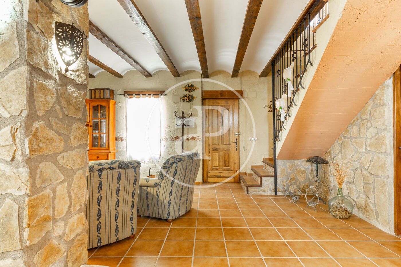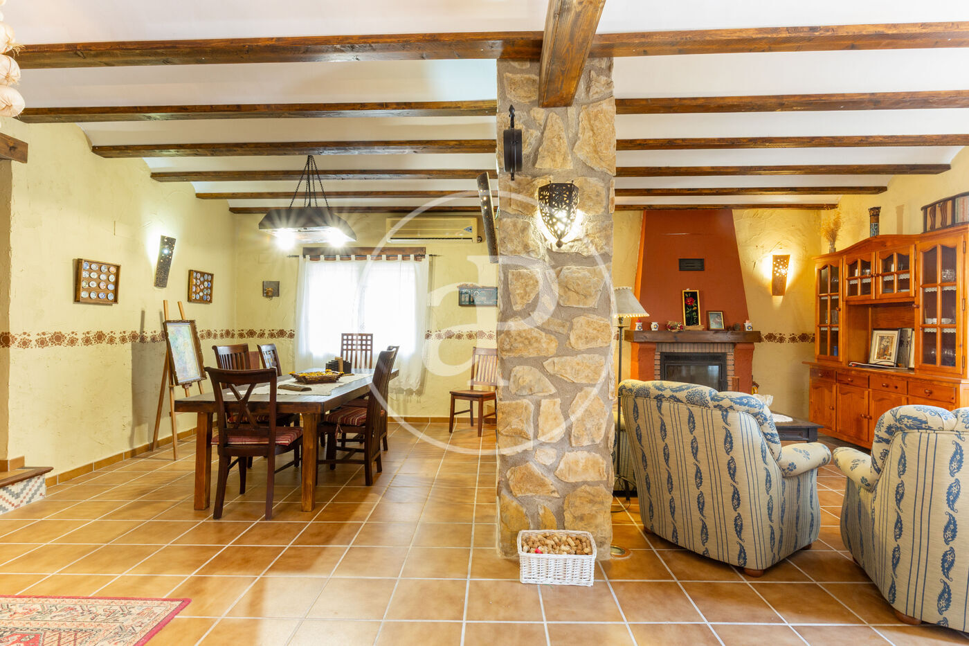 Ground floor with a spacious living-dining room with a cozy fireplace, open to a lovely fully equipped kitchen with a breakfast bar. It also has a bathroom and a bedroom. The stone pillars and wooden beams add warmth and character to the rooms.