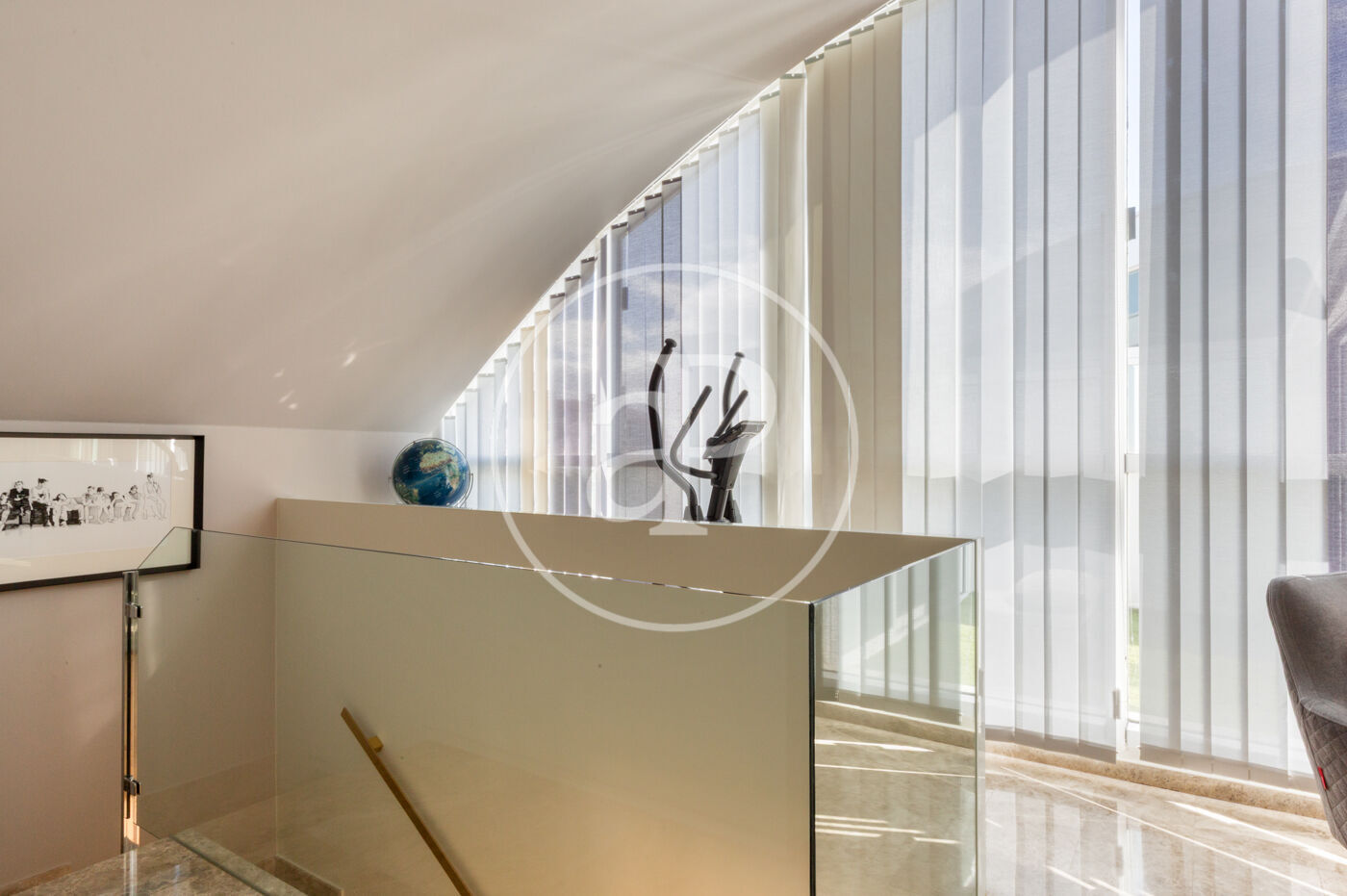 A designer staircase, delicately illuminated with LED lighting, leads to the upper floor, conceived as a highly versatile multi-purpose area. Here we find a large living area, games zone, and office space, as well as an impressive fully fitted walk-in wardrobe, a guest bedroom with a ventilation system, and a complete bathroom. This level extends to a second terrace, divided into two areas: a fully equipped laundry area and a private solarium, ideal for relaxation and outdoor leisure.