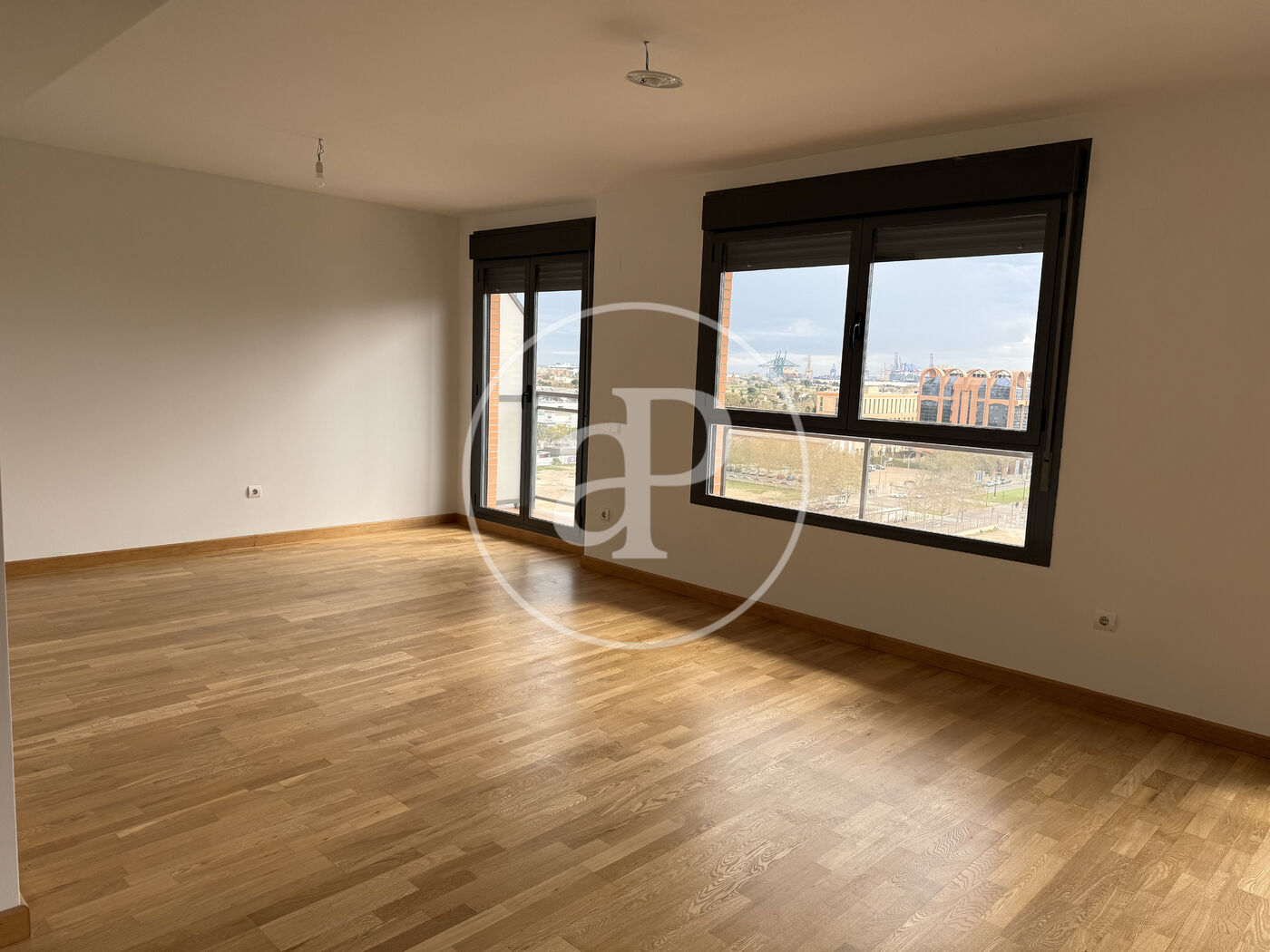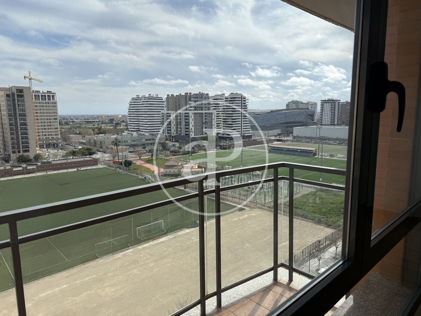 From the ninth floor, there are no buildings in front. The views overlook the surrounding sports areas, with Roig Arena visible in the distance. Main orientation to the east.