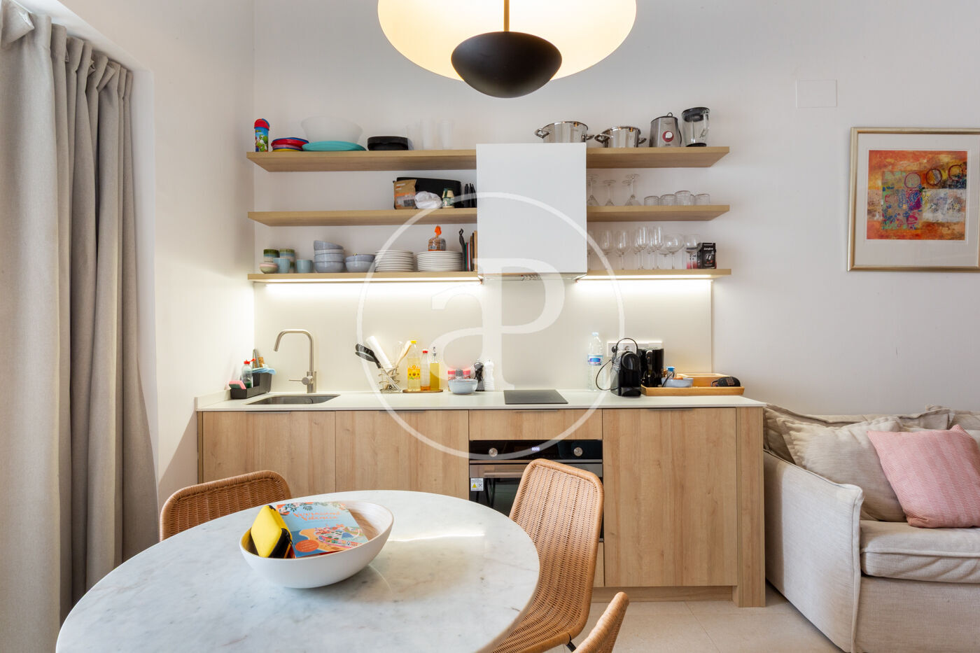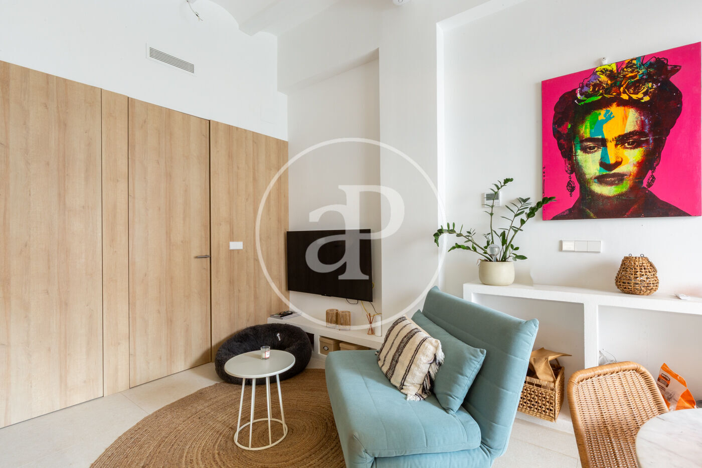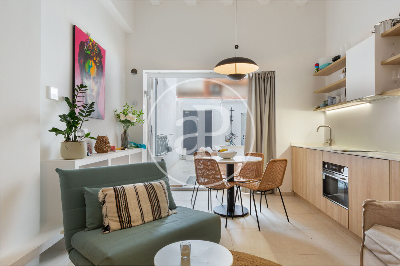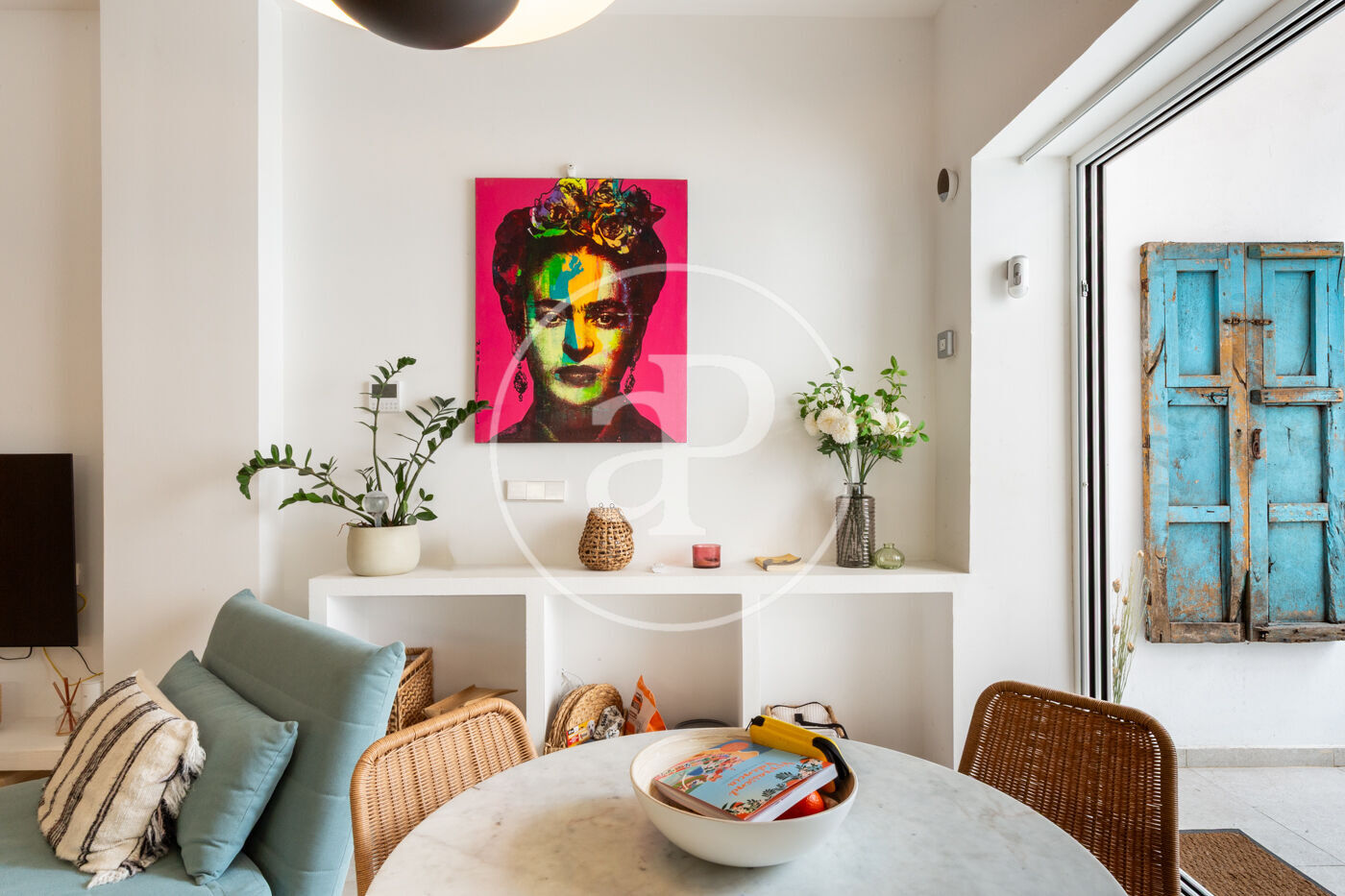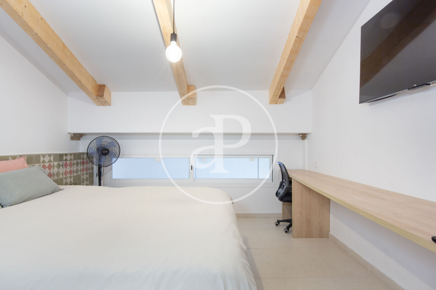 The second apartment, accessed from a parallel street—one of the most representative and lively in Cabanyal—is reached via the traditional staircases characteristic of this historic seaside neighborhood. The property is distributed over two levels. On the main floor, there is a spacious living-dining area with integrated kitchen opening onto a generous terrace, as well as a double bedroom with office area and a full bathroom. Original stairs lead to the upper attic level, where a second large double bedroom is located, offering multiple possible uses and featuring an elegant full wall of built-in wardrobes.